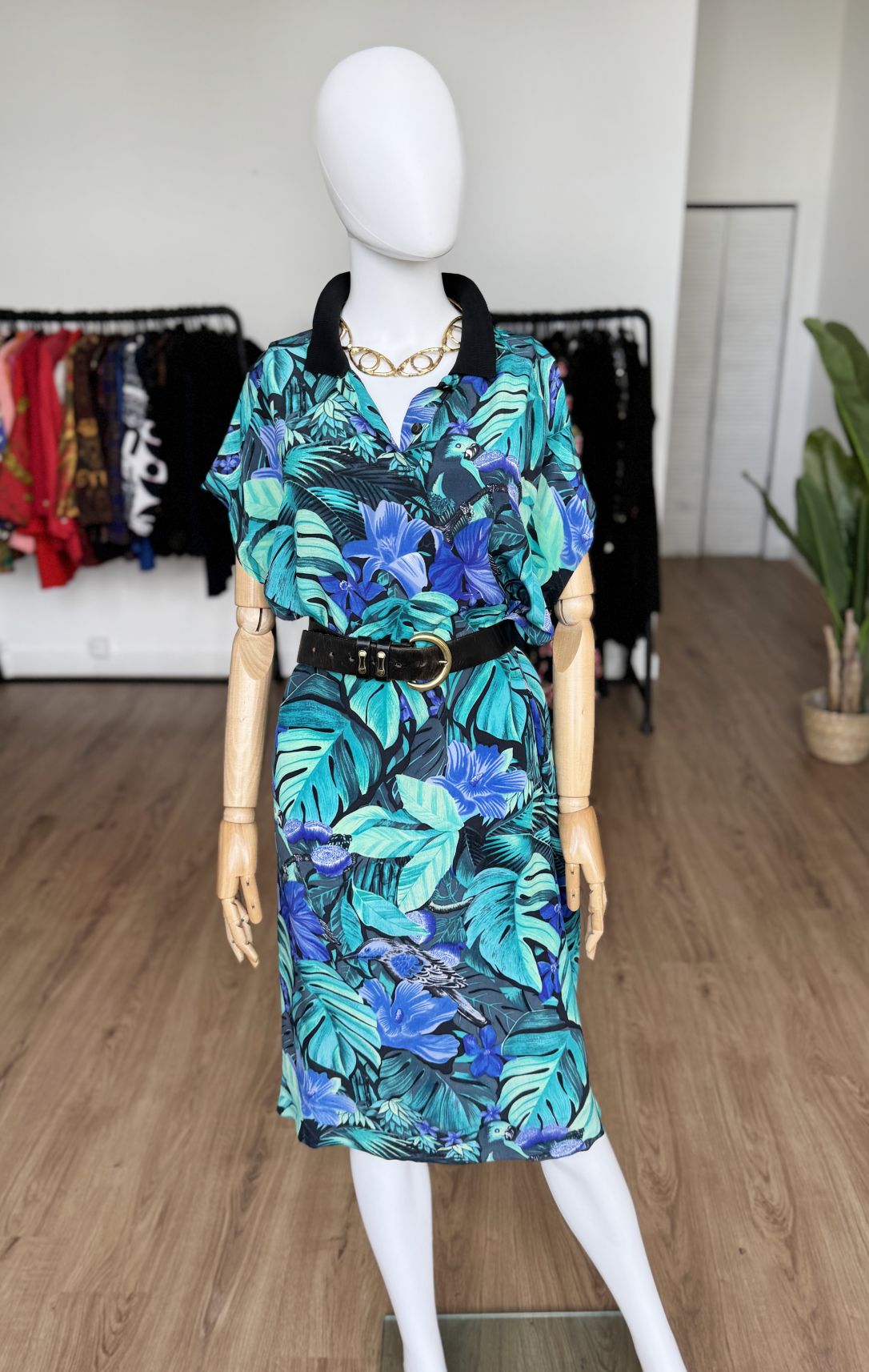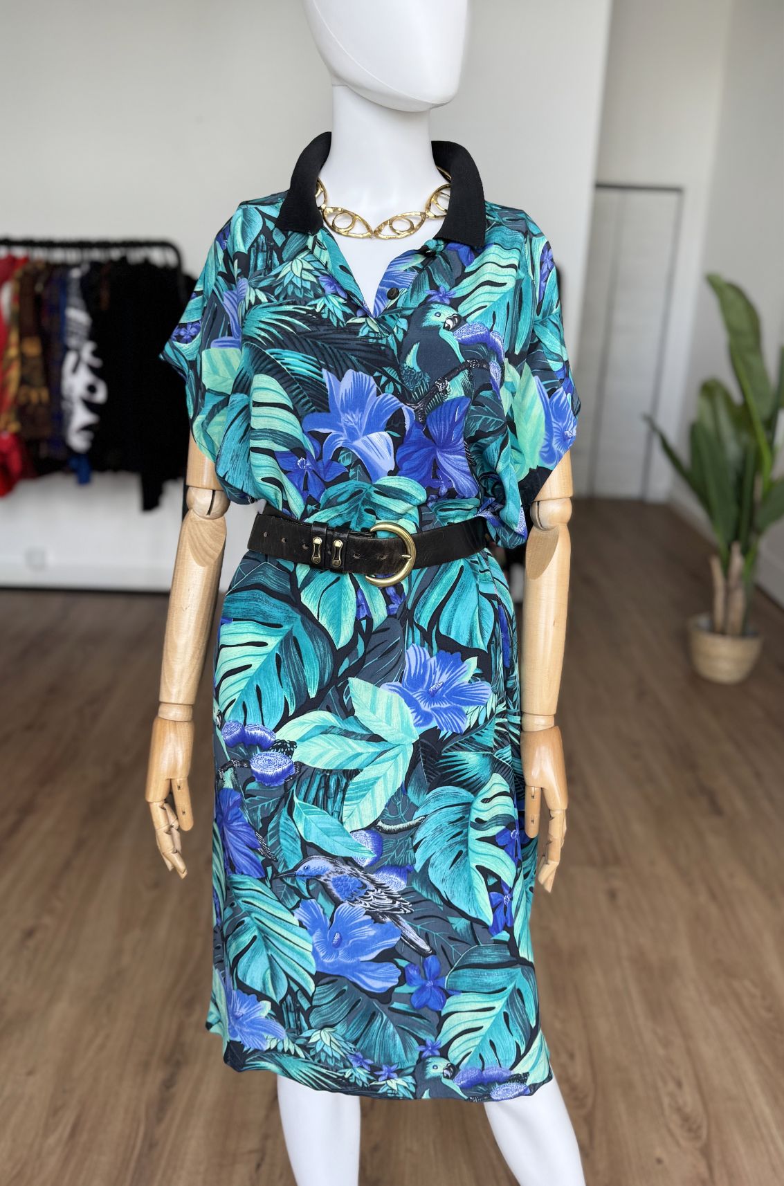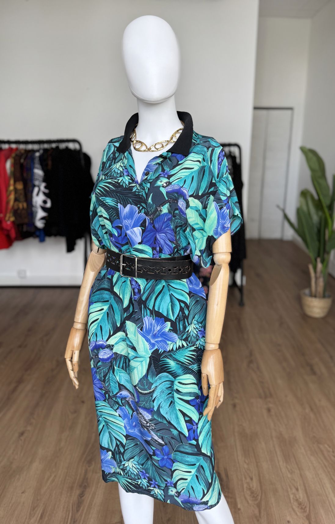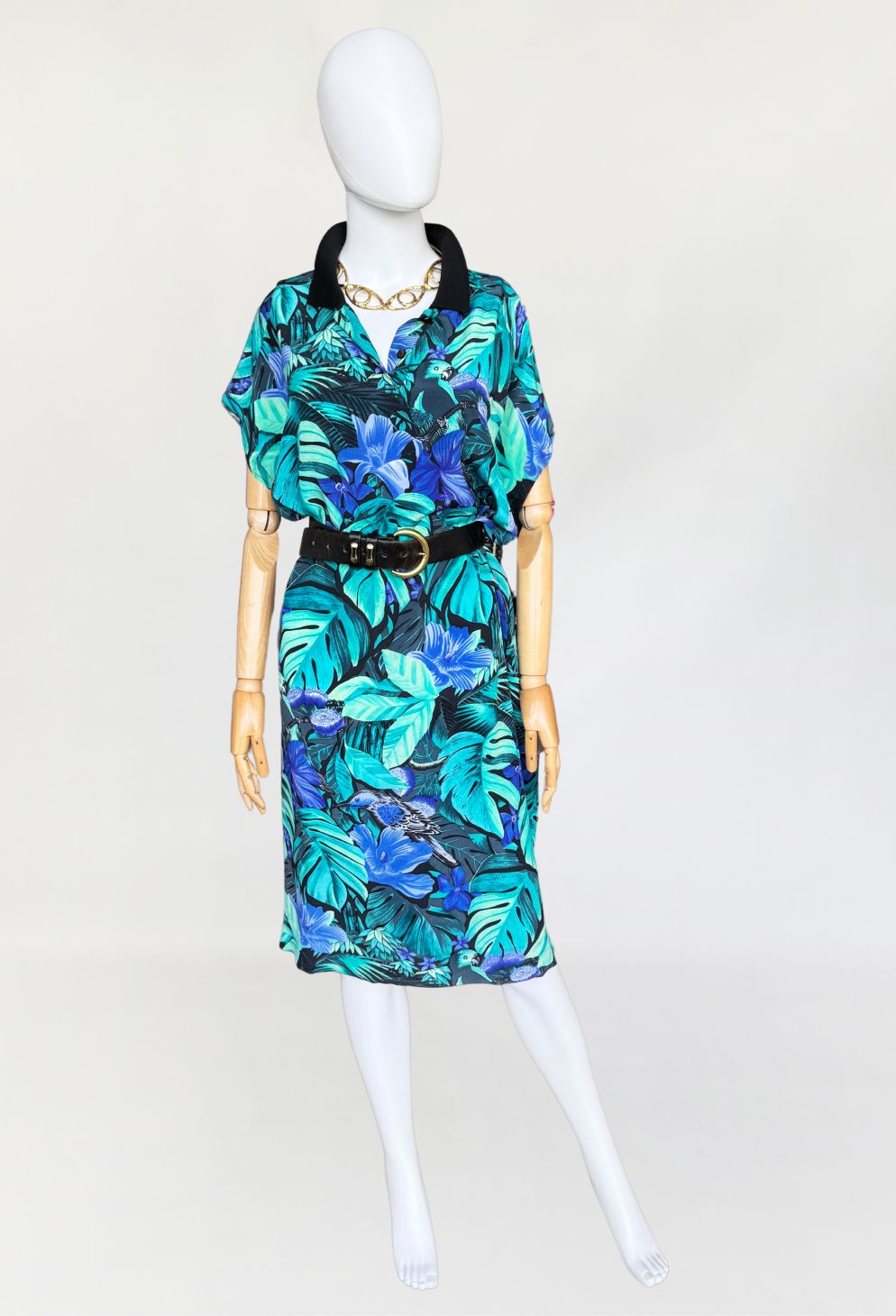 Włoska sukienka vintage z lat 90-tych, uszyta z wiskozowej tkaniny w tropikalny wzór z roślinnością i ptakami, w odcieniach zieleni i niebieskiego. Swobodny oversize fason z krótkimi rękawami. Góra rozpinana, z niewielkim kołnierzem. Idealna na letnie wakacyjne dni, lub jako sukienka plażowa. Pasek nie jest elementem kompletu.