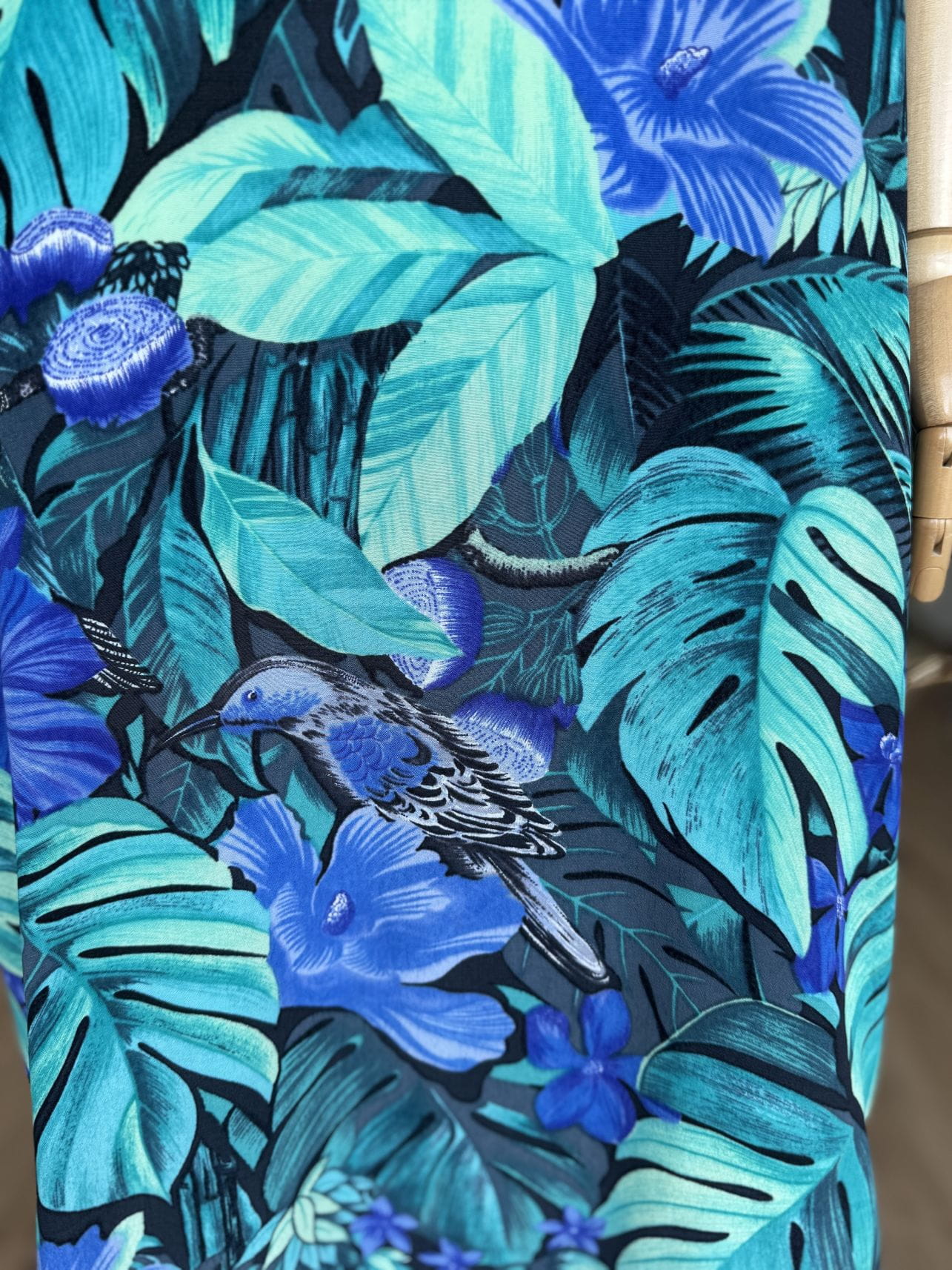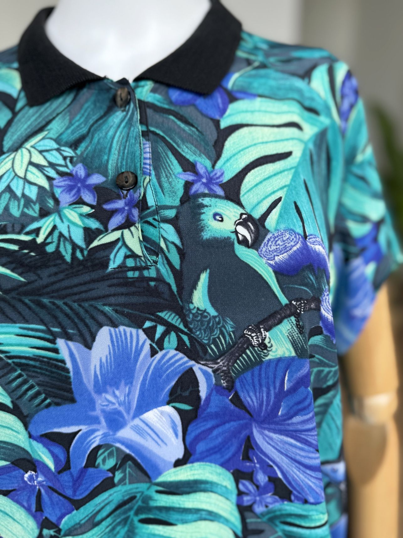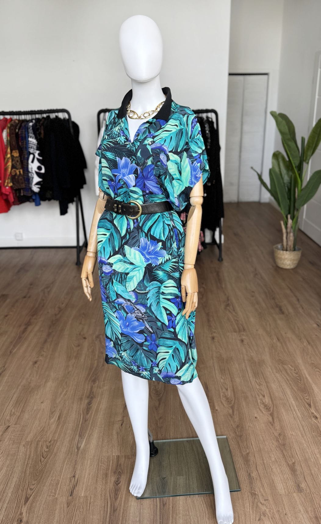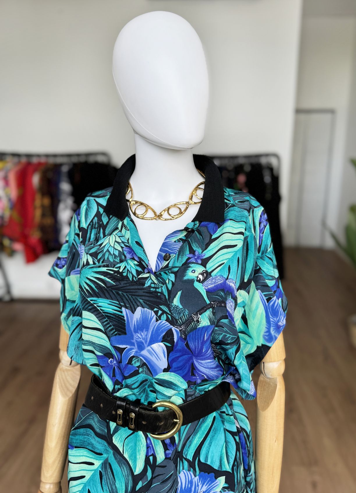 Włoska sukienka vintage z lat 90-tych, uszyta z wiskozowej tkaniny w tropikalny wzór z roślinnością i ptakami, w odcieniach zieleni i niebieskiego. Swobodny oversize fason z krótkimi rękawami. Góra rozpinana, z niewielkim kołnierzem. Idealna na letnie wakacyjne dni, lub jako sukienka plażowa. Pasek nie jest elementem kompletu.
