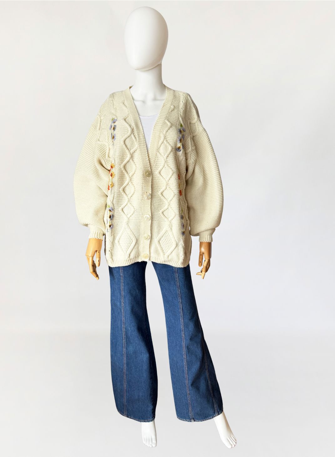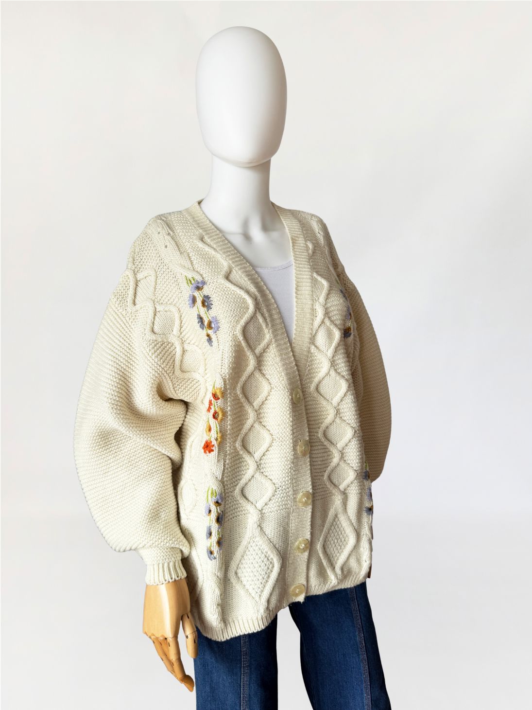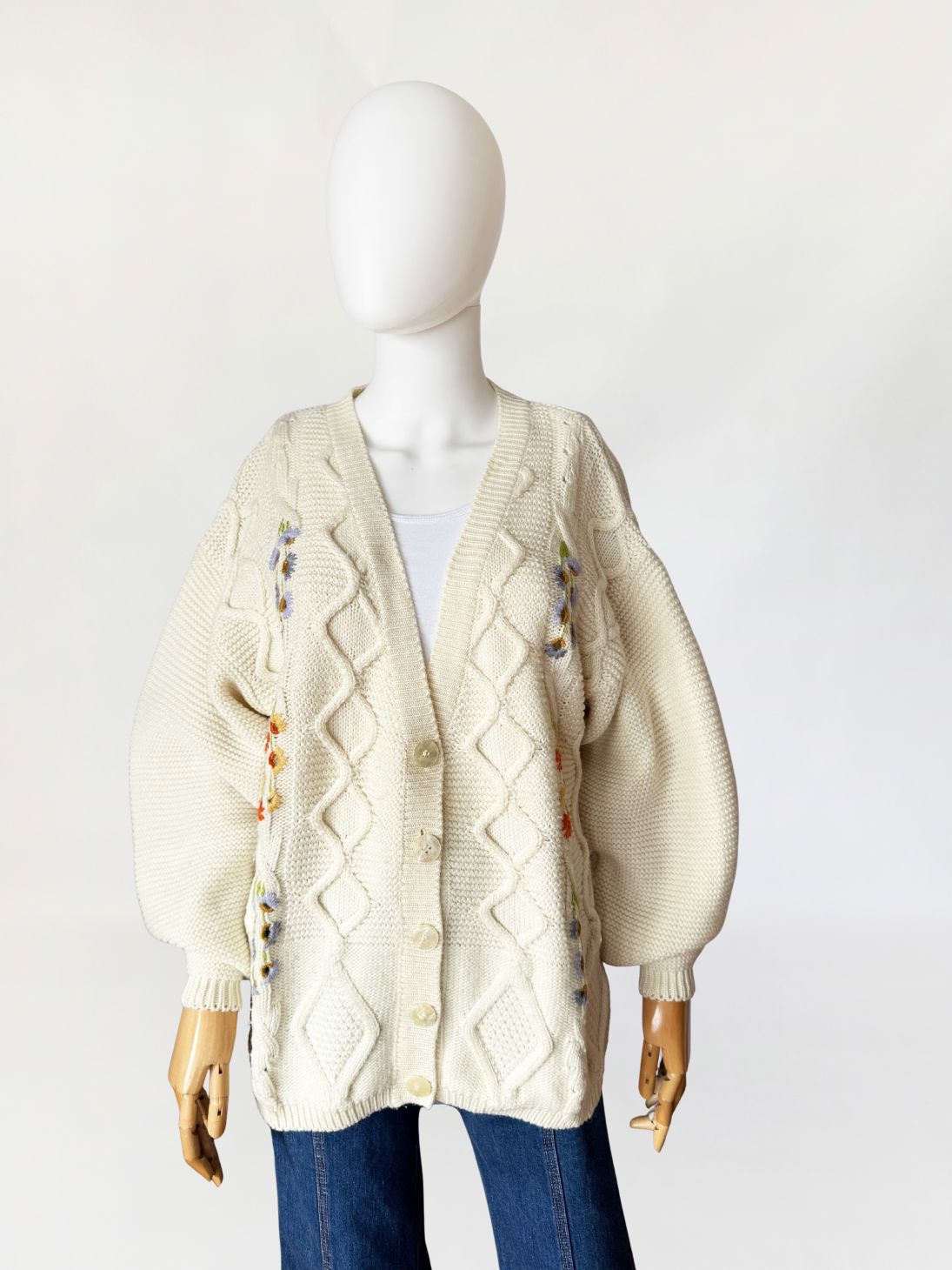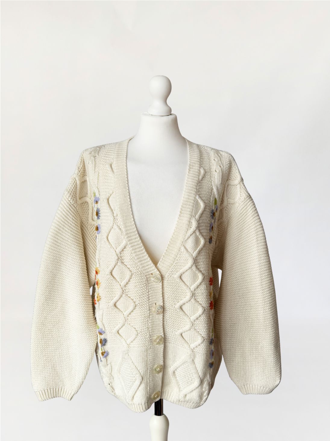 Włoski sweter - kardigan vintage wykonany z grubszej, wełniano - akrylowej włóczki w kolorze kremowym. Front zdobiony drobnymi kolorowymi aplikacjami w kształcie kwiatów. Swobodny dłuższy fason z długimi rękawami.