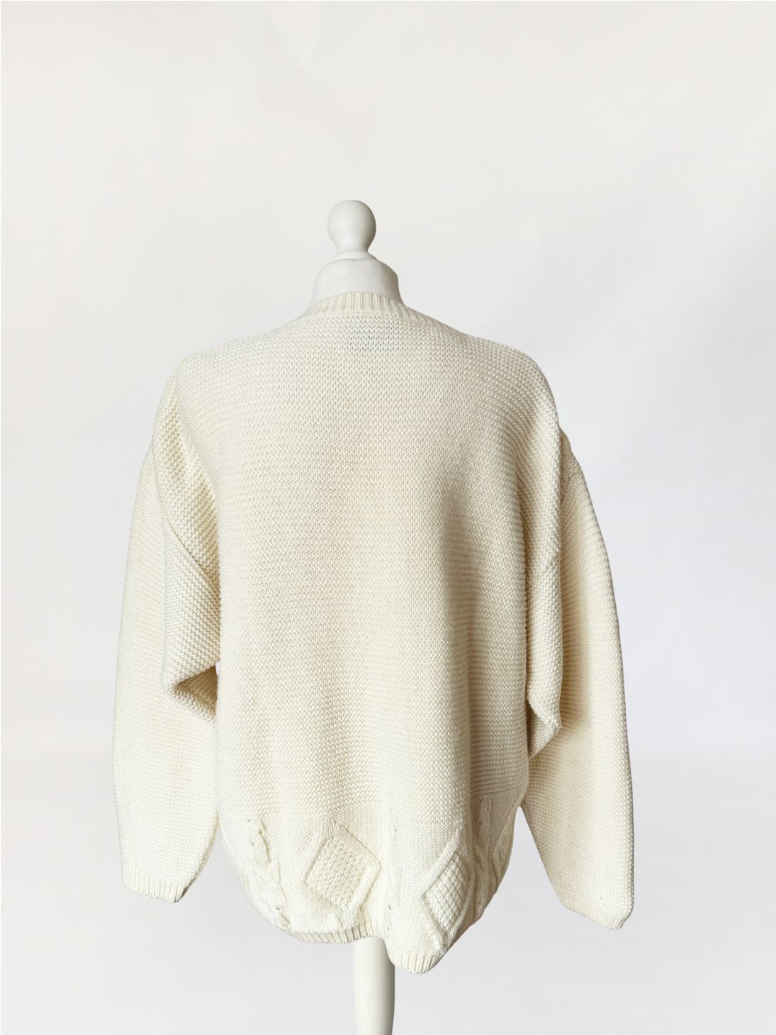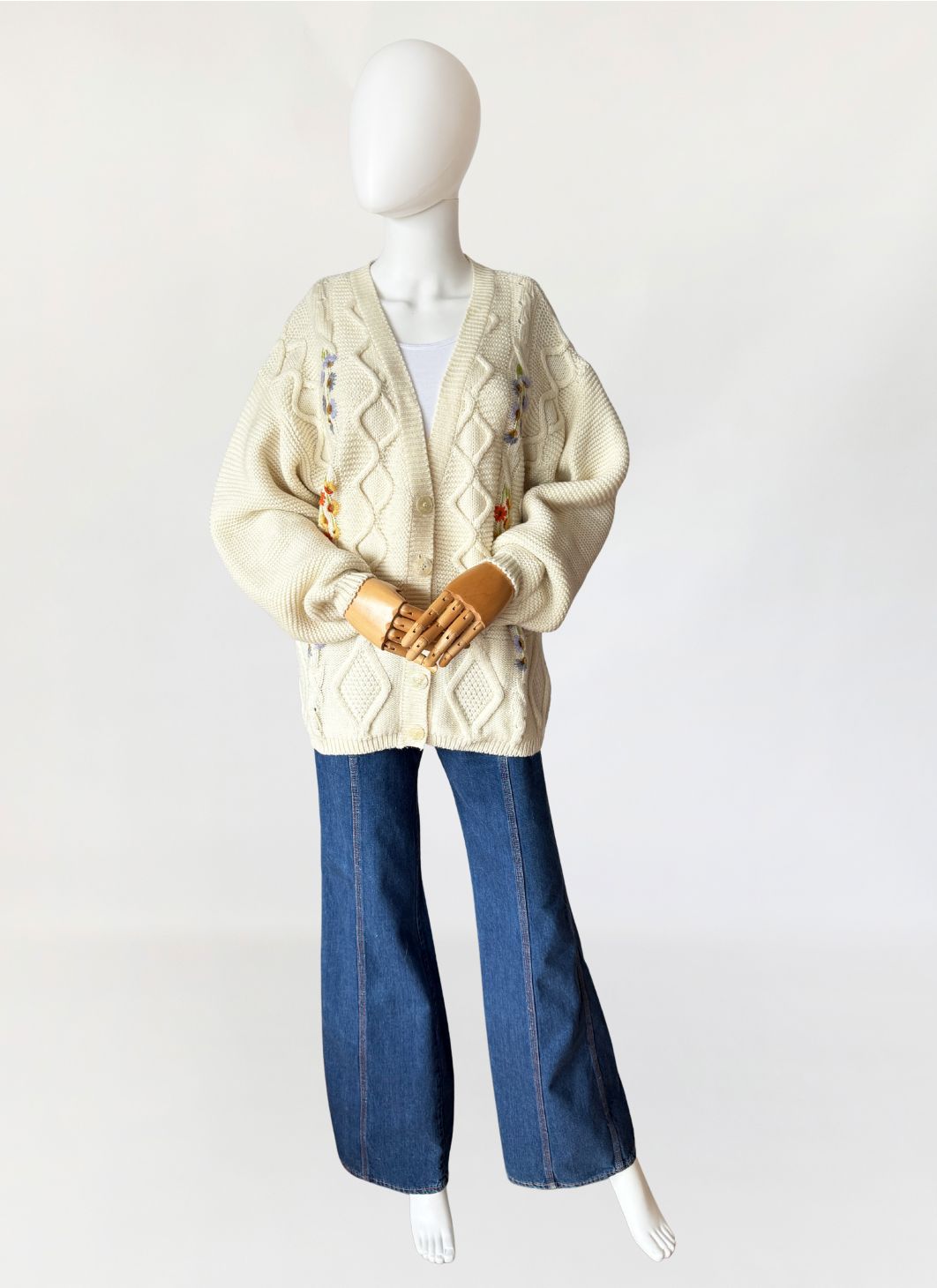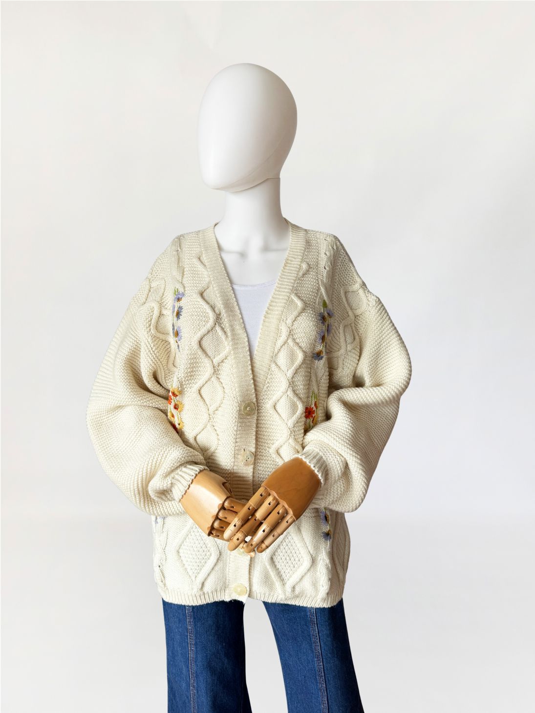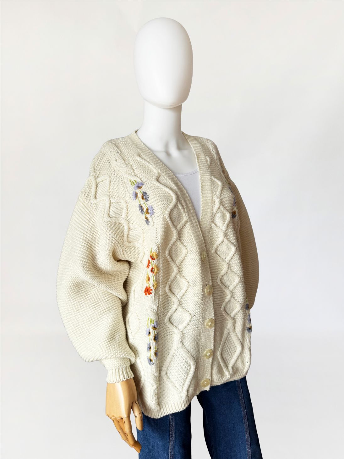Włoski sweter - kardigan vintage wykonany z grubszej, wełniano - akrylowej włóczki w kolorze kremowym. Front zdobiony drobnymi kolorowymi aplikacjami w kształcie kwiatów. Swobodny dłuższy fason z długimi rękawami.