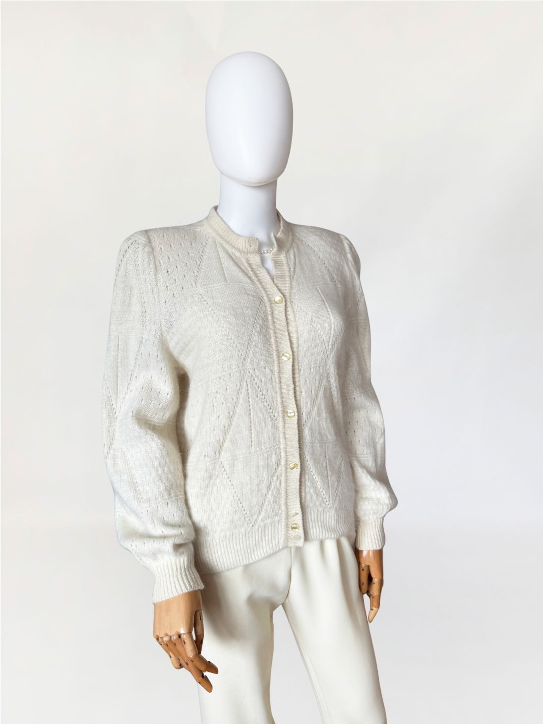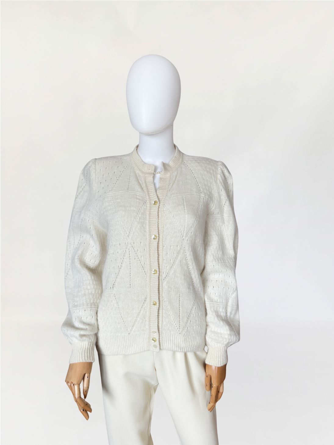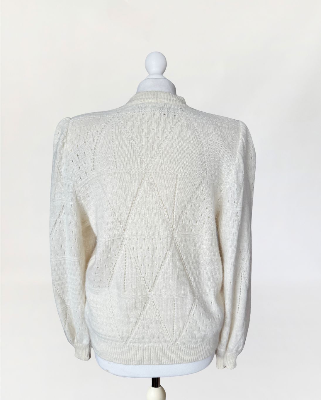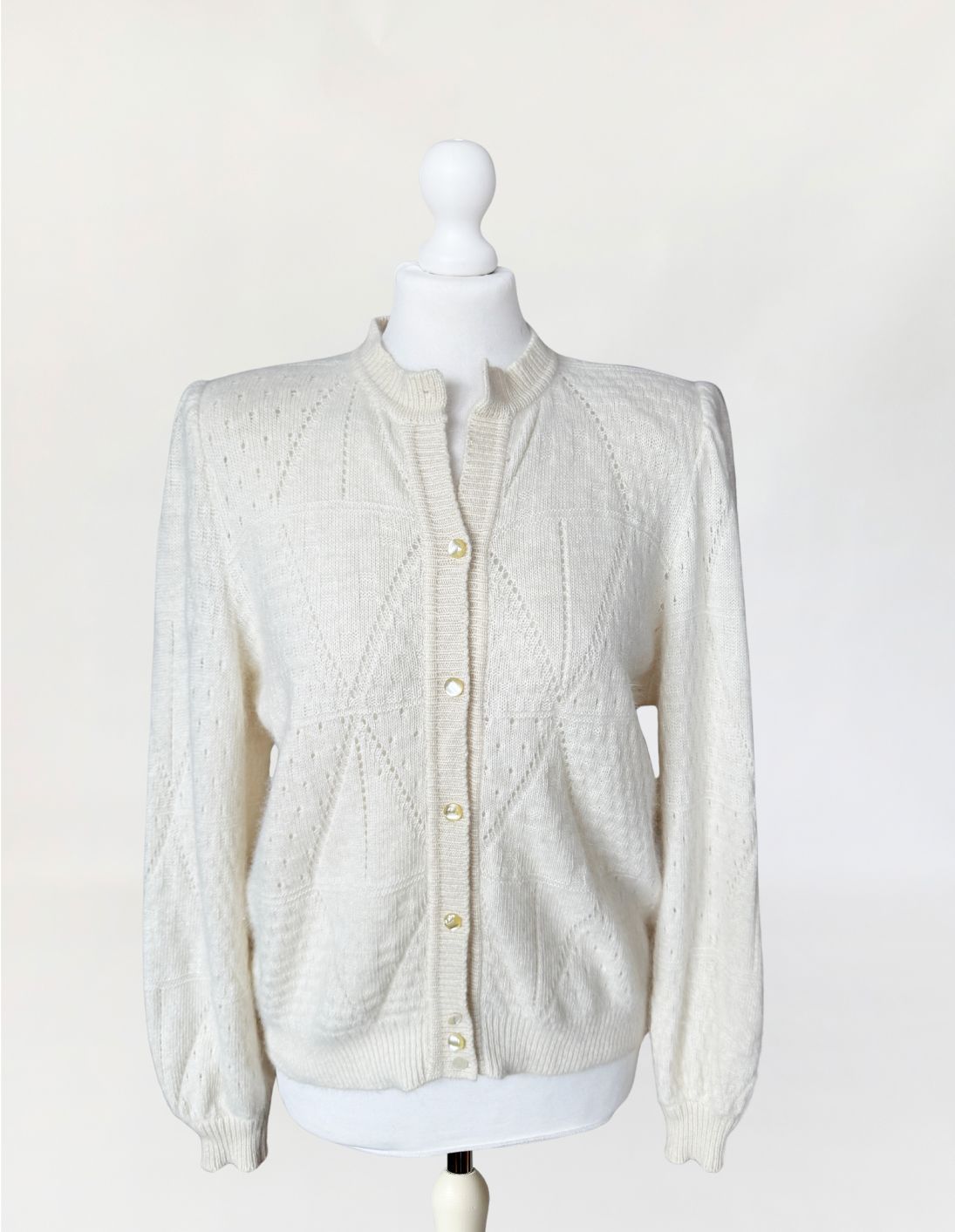 Puszysty, ręcznie robiony kardigan vintage wykonany z luksusowej mieszanki angory i wełny. Na całości dzianiny delikatny ażurowy splot układający się w geometryczny wzór Klasyczny rozpinany fason z długimi rękawami i lekko bufiastymi ramionami.