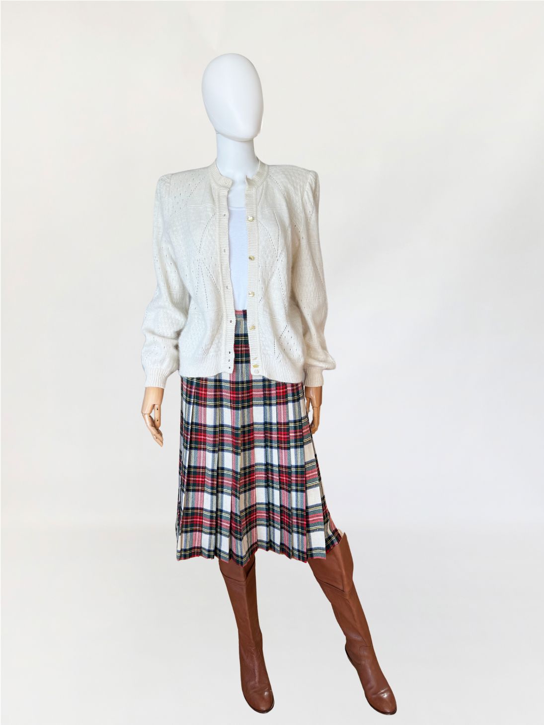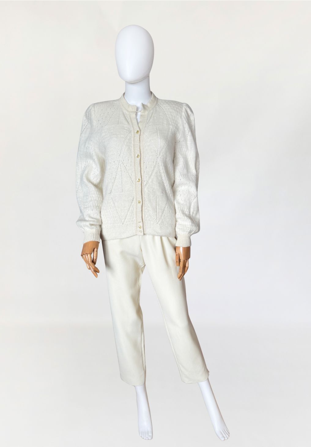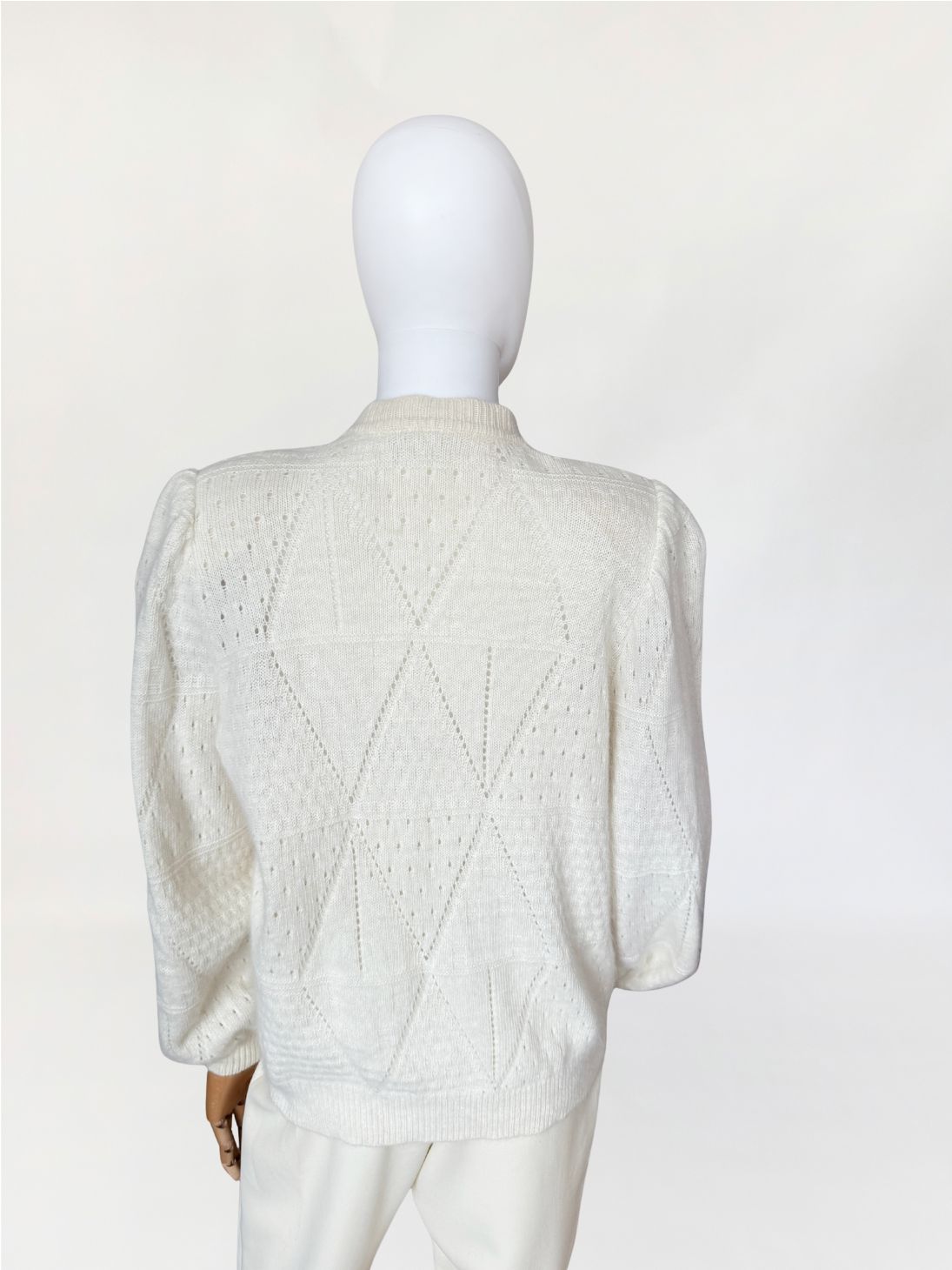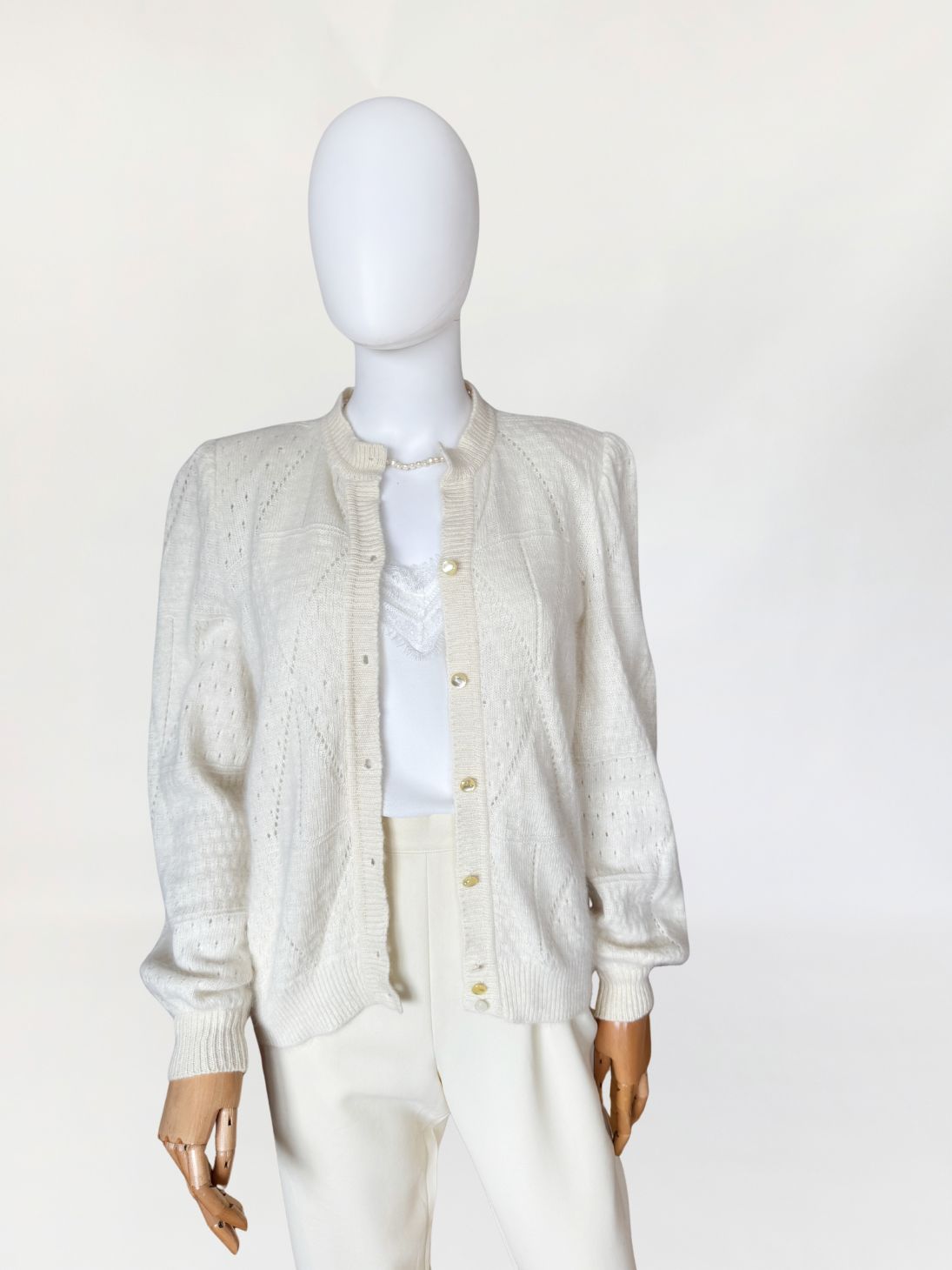 Puszysty, ręcznie robiony kardigan vintage wykonany z luksusowej mieszanki angory i wełny. Na całości dzianiny delikatny ażurowy splot układający się w geometryczny wzór Klasyczny rozpinany fason z długimi rękawami i lekko bufiastymi ramionami.