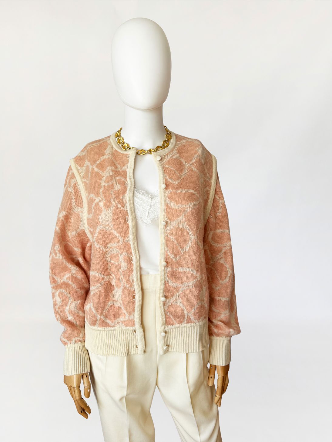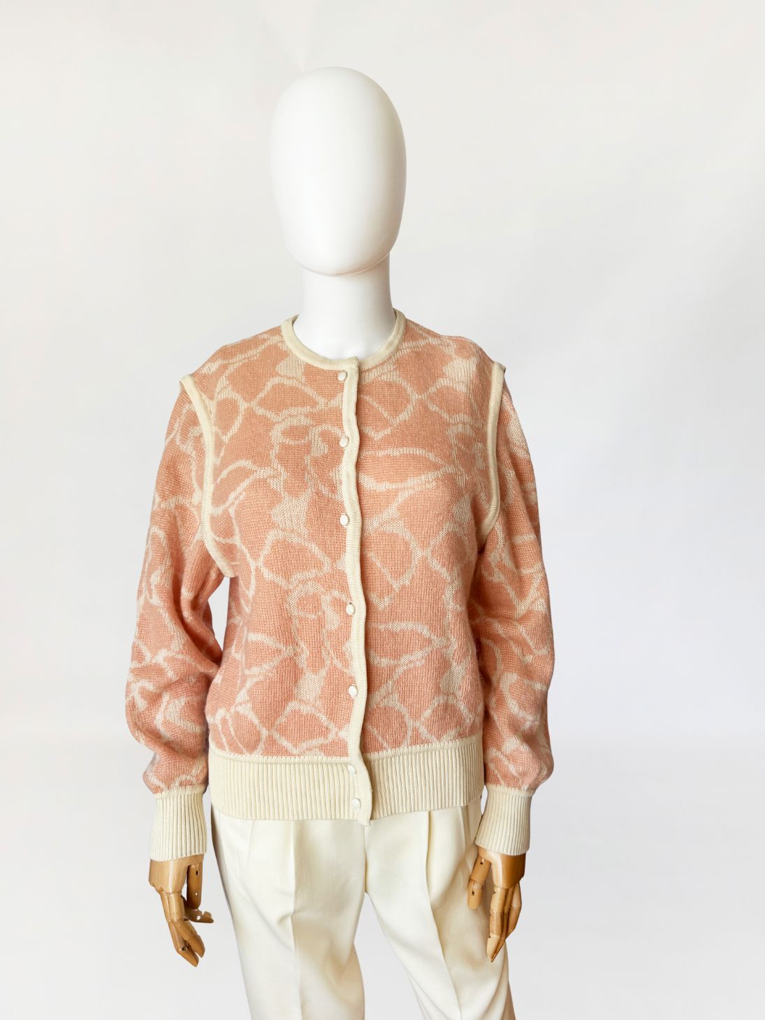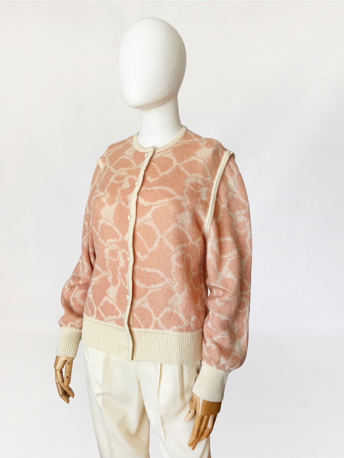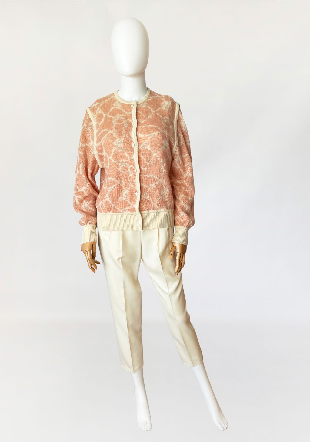 Włoski kardigan vintage w odcieniu łososiowym, wykonany z mieszanki wełny i moheru. Miękki, lekki, a jednocześnie ciepły. Klasyczny krój na guziki, zakończony szerokimi, prążkowanymi ściągaczami przy rękawach i u dołu. Wzór abstrakcyjnych kształtów w tonacji kremowo–łososiowej.