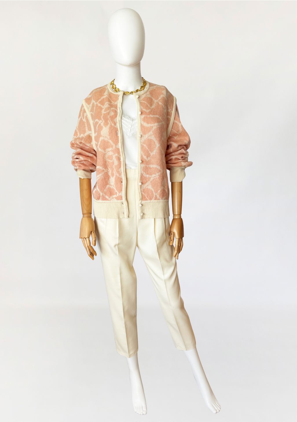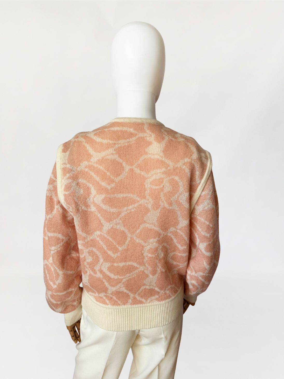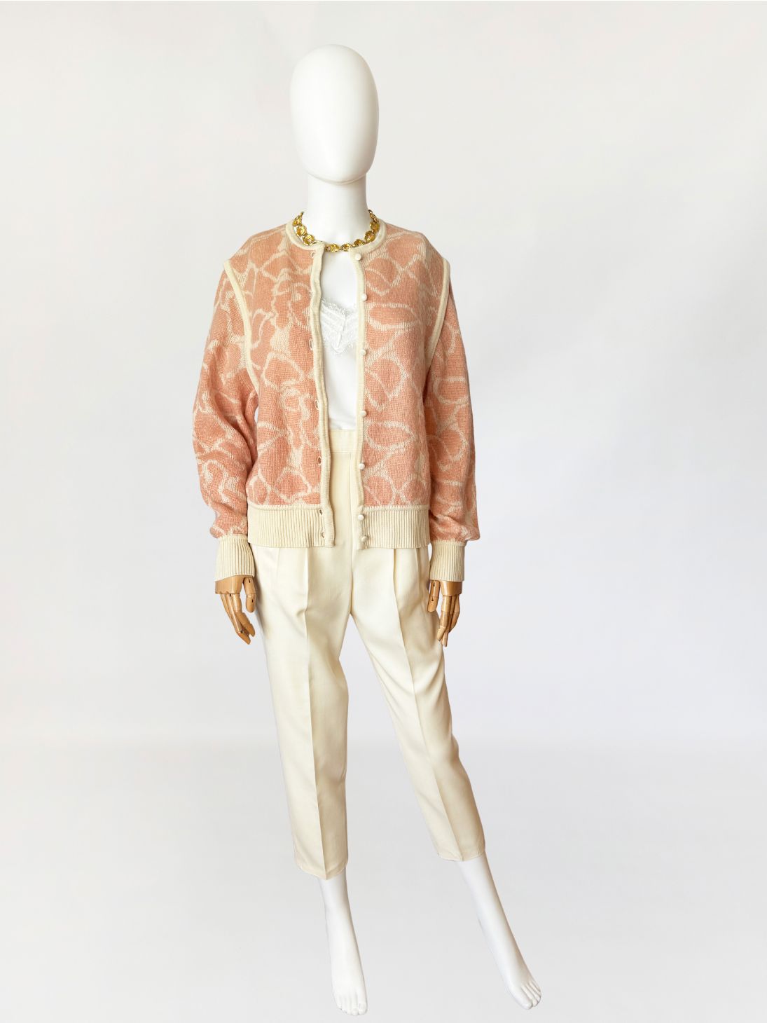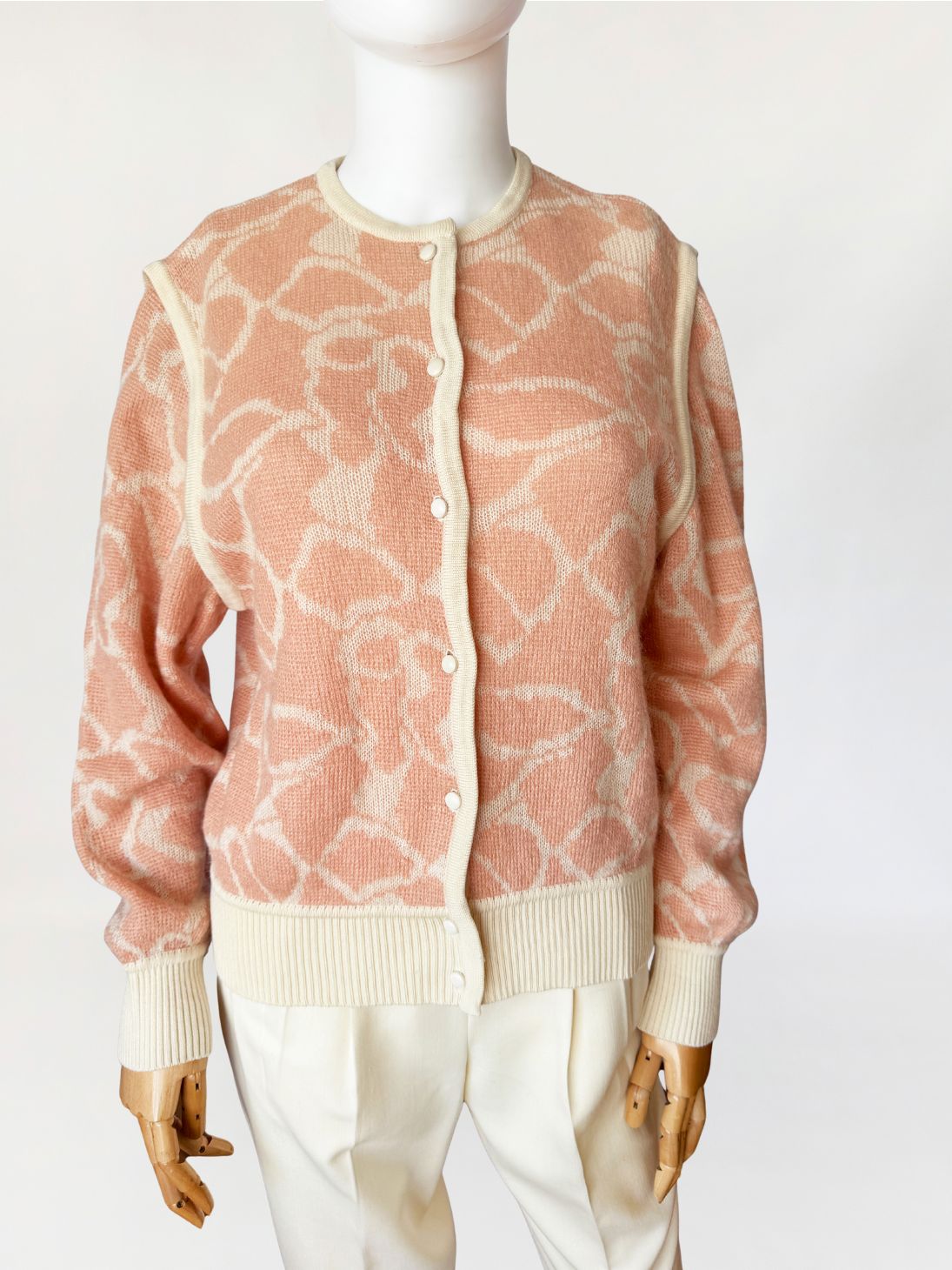 Włoski kardigan vintage w odcieniu łososiowym, wykonany z mieszanki wełny i moheru. Miękki, lekki, a jednocześnie ciepły. Klasyczny krój na guziki, zakończony szerokimi, prążkowanymi ściągaczami przy rękawach i u dołu. Wzór abstrakcyjnych kształtów w tonacji kremowo–łososiowej.