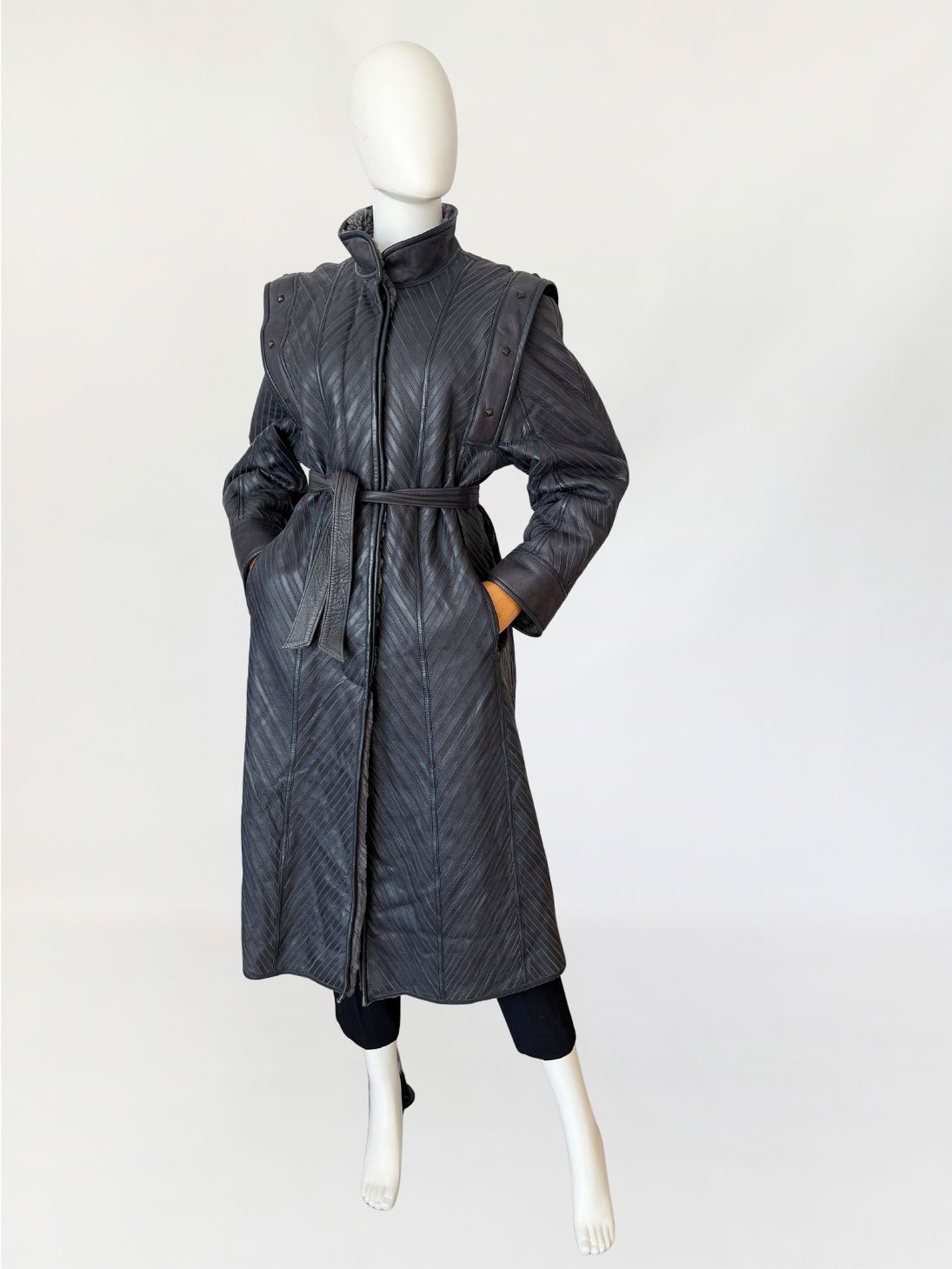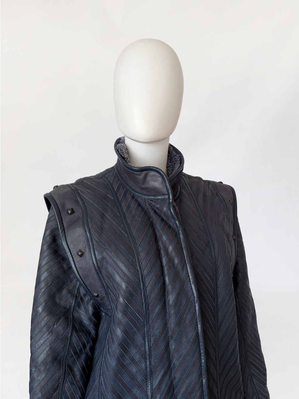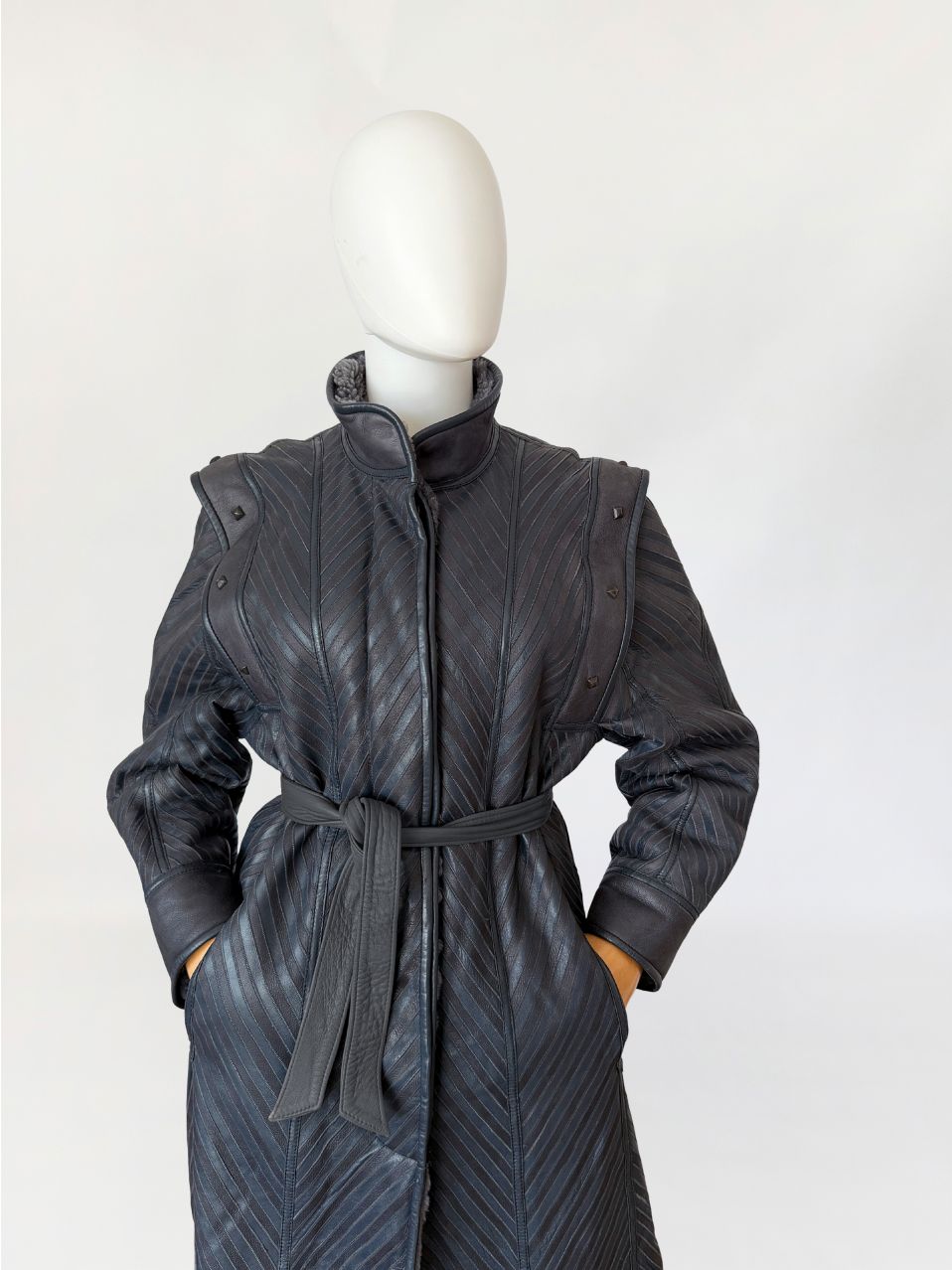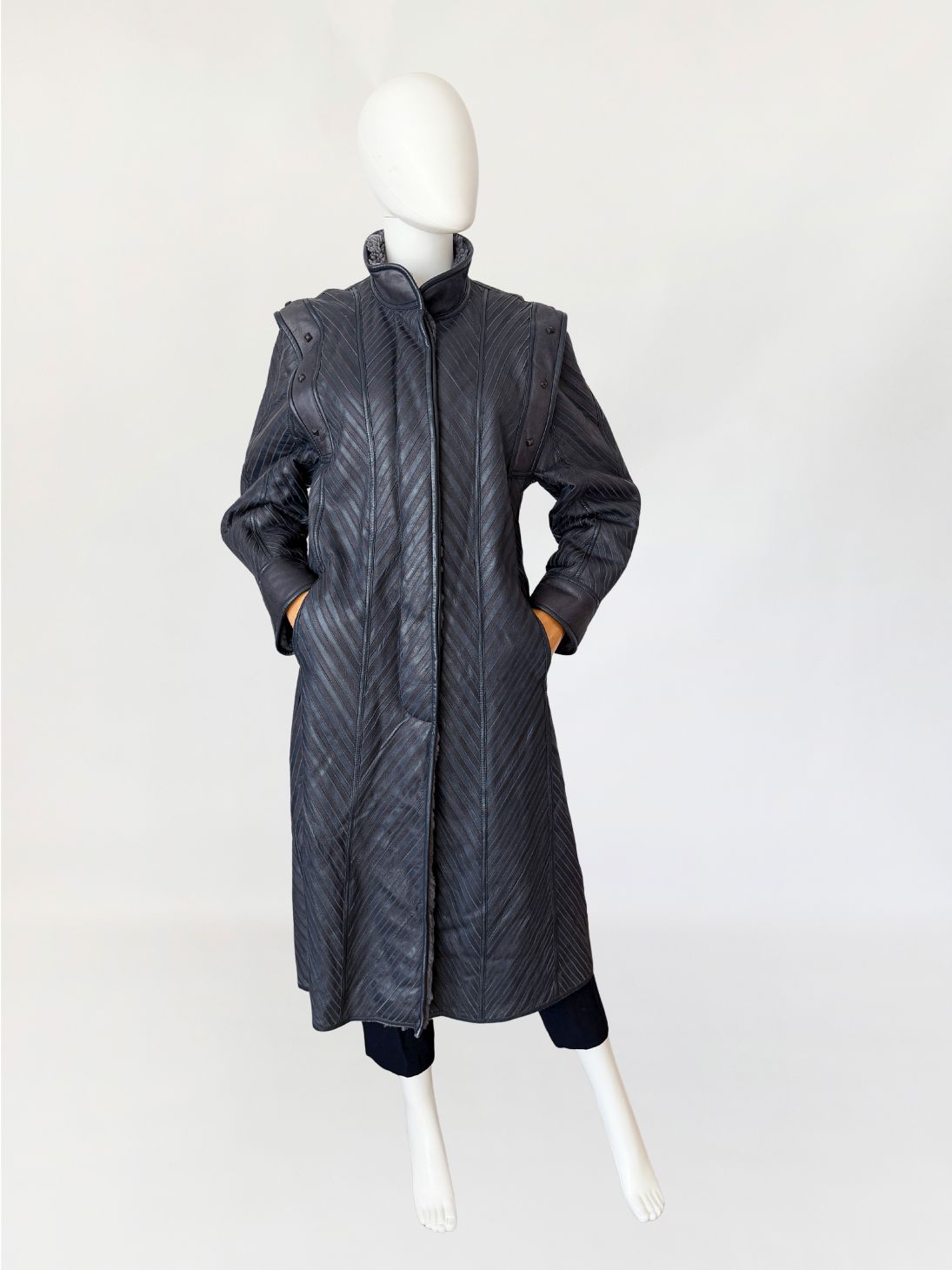 Unikatowy włoski płaszcz vintage wykonany ze skóry naturalnej w odcieniu grafitowo-szarym, o powierzchni zestawionej z paneli układanych skośnie, tworzących wyraźny, kierunkowy rysunek. Fason o wydłużonej linii, lekko rozszerzany ku dołowi. Zapięcie centralne kryte. Kołnierz typu stójka, wykonany z gładkiej skóry. Linia ramion podkreślona dodatkowymi nakładanymi panelami z grubszej skóry, zdobionymi metalowymi nitami o geometrycznym kształcie. Rękawy proste, zakończone szerokimi mankietami z gładkiej skóry. Na wysokości bioder wpuszczane kieszenie boczne. Tył z konstrukcyjnym układem paneli zbiegających się w kształt litery V, podkreślającym linię pleców. Wnętrze wykończone miękkim sztucznym futrem w odcieniu szarości.