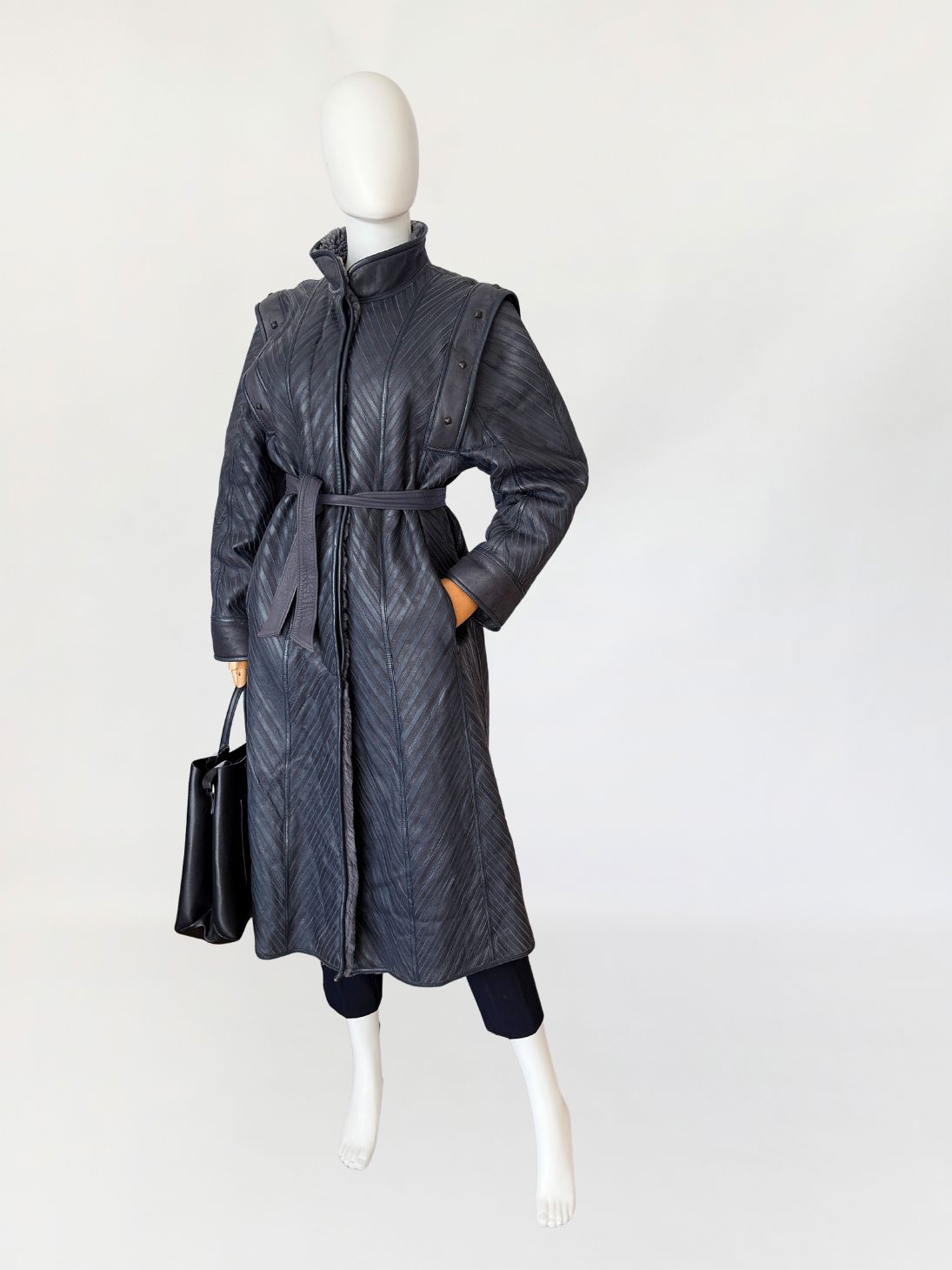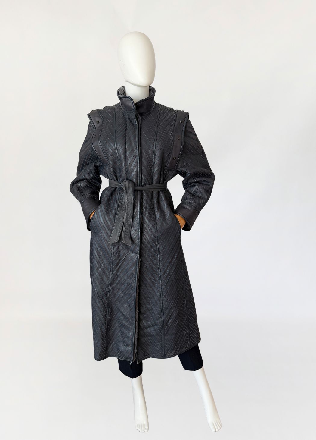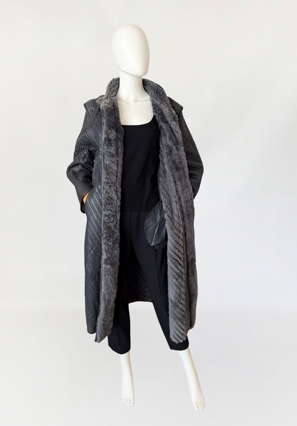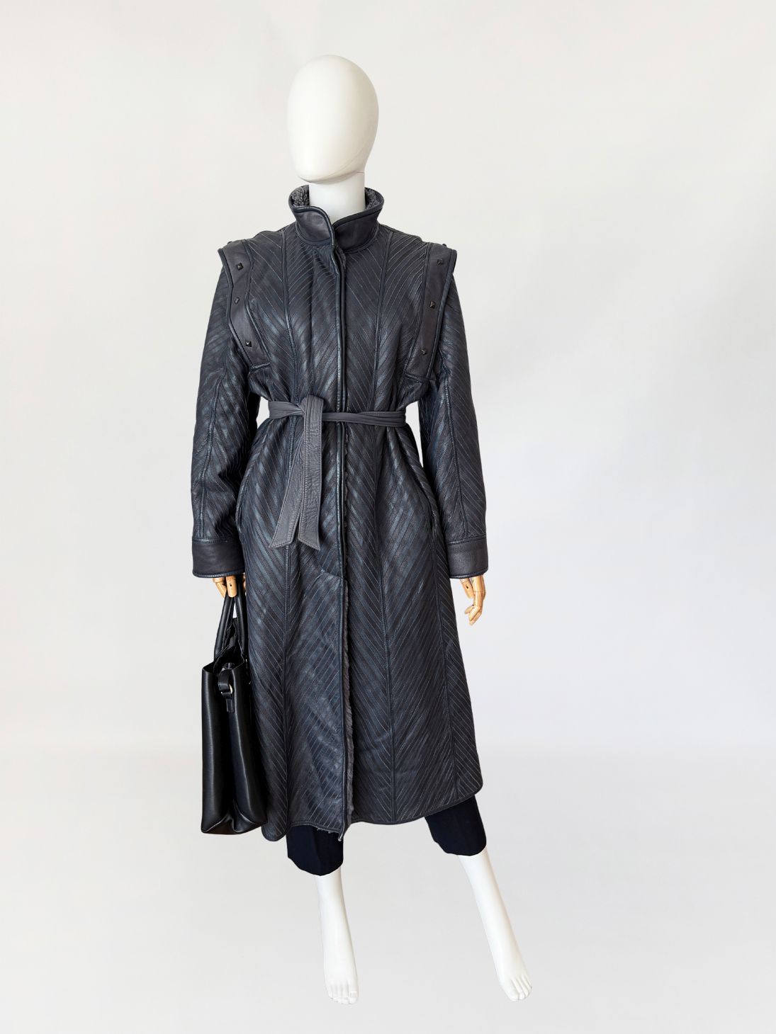 Unikatowy włoski płaszcz vintage wykonany ze skóry naturalnej w odcieniu grafitowo-szarym, o powierzchni zestawionej z paneli układanych skośnie, tworzących wyraźny, kierunkowy rysunek. Fason o wydłużonej linii, lekko rozszerzany ku dołowi. Zapięcie centralne kryte. Kołnierz typu stójka, wykonany z gładkiej skóry. Linia ramion podkreślona dodatkowymi nakładanymi panelami z grubszej skóry, zdobionymi metalowymi nitami o geometrycznym kształcie. Rękawy proste, zakończone szerokimi mankietami z gładkiej skóry. Na wysokości bioder wpuszczane kieszenie boczne. Tył z konstrukcyjnym układem paneli zbiegających się w kształt litery V, podkreślającym linię pleców. Wnętrze wykończone miękkim sztucznym futrem w odcieniu szarości.