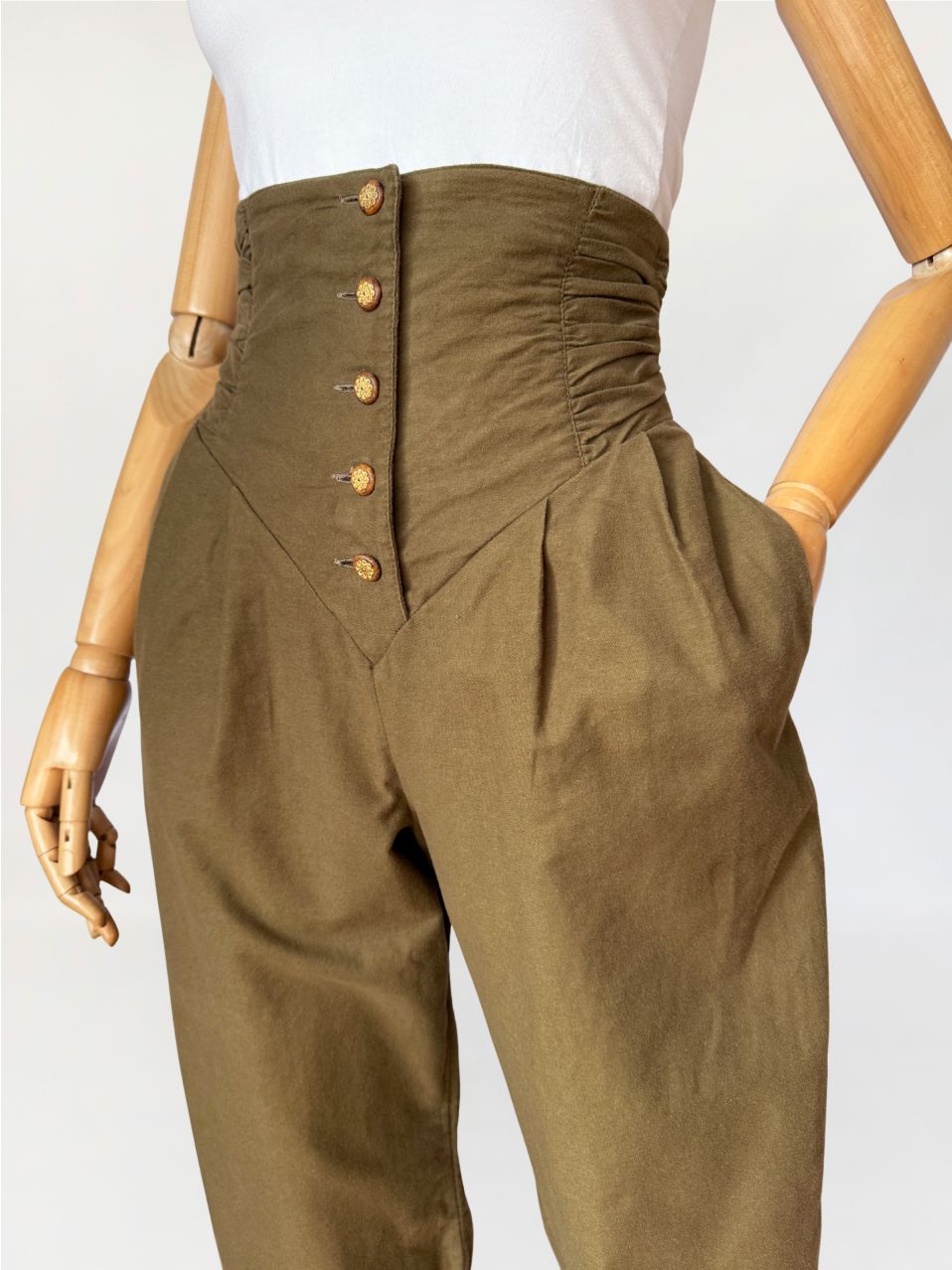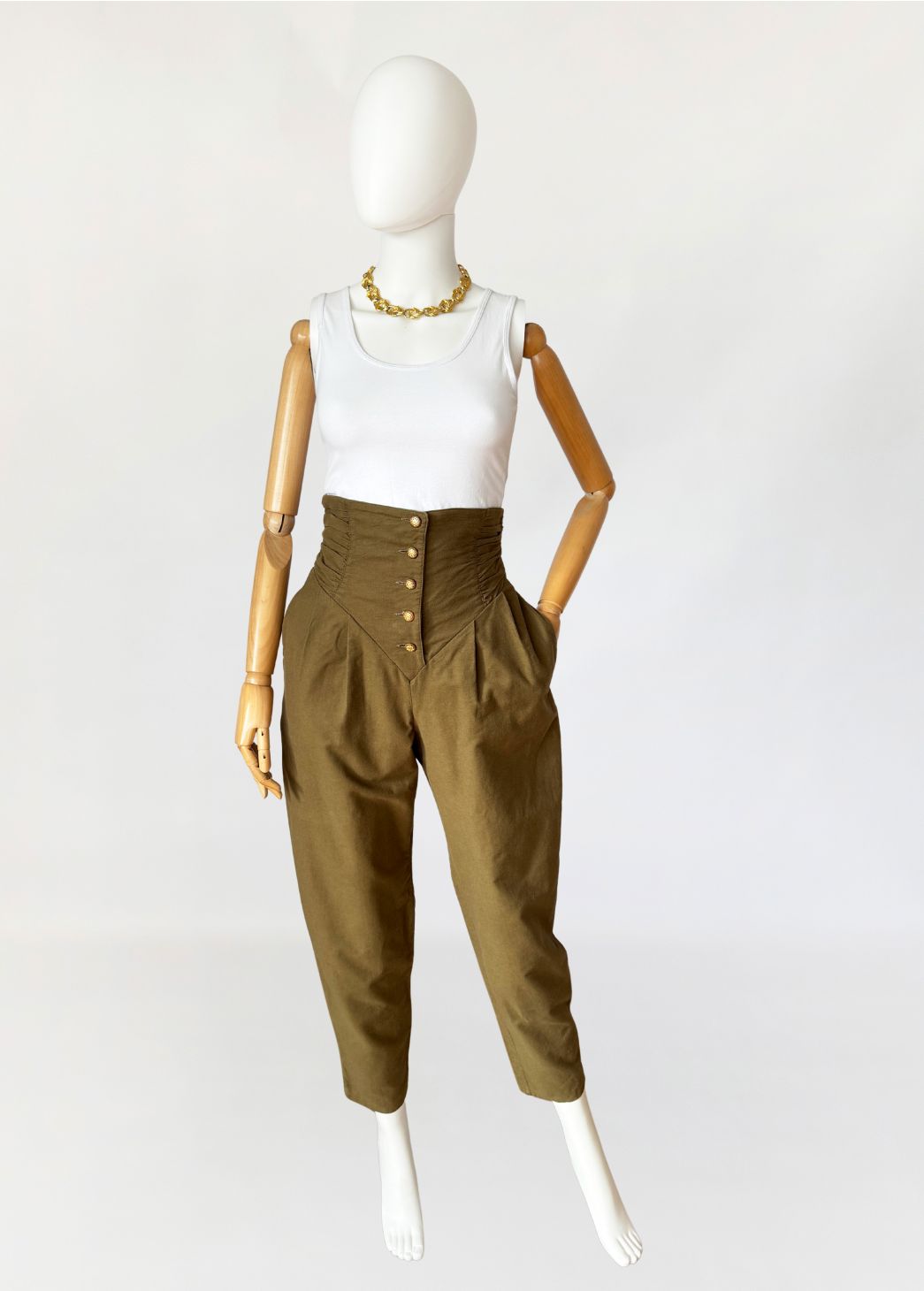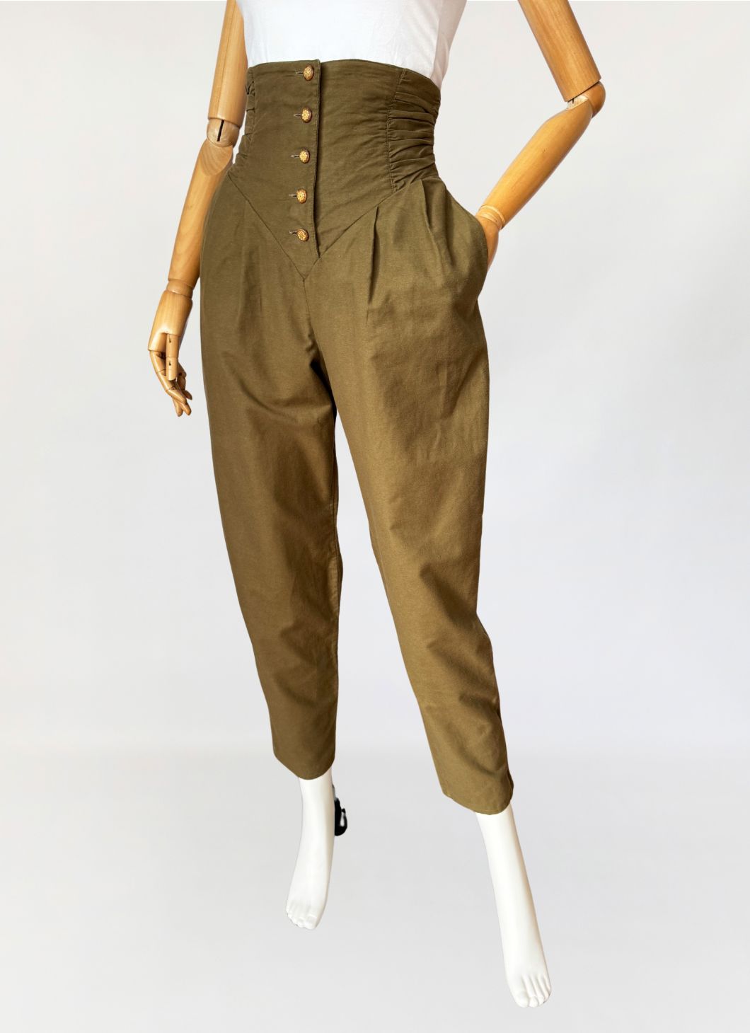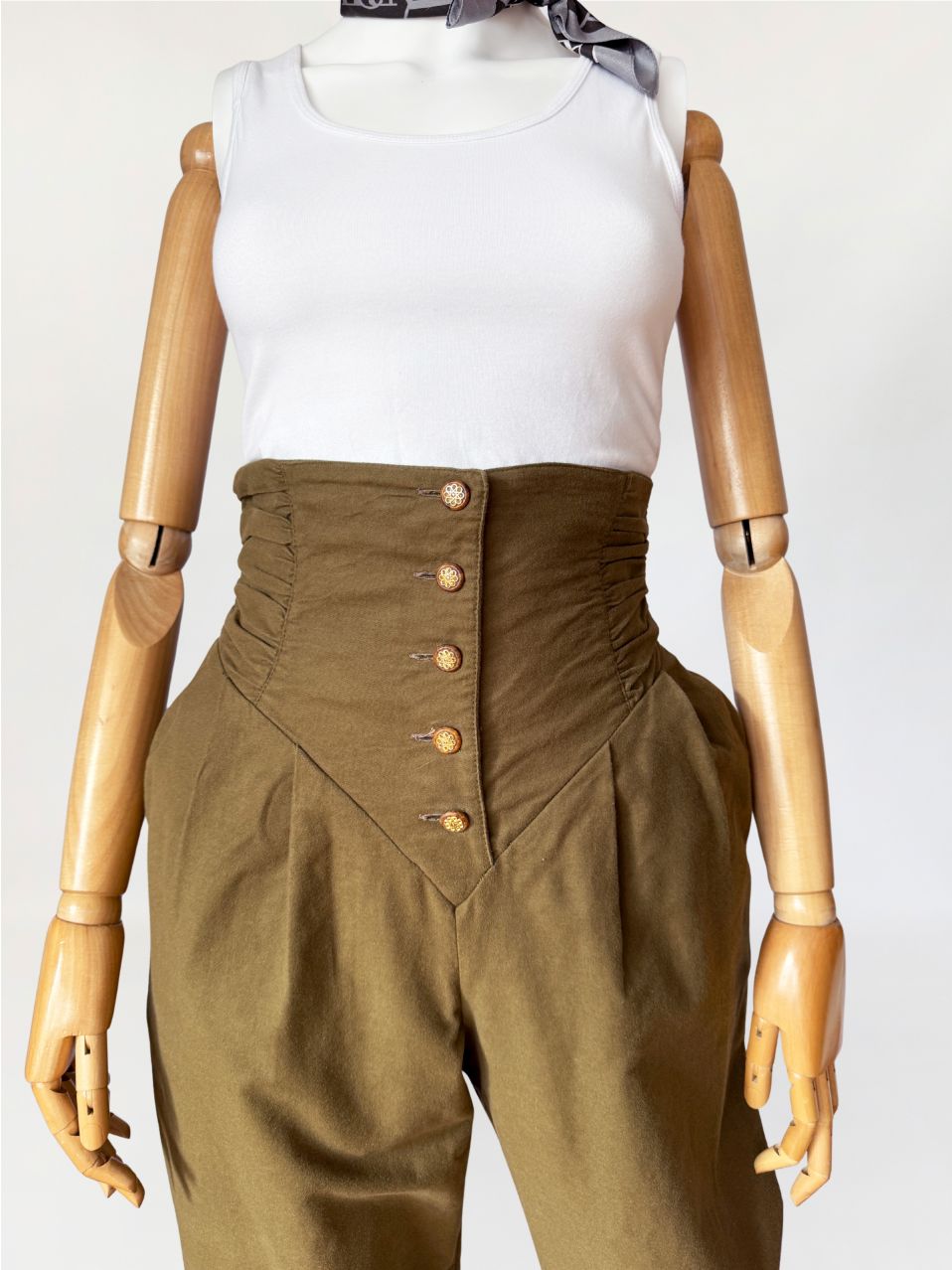 Włoskie spodnie vintage z lat 90-tych uszyte z bawełnianej tkaniny kolorze oliwkowej zieleni. Wysoki stan o charakterystycznej, gorsetowej formie z pionowymi przeszyciami i marszczeniami po bokach. Zapięcie z przodu na rząd pięciu ozdobnych guzików. Nogawki zwężane ku dołowi, z zaszewkami w pasie. Z tyłu elastyczna wstawka dopasowująca się do sylwetki. W bocznych szwach wsuwane kieszenie.