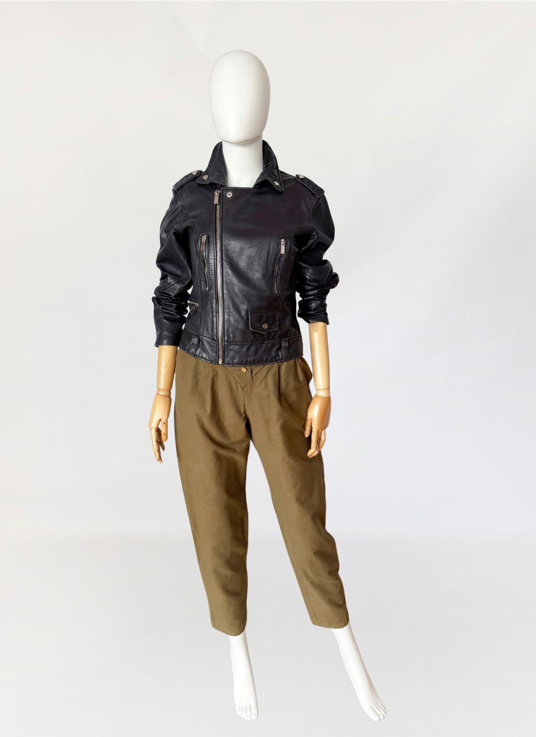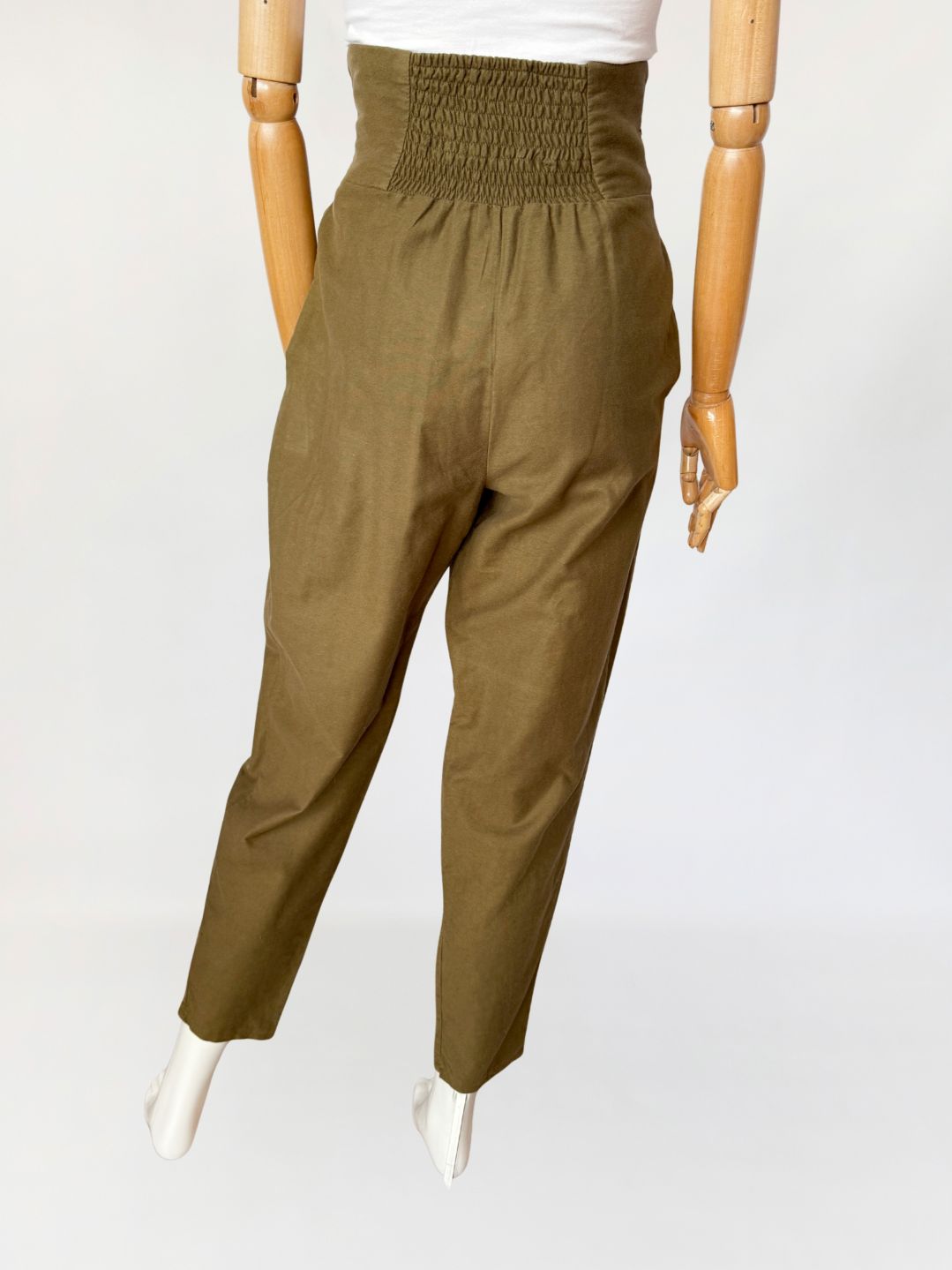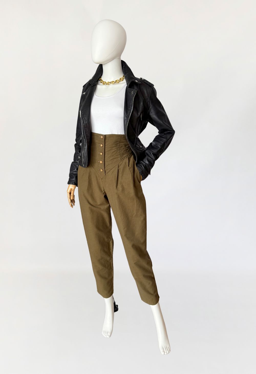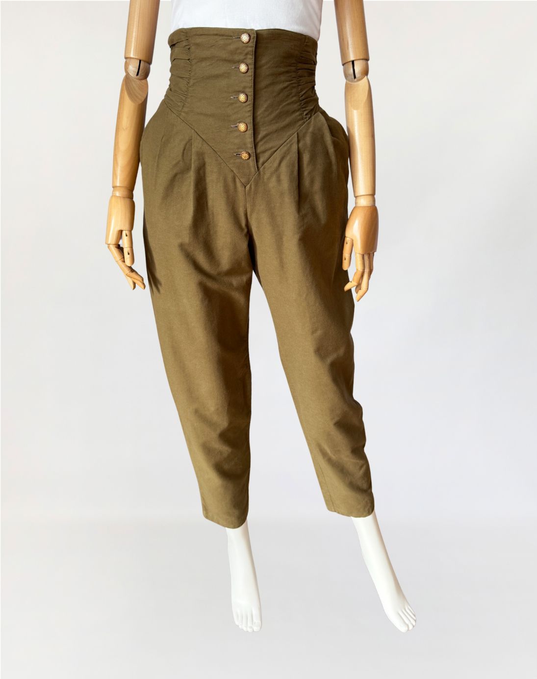 Włoskie spodnie vintage z lat 90-tych uszyte z bawełnianej tkaniny kolorze oliwkowej zieleni. Wysoki stan o charakterystycznej, gorsetowej formie z pionowymi przeszyciami i marszczeniami po bokach. Zapięcie z przodu na rząd pięciu ozdobnych guzików. Nogawki zwężane ku dołowi, z zaszewkami w pasie. Z tyłu elastyczna wstawka dopasowująca się do sylwetki. W bocznych szwach wsuwane kieszenie.
