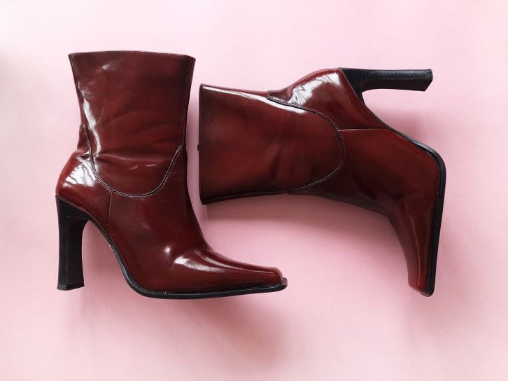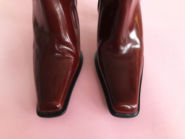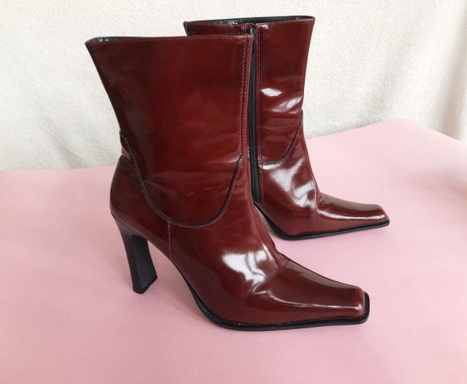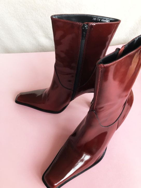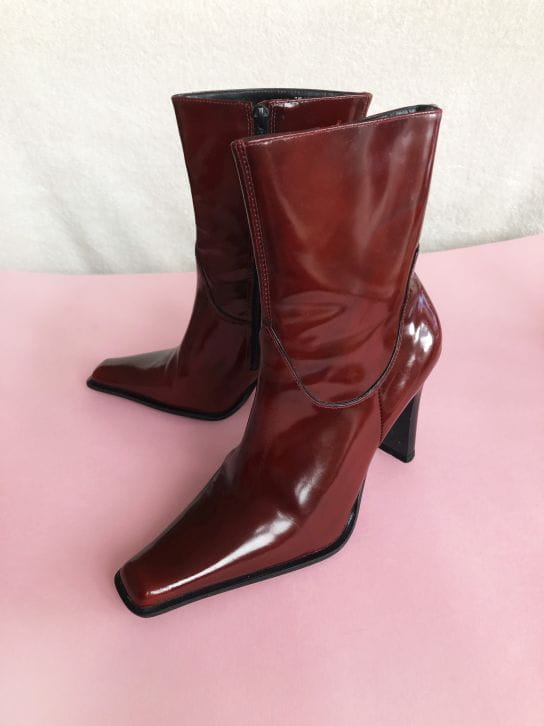 Brazylijskie botki vintage. Piękny brązowy odcień, lekko wpadający w wiśnię. Wyższa cholewka, kwadratowy szpic. Delikatnie lakierowane. Zasuwane z boku na suwak, lekko ocieplane pianką. Obcas 10,5 cm, ale ze względu na to, że jest szeroki buty są bardzo stabilne, nawet na siłę ciężko sprawić, by noga się chwiała. Świetny ponadczasowy model, idealne do plisowanych spódnic midi. Zachowane w super stanie, miejscowe niewielkie ryski, ślady użytkowania zdradza właściwie tylko podeszwa.