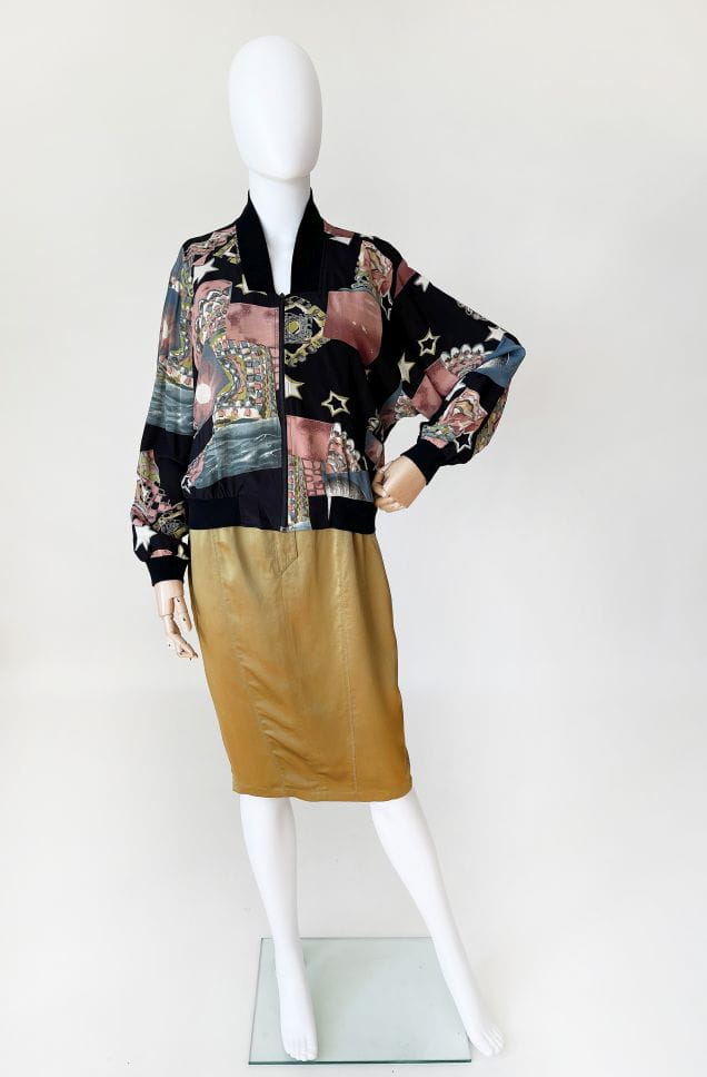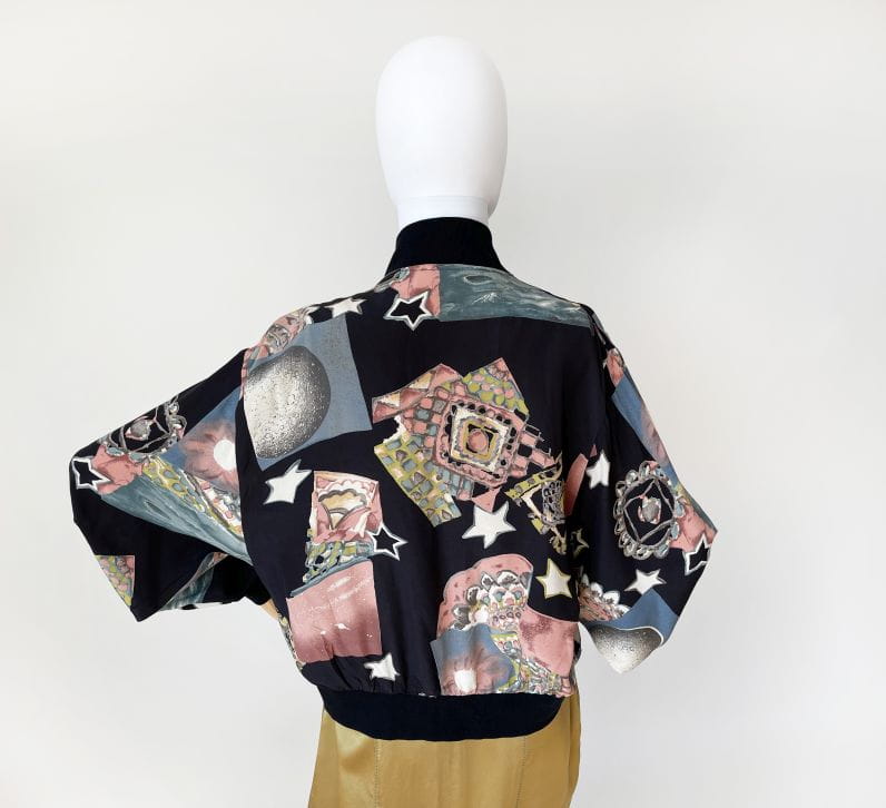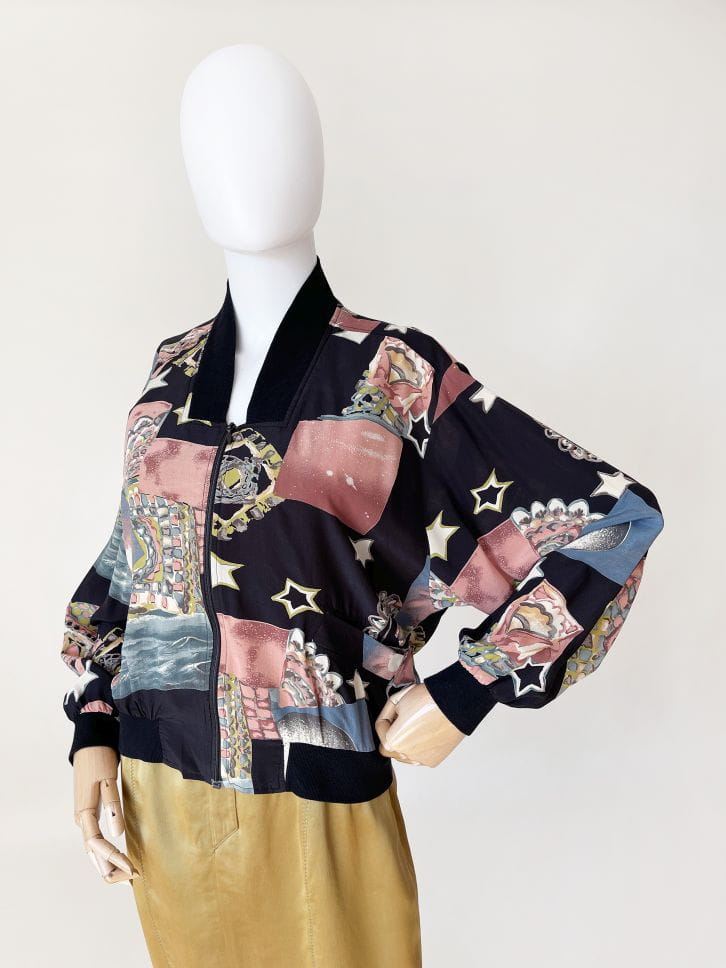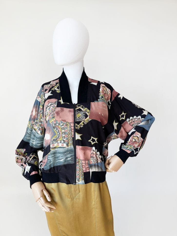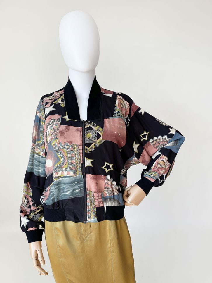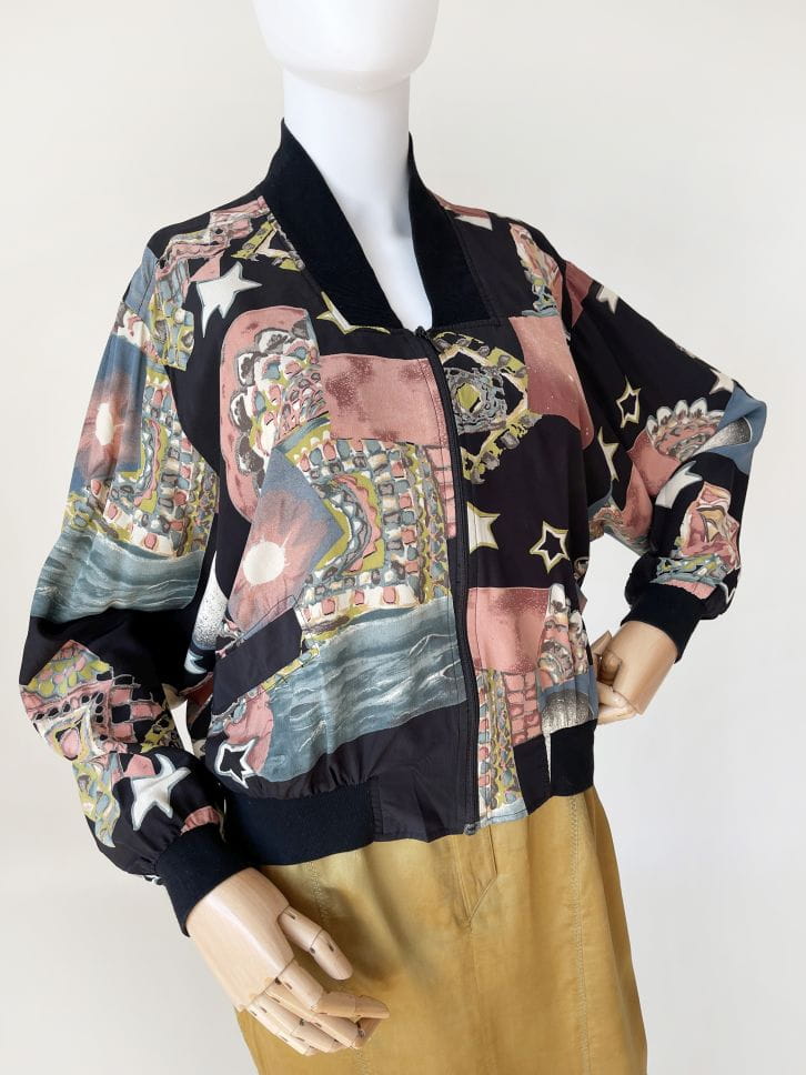 Bomberka vintage wykonana z lekkiej jedwabnej tkaniny w malowane wzory - gwiazdy, planety, kolorowe mozajki i inne niezidentyfikowane obiekty :) Luźny rozsuwany fason z obniżoną linią pach i długimi rękawami zakończonymi dzianinowymi ściągaczami. W dolnej partii kieszenie i elastyczna ściągacz.