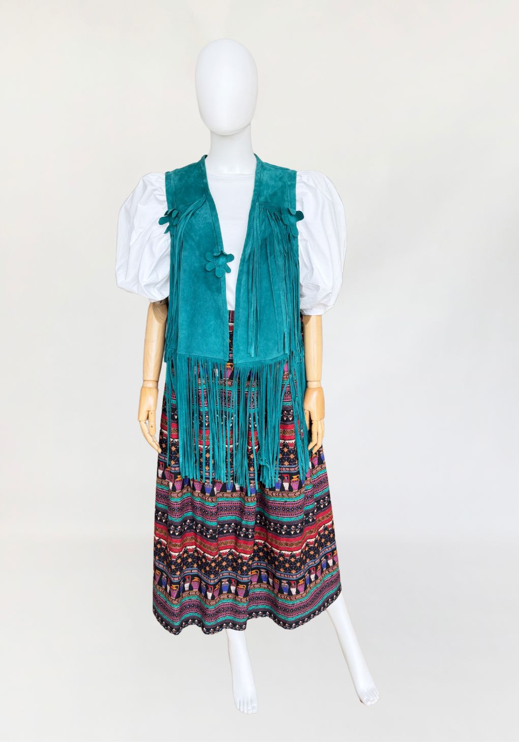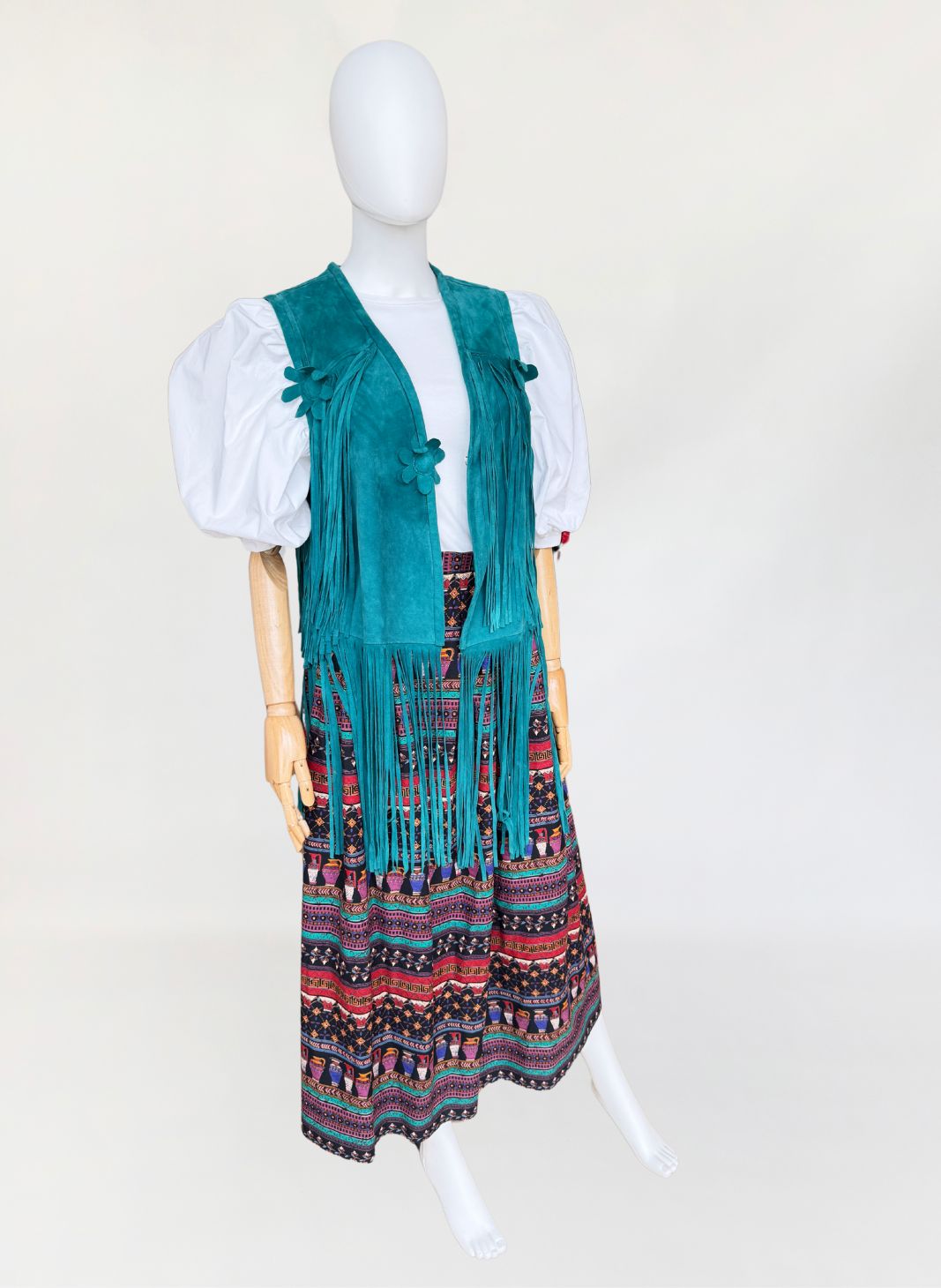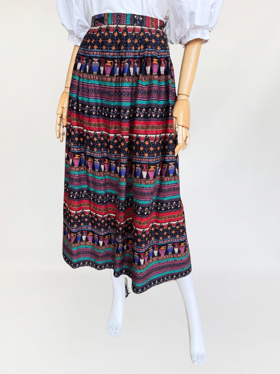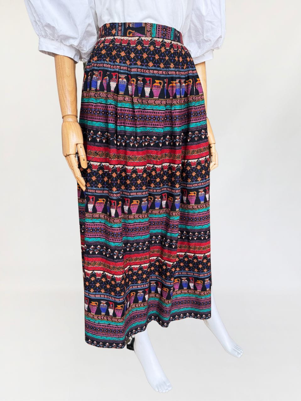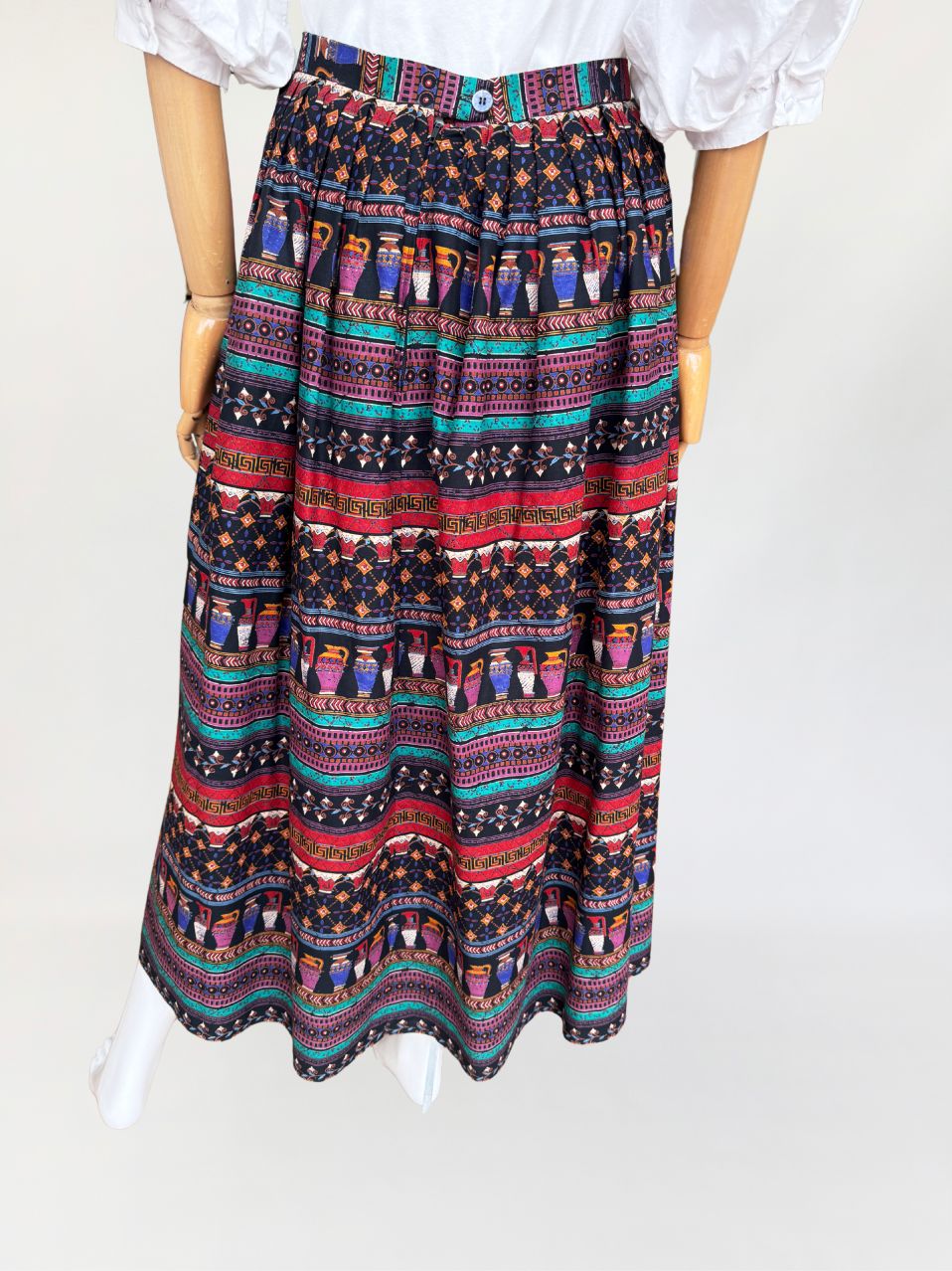 Spódnica vintage z przełomu lat 70-tych/80-tych. Wykonana z lekkiej bawełnianej tkaniny w multikolorowe etniczne i antyczne wzory. Rozkloszowany fason o długości maxi. Wysoki stan z dopasowaną talią. Od wewnątrz na podszewce.