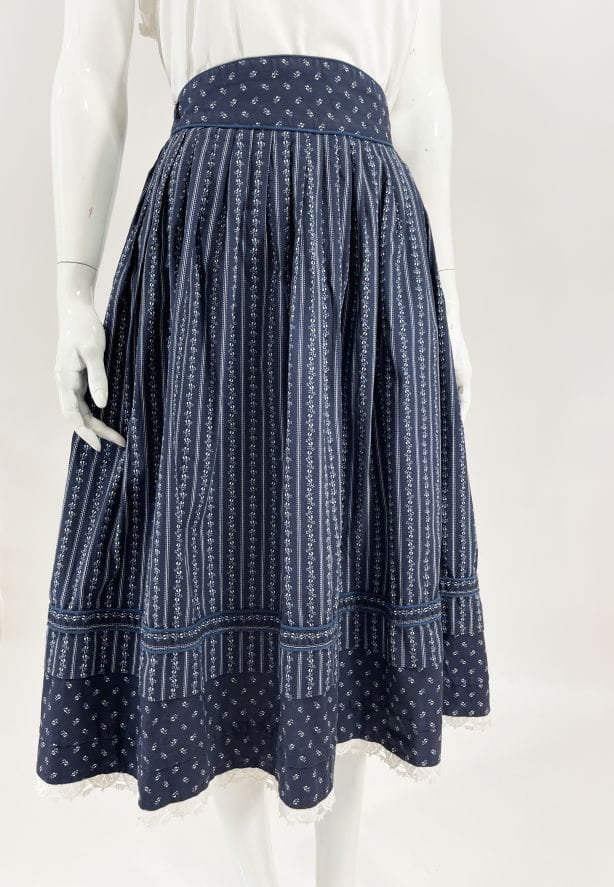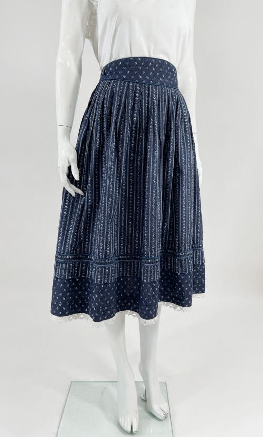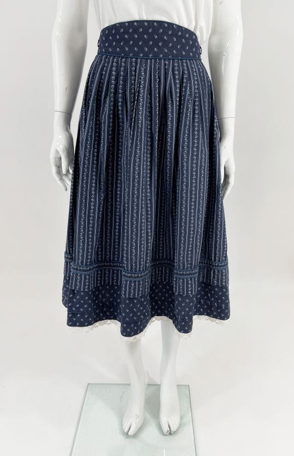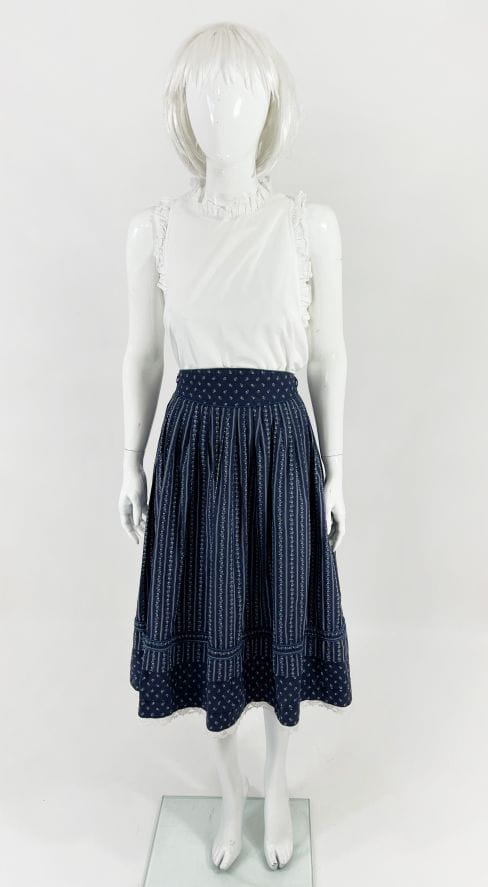 Bawełniana spódnica midi o mocno rozkloszowanym kroju. Wzorzysty deseń w drobne kwiaty. Wykończenia z jasnej koronki. Model bez podszewki.