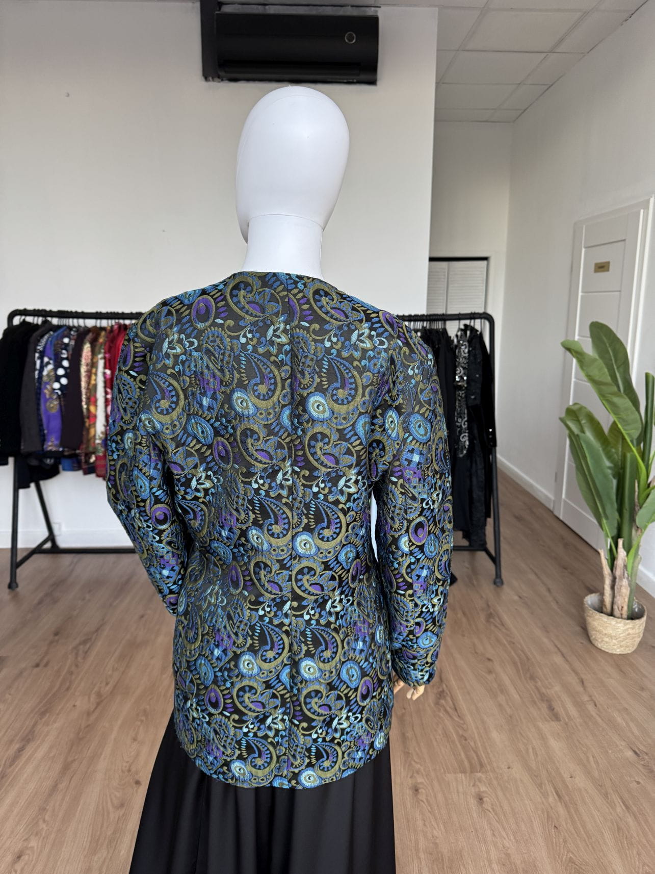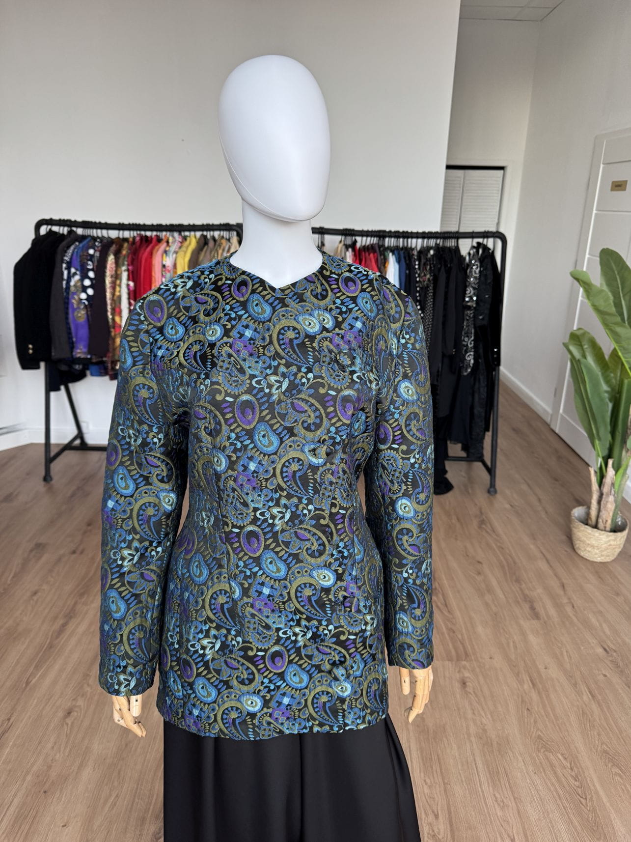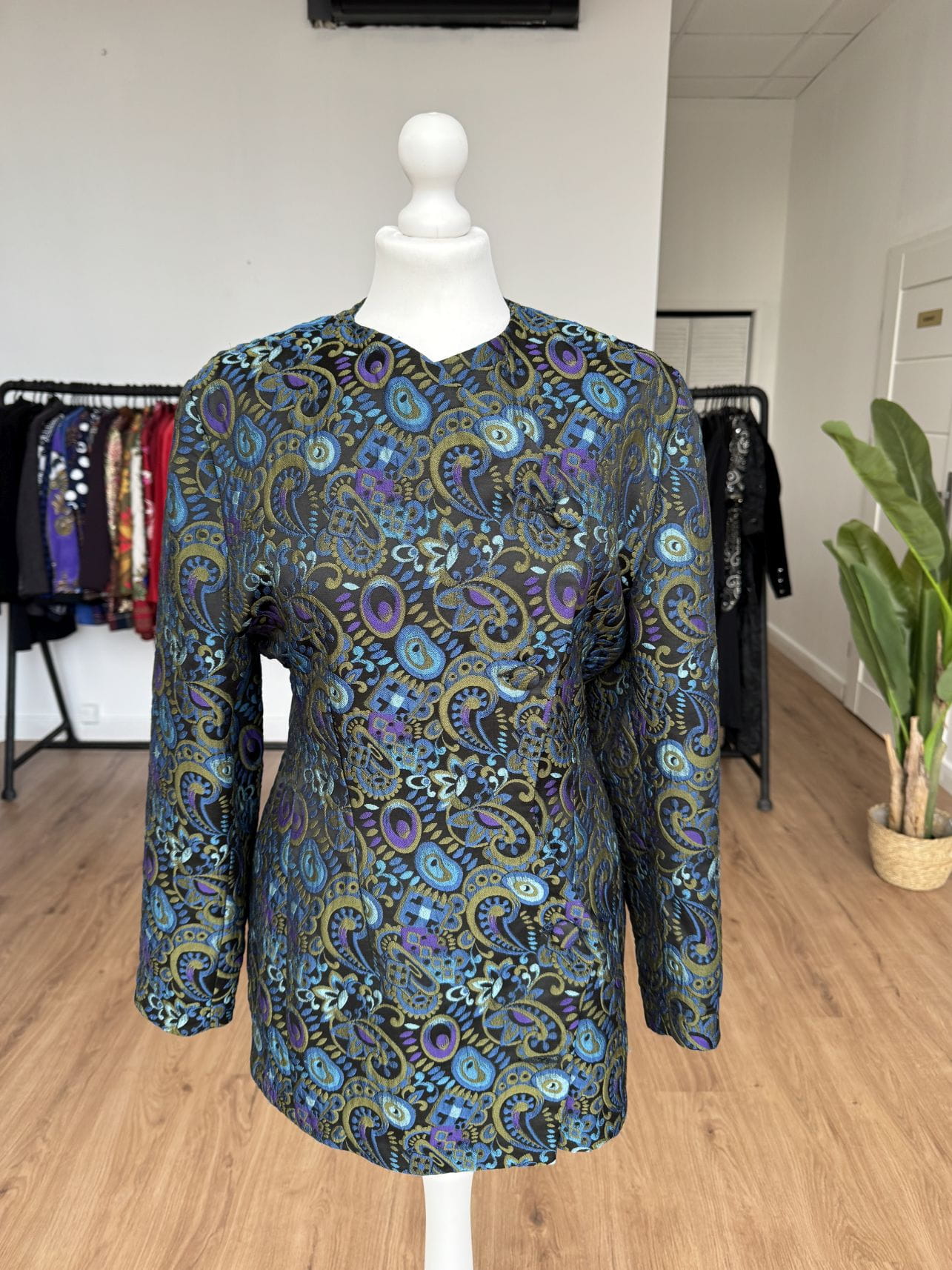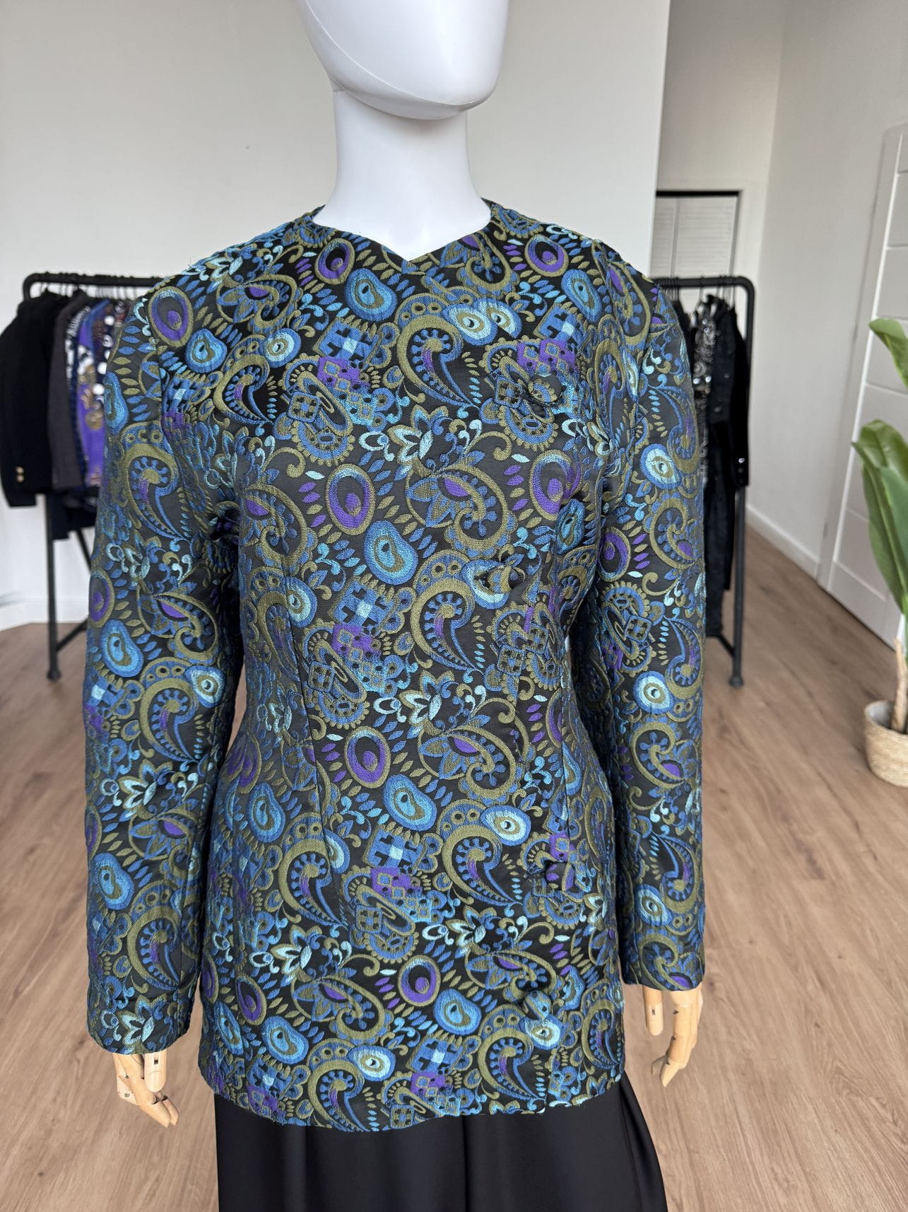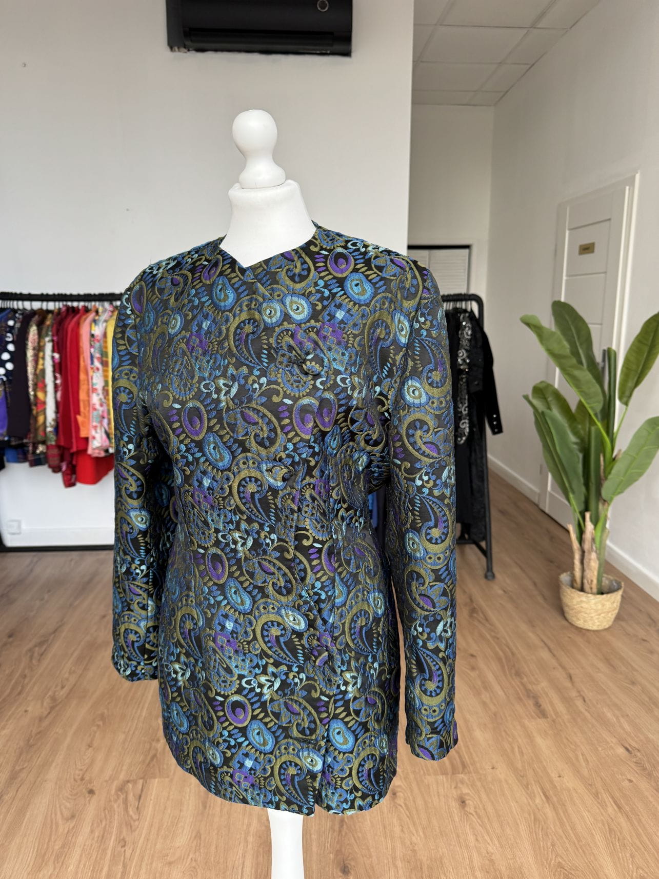 Włoska marynarka vintage wykonana z żakardowej wełnianej tkaniny w barwne wzory. Dłuższy fason z asymetrycznym zapięciem na powlekane guziki.