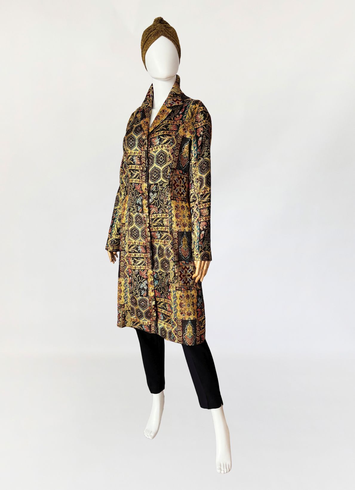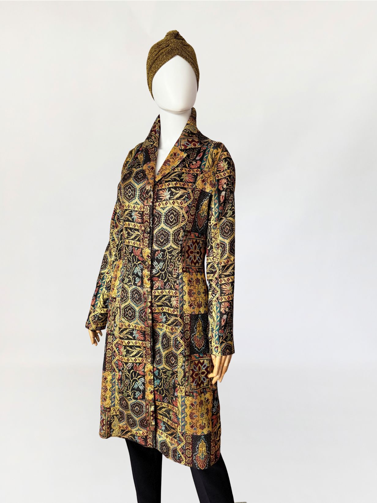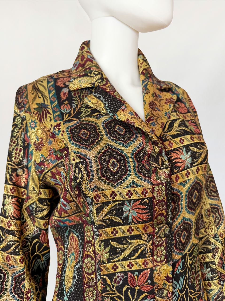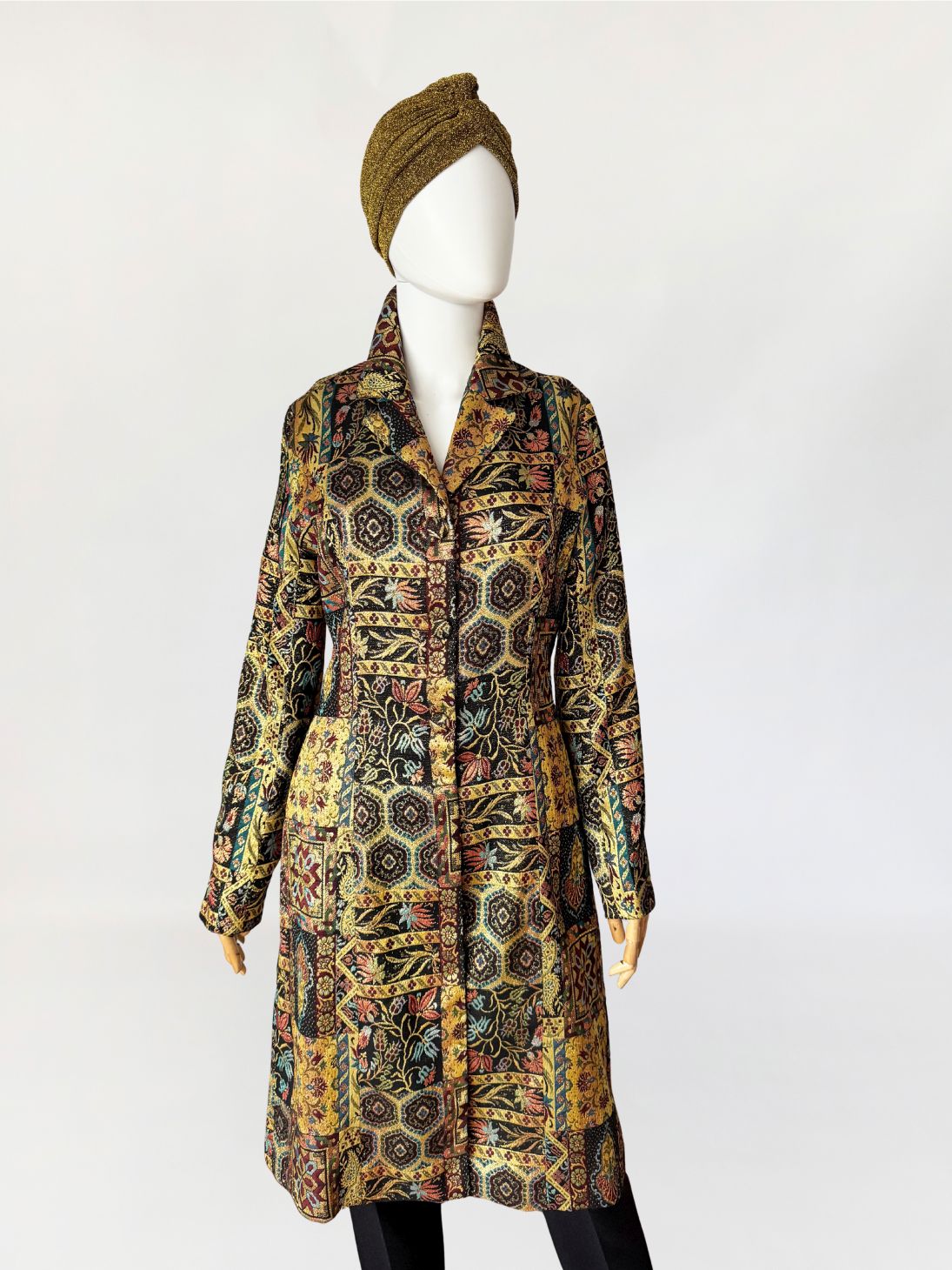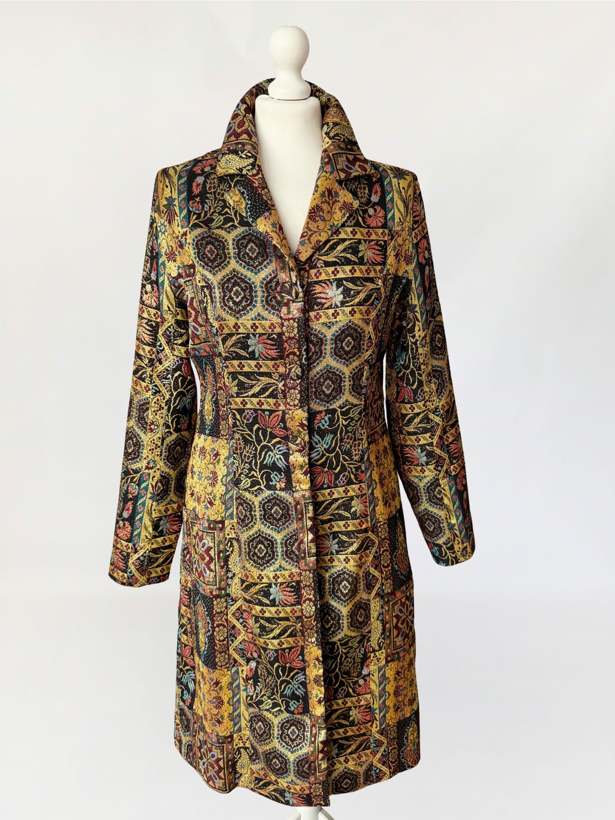 Zjawiskowy francuski płaszcz vintage projektu Jeffa Gallano. Doskonale sprawdzi się zarówno jako okrycie wieczorowe, jak i element codziennych stylizacji. Wykonany z dekoracyjnej tkaniny żakardowej o wielobarwnym, wielomotywowym wzorze inspirowanym ornamentyką orientalną. Dominują odcienie złota, czerni, burgundu, głębokiej zieleni i seledynowych akcentów. Wzór tkaniny układany jest panelowo: motywy powtarzają się w formie prostokątnych modułów o zmiennej skali, tworząc rytmiczną kompozycję na całej długości sylwetki. Powierzchnia o wyraźnej, gęsto tkanej strukturze, z metalizującą nitką nadającą kompozycji intensywność koloru. Krój oparty na wydłużonej linii, z precyzyjnie modelowaną talią. Rękawy wszywane tradycyjnie, z prostą linią mankietu. W górniej części nieduży rewersowy kołnierz. Front zapinany na rząd powlekanych guzików.