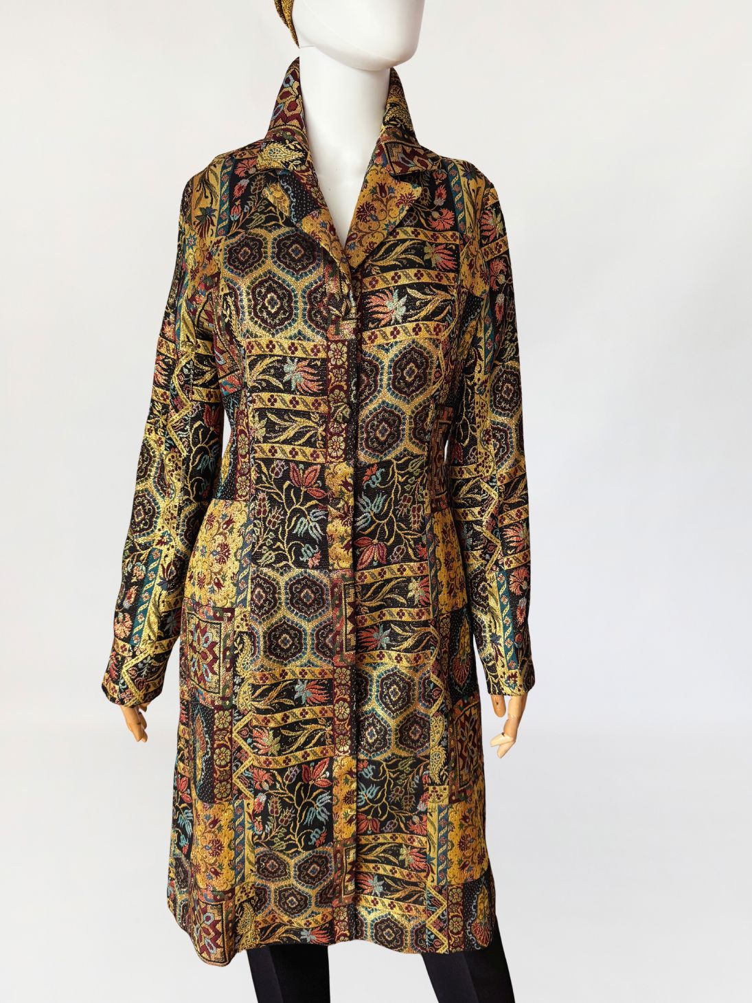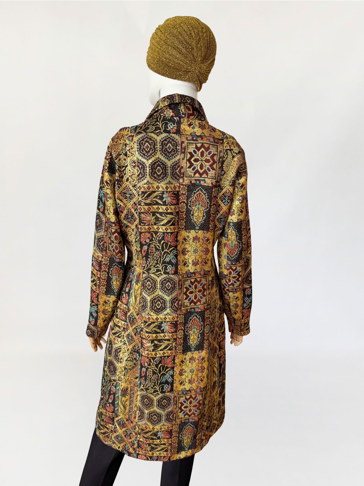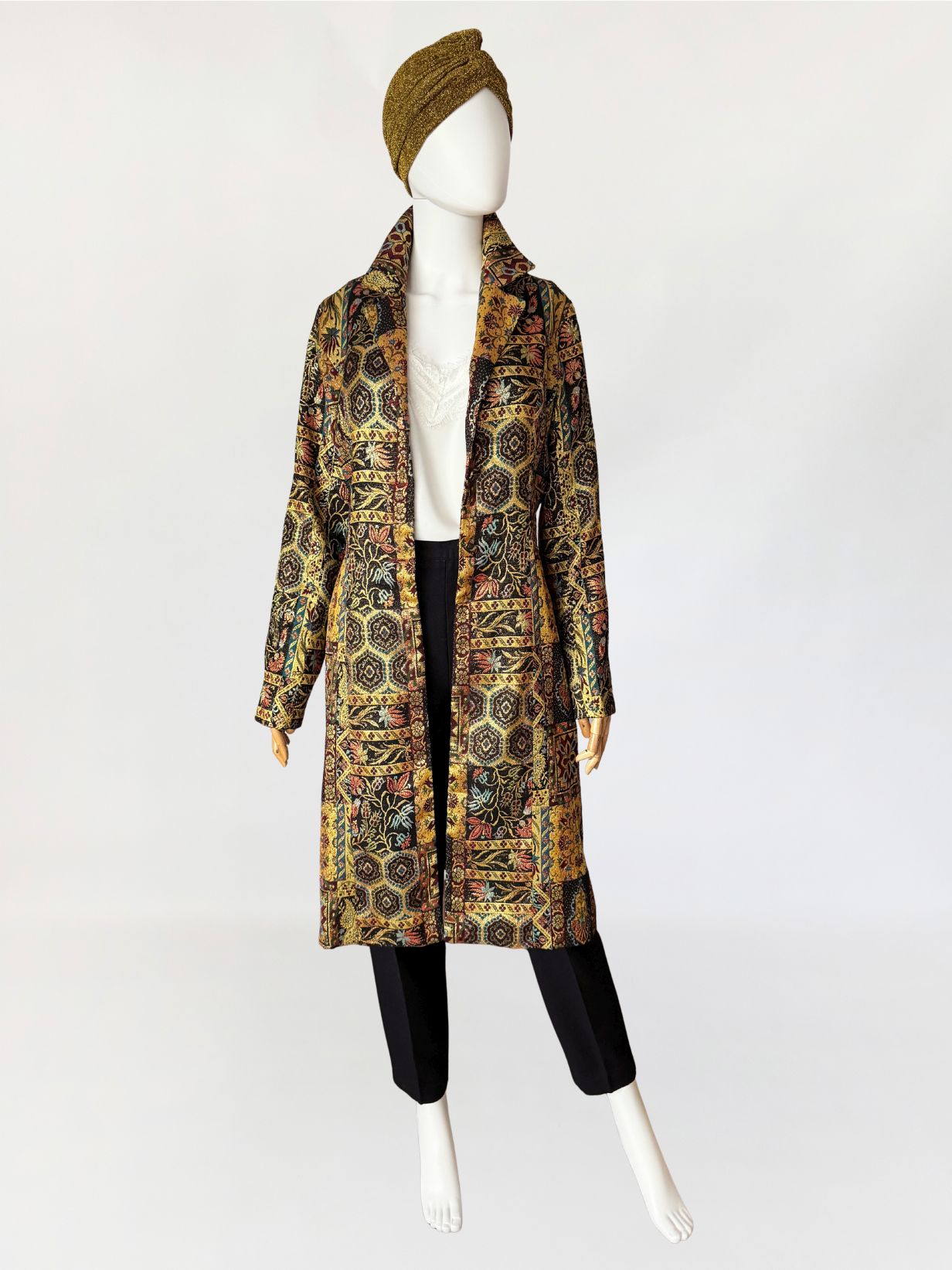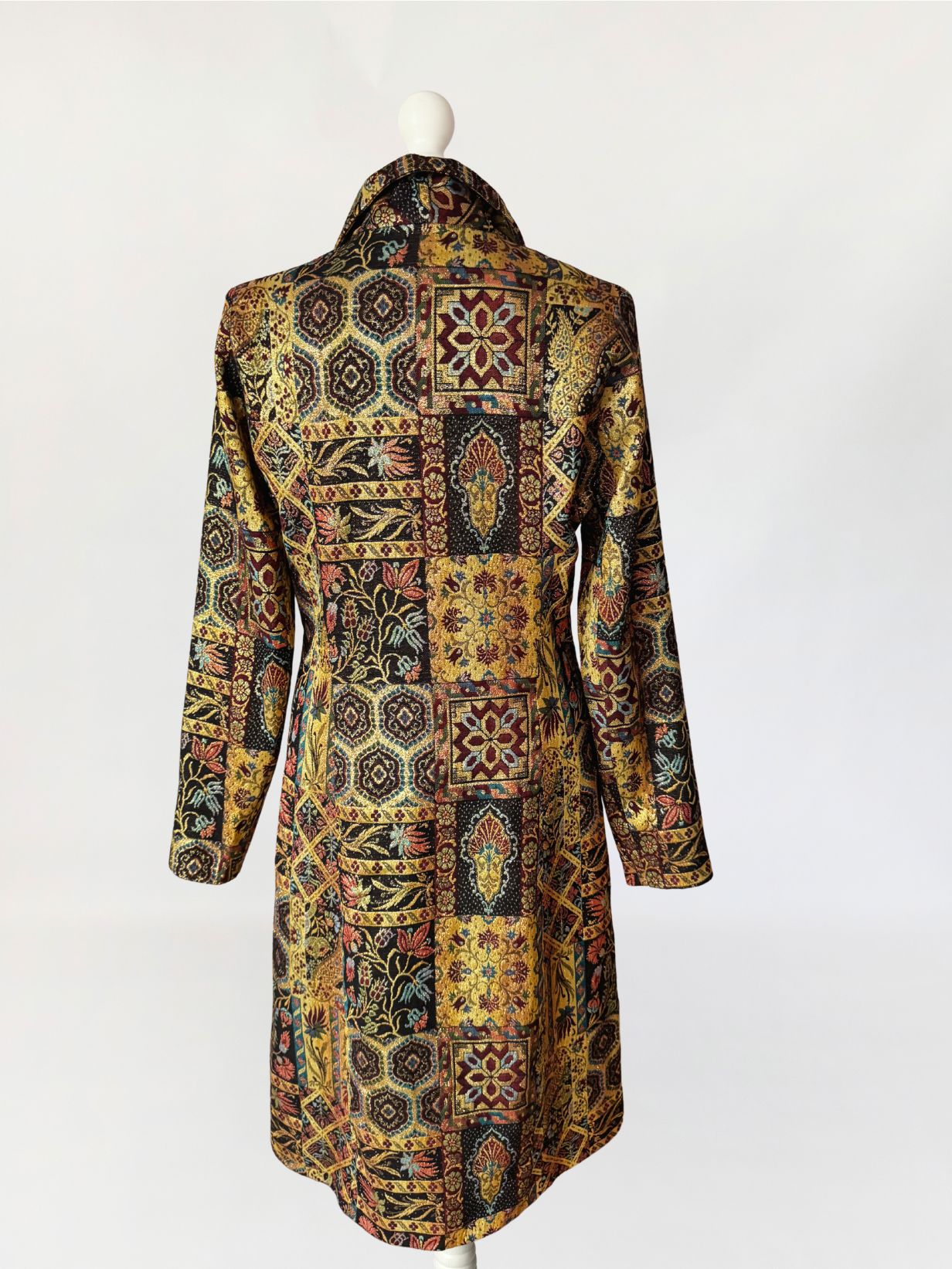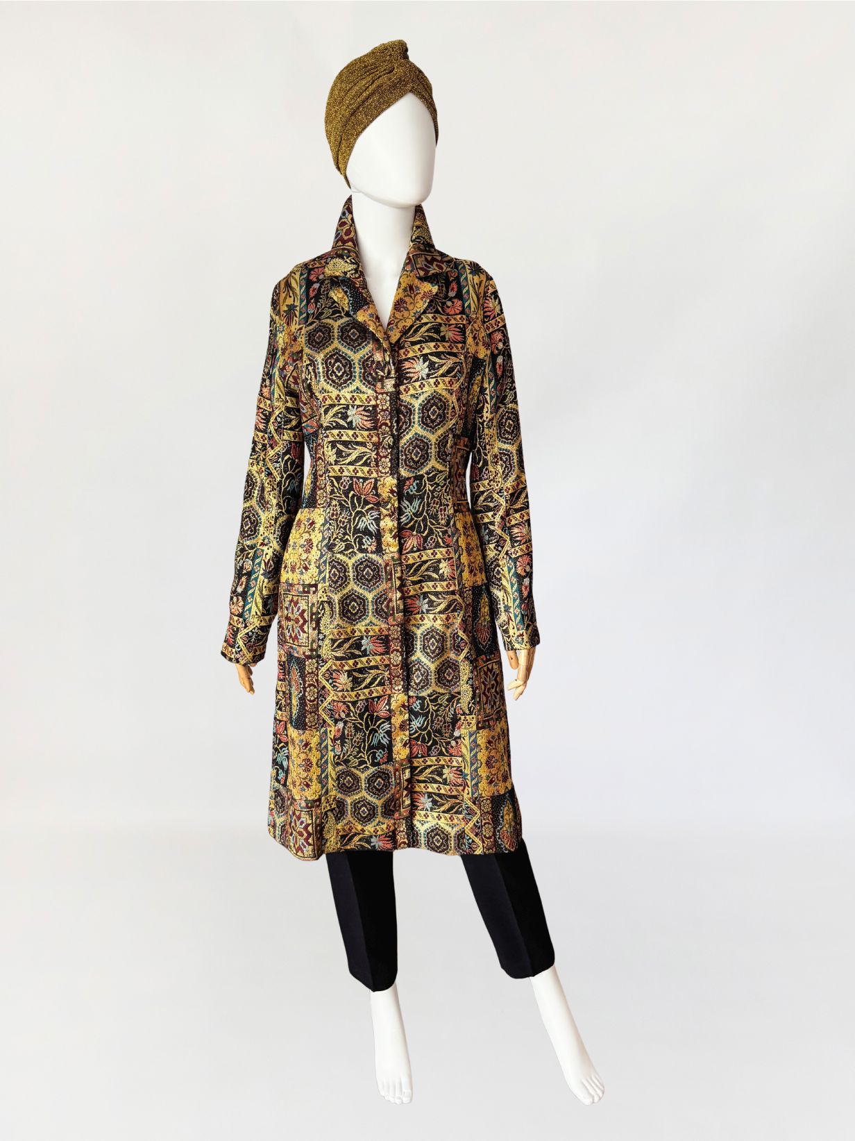 Zjawiskowy francuski płaszcz vintage projektu Jeffa Gallano. Doskonale sprawdzi się zarówno jako okrycie wieczorowe, jak i element codziennych stylizacji. Wykonany z dekoracyjnej tkaniny żakardowej o wielobarwnym, wielomotywowym wzorze inspirowanym ornamentyką orientalną. Dominują odcienie złota, czerni, burgundu, głębokiej zieleni i seledynowych akcentów. Wzór tkaniny układany jest panelowo: motywy powtarzają się w formie prostokątnych modułów o zmiennej skali, tworząc rytmiczną kompozycję na całej długości sylwetki. Powierzchnia o wyraźnej, gęsto tkanej strukturze, z metalizującą nitką nadającą kompozycji intensywność koloru. Krój oparty na wydłużonej linii, z precyzyjnie modelowaną talią. Rękawy wszywane tradycyjnie, z prostą linią mankietu. W górniej części nieduży rewersowy kołnierz. Front zapinany na rząd powlekanych guzików.