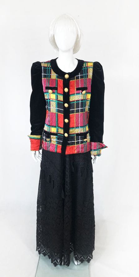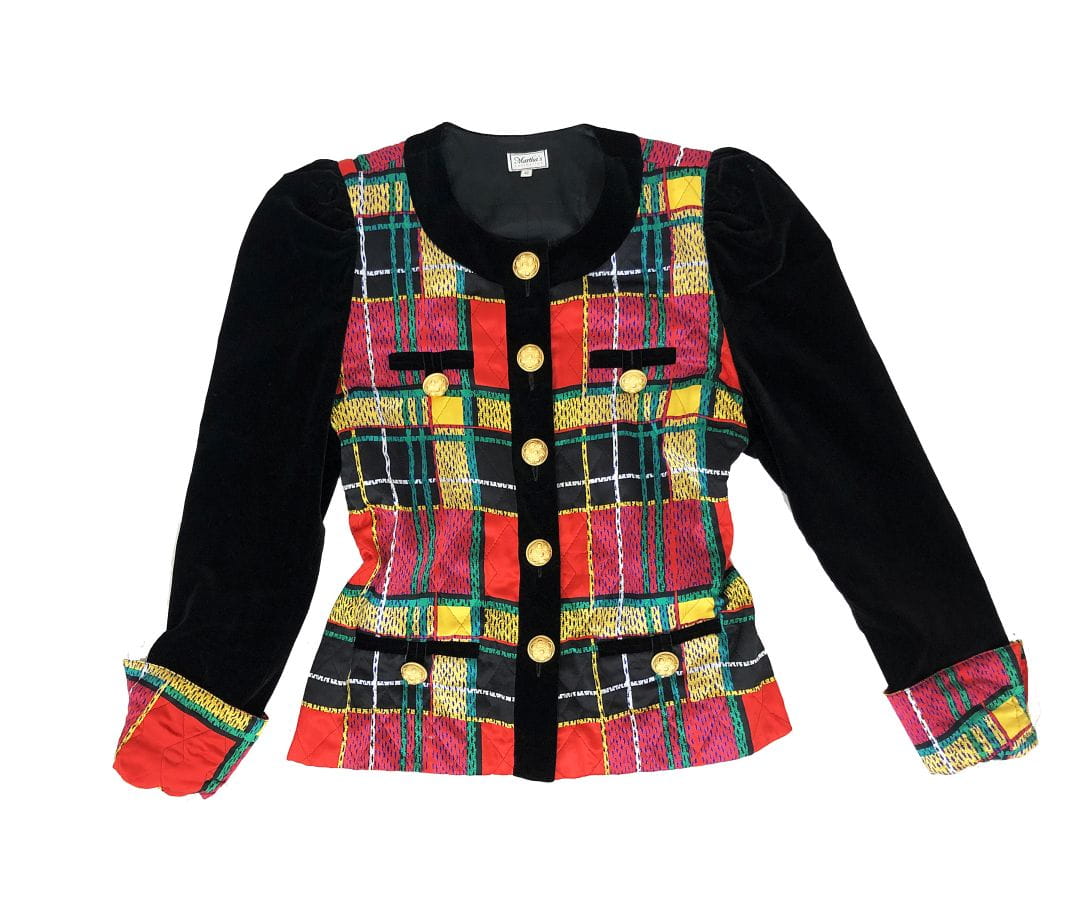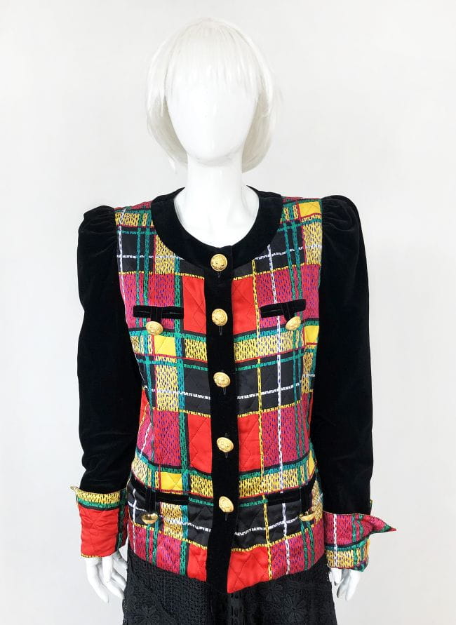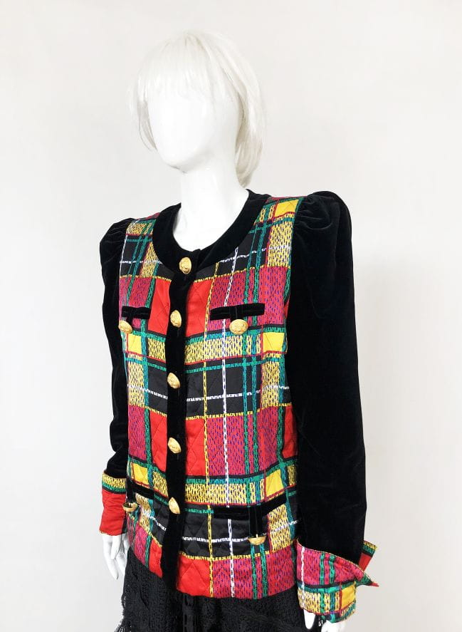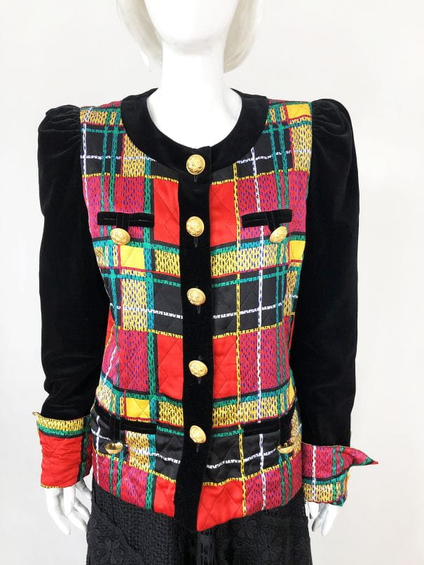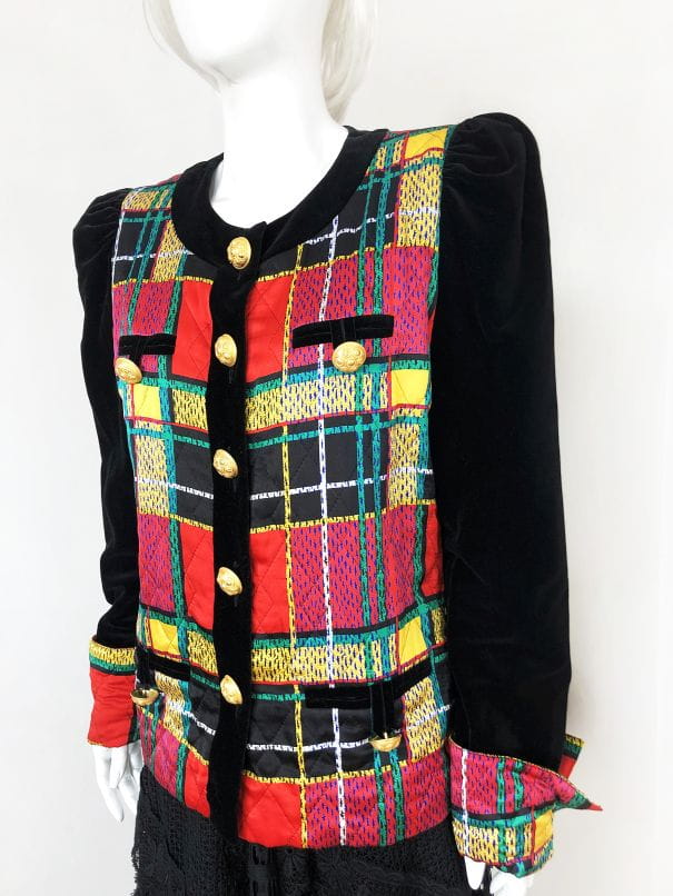 Obłędny, oryginalny żakiet vintage wykonany z naturalnego jedwabiu. Zapinany na ogromne zdobione złote guziki. Korpus i mankiety w multikolorową kratę. Czarne aksamitne rękawy, ramiona lekko bufiaste. Po dwie niewielkie wsuwane kieszenie u góry i u dołu, wszystkie z guzikami. Zapasowy guzik przy metce wewnętrznej. Ma podszewkę. Real vintage.