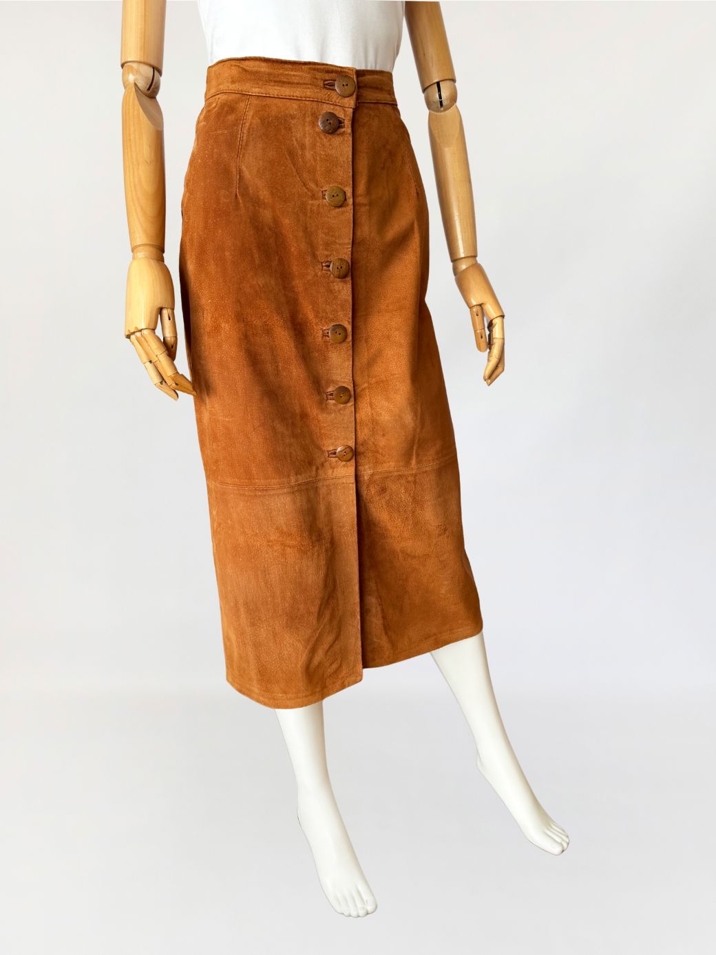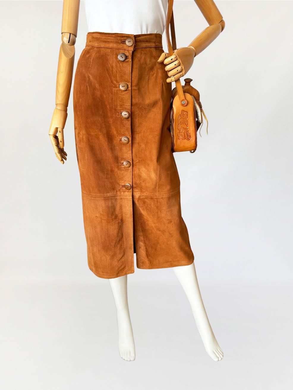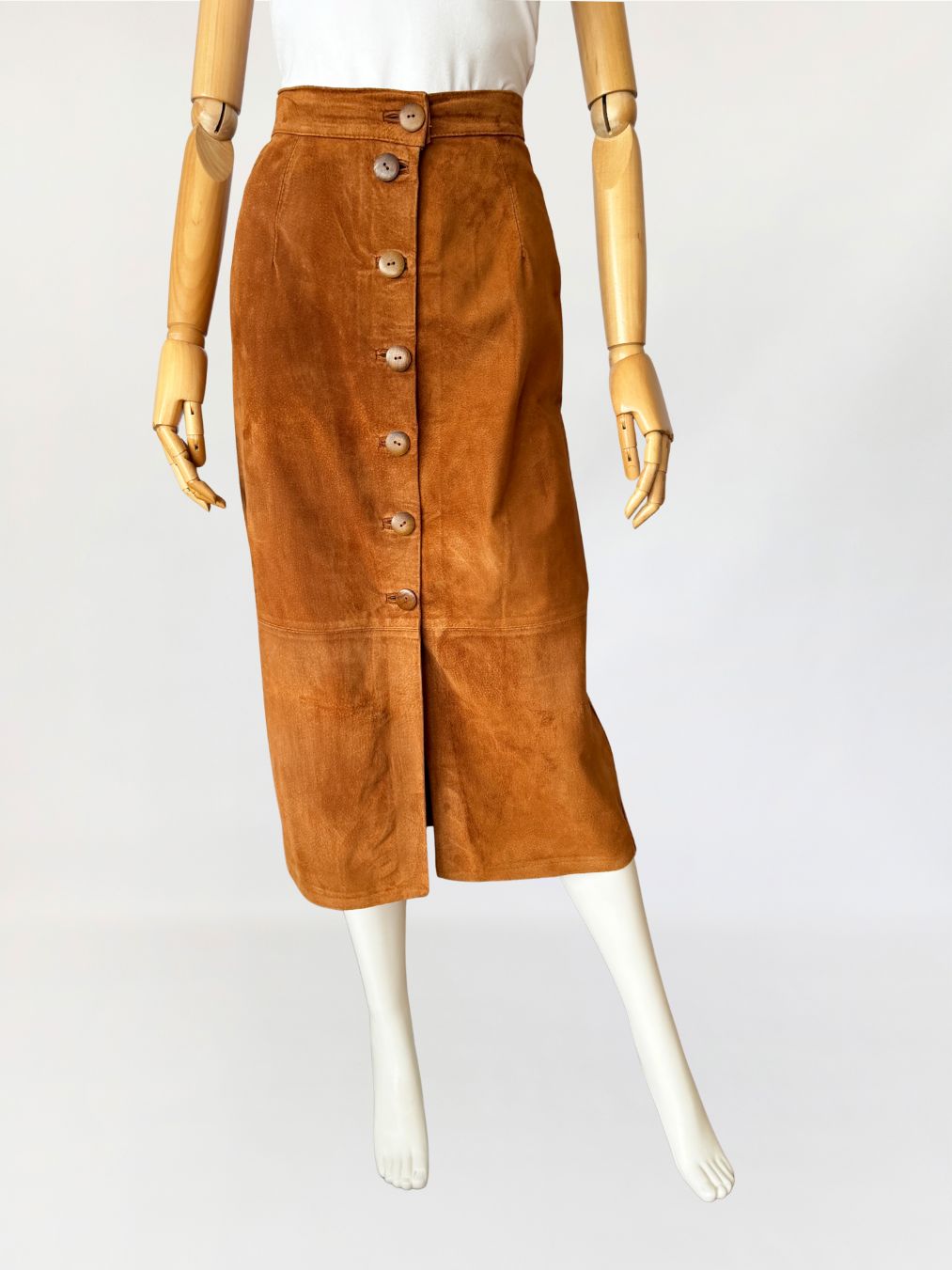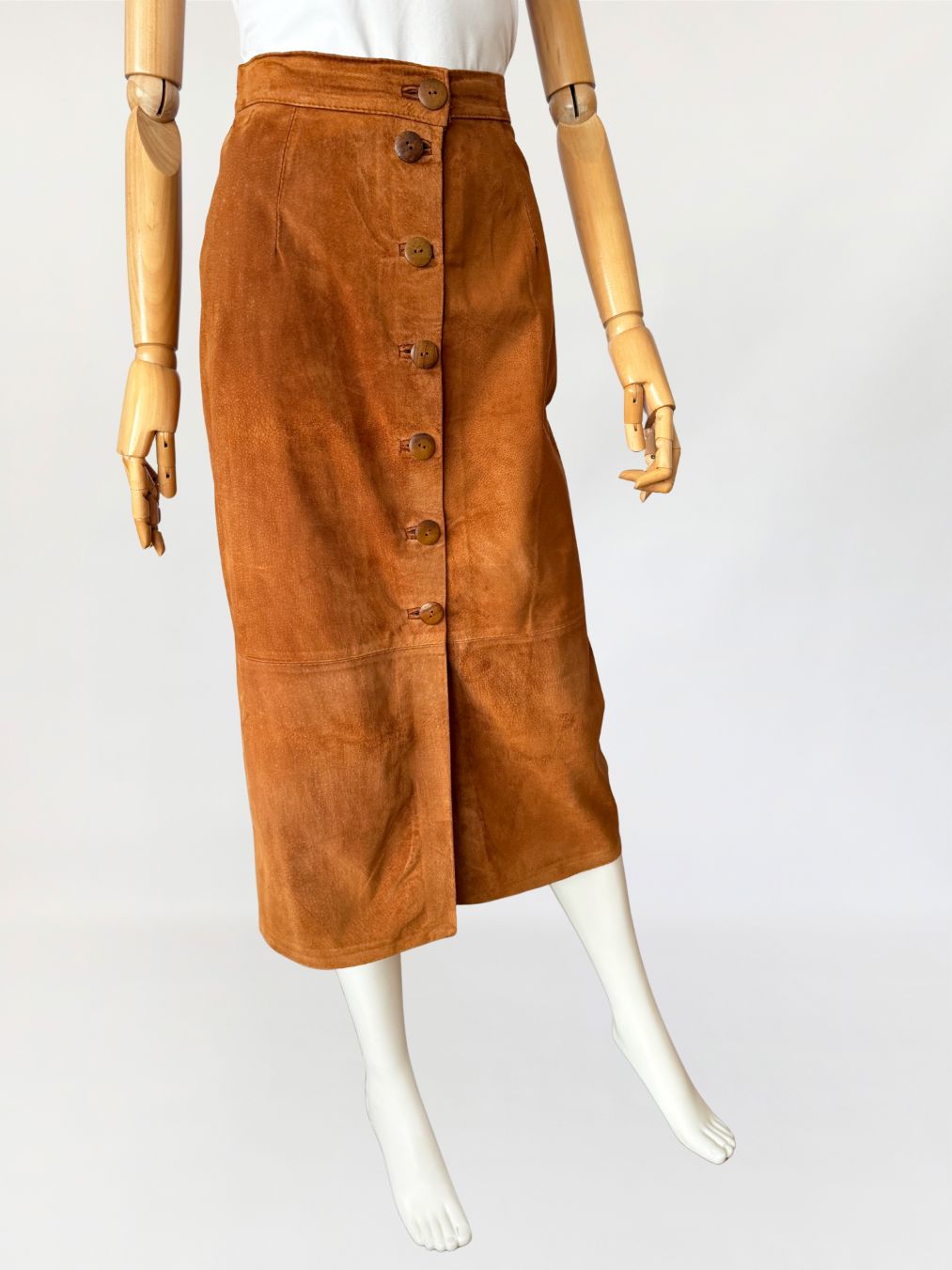 Spódnica vintage wykonana z naturalnego zamszu w odcieniu ciepłego koniaku. Model o długości midi, ołówkowy, zapinany frontowo na rząd okrągłych guzików w odcieniu zbliżonym do koloru skóry. Linia przodu modelowana pionowymi cięciami konstrukcyjnymi. W dolnej części dodatkowy poziomy szew konstrukcyjny. Rozcięcie powstające z rozpięcia dolnych guzików umożliwia swobodę ruchu.