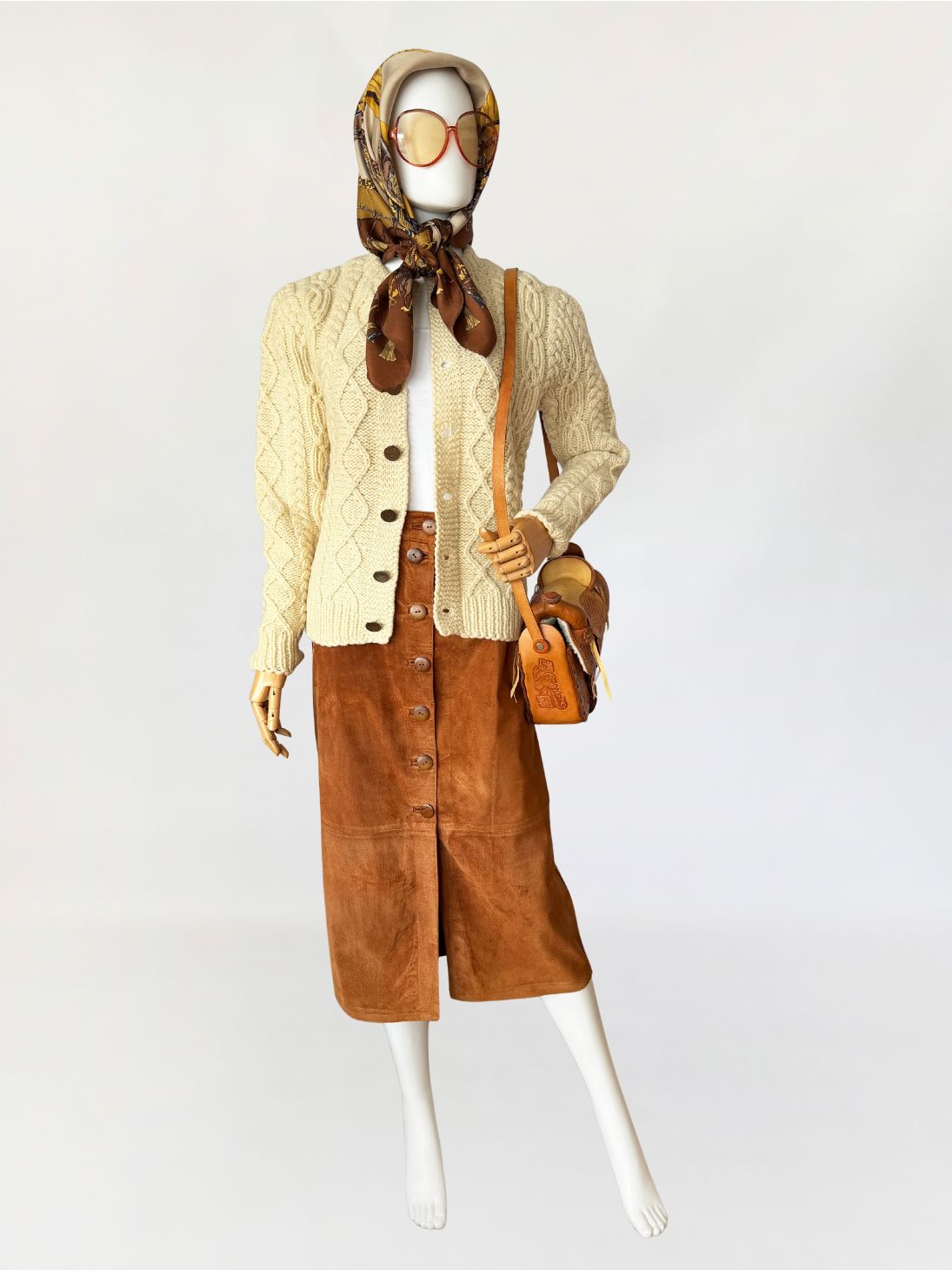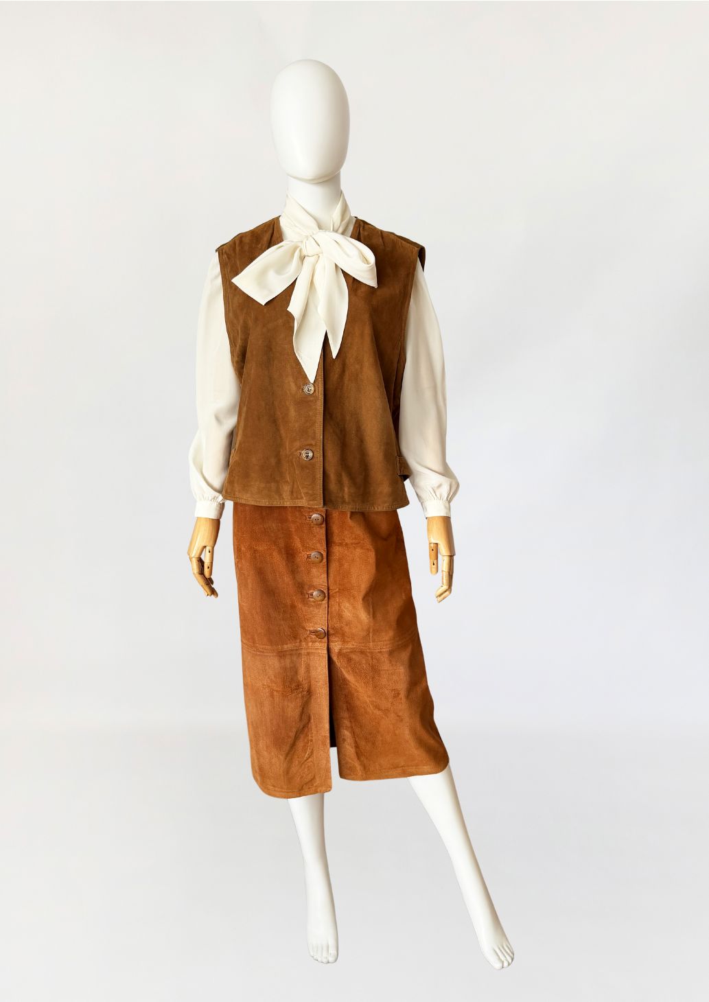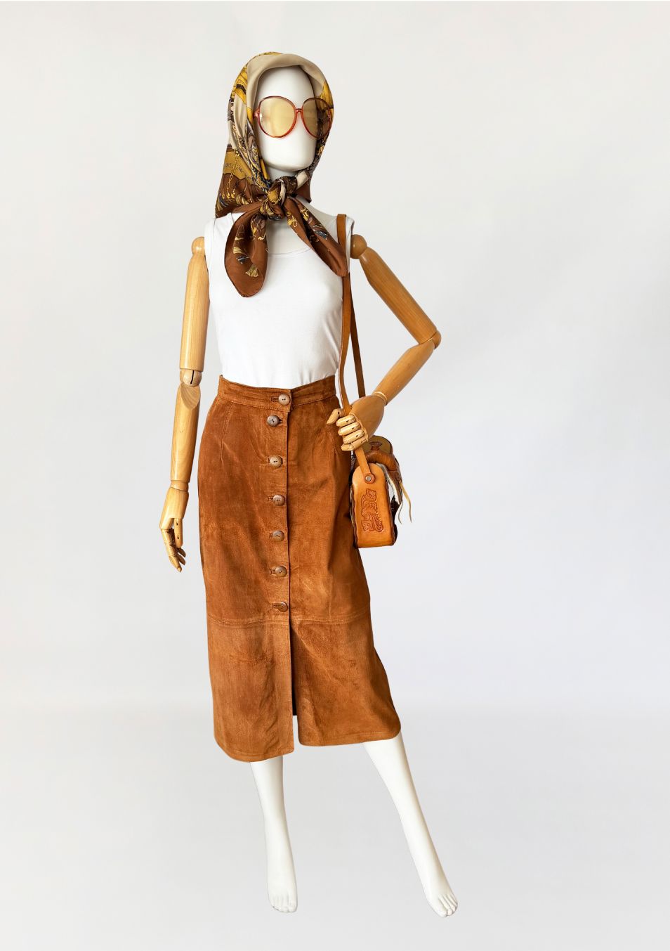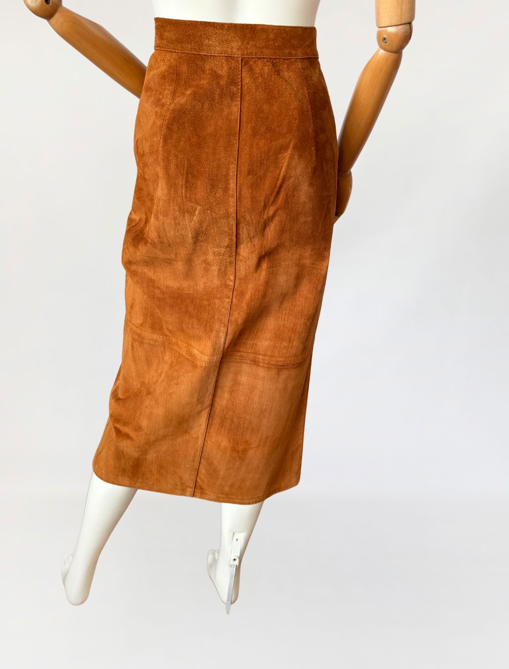 Spódnica vintage wykonana z naturalnego zamszu w odcieniu ciepłego koniaku. Model o długości midi, ołówkowy, zapinany frontowo na rząd okrągłych guzików w odcieniu zbliżonym do koloru skóry. Linia przodu modelowana pionowymi cięciami konstrukcyjnymi. W dolnej części dodatkowy poziomy szew konstrukcyjny. Rozcięcie powstające z rozpięcia dolnych guzików umożliwia swobodę ruchu.