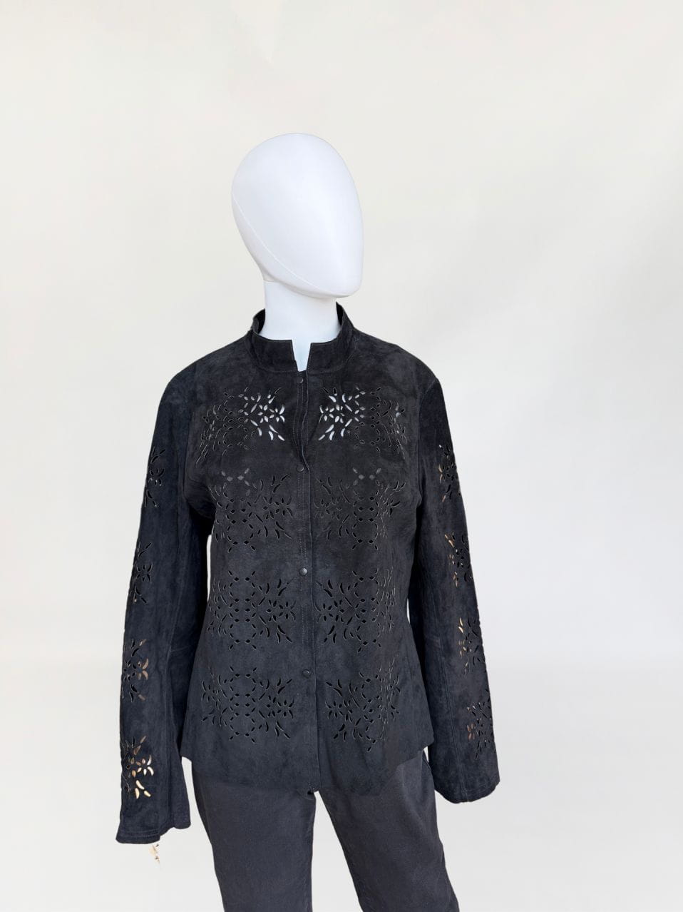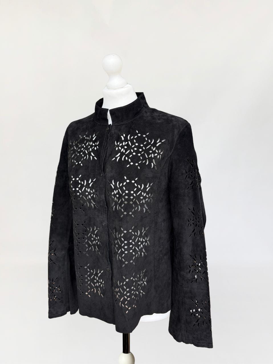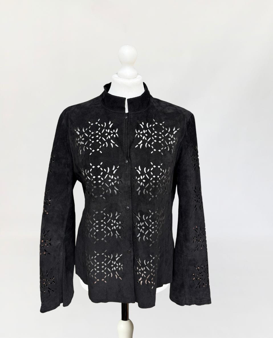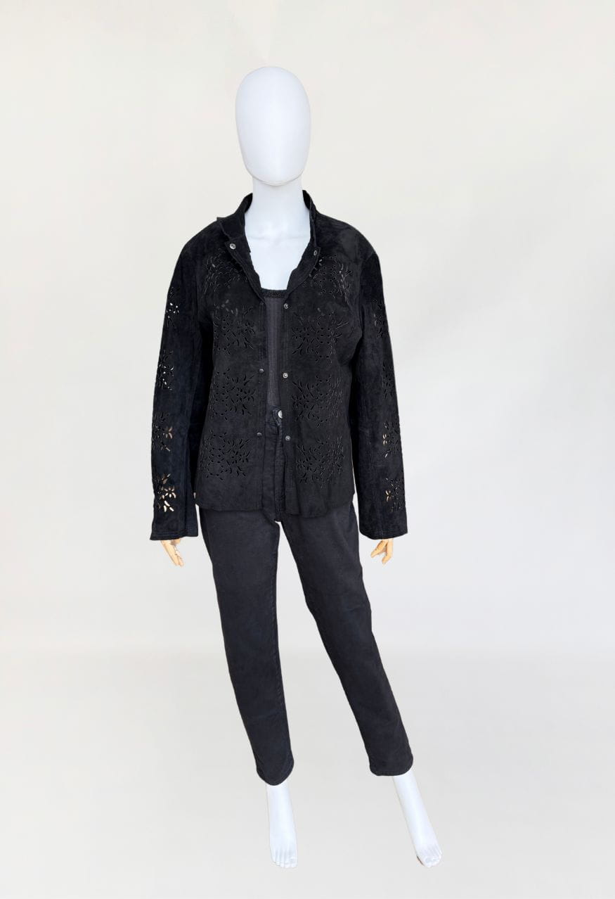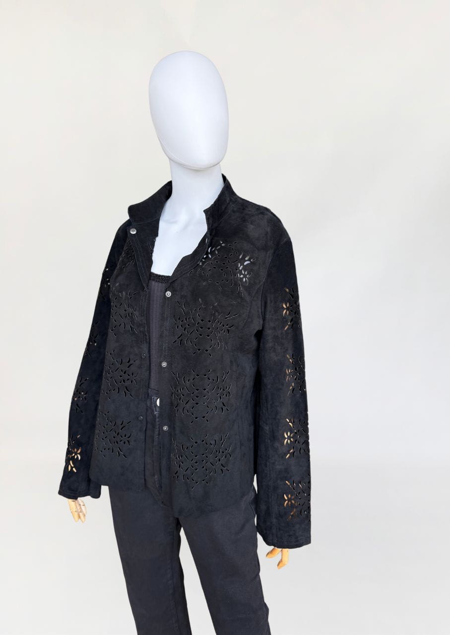Lekka kurtka vintage wykonana z miękkiego naturalnego zamszu w czarnym kolorze. Model o lekko taliowanym fasonie, z długimi rękawami i kołnierzem typu stójka. Powierzchnię materiału zdobią subtelne ażurowe wycięcia, tworzące jednolitą perforację. Front zapinany na metalowe napy. Bez podszewki.