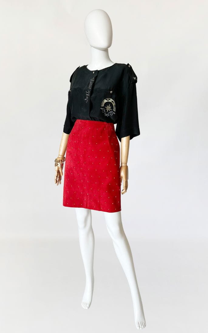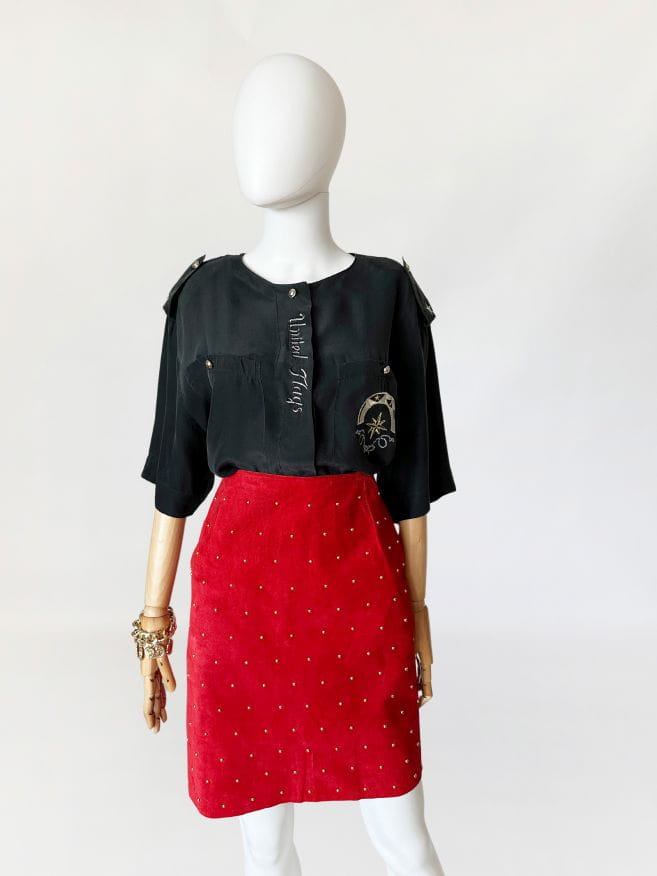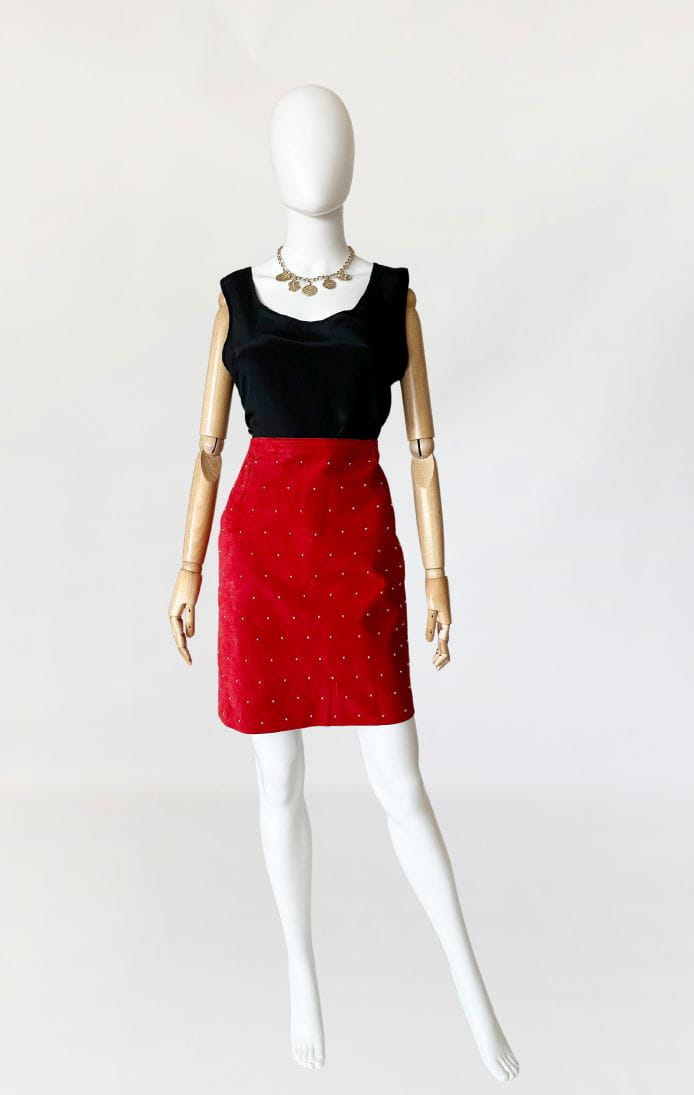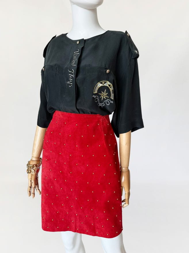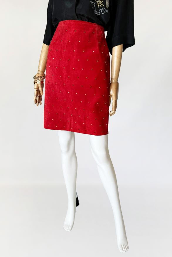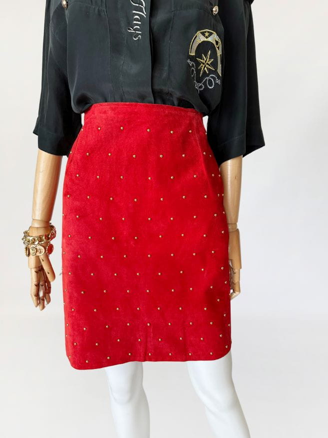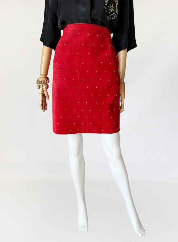 Spódnica vintage wykonana z naturalnej zamszowej skóry w kolorze czerwonym. Na całości nabijana złotymi nitami, które dodają jej rockowego klimatu. Ołówkowy fason z wysokim stanem. Z tyłu u dołu rozporek. Od wewnątrz na podszewce.