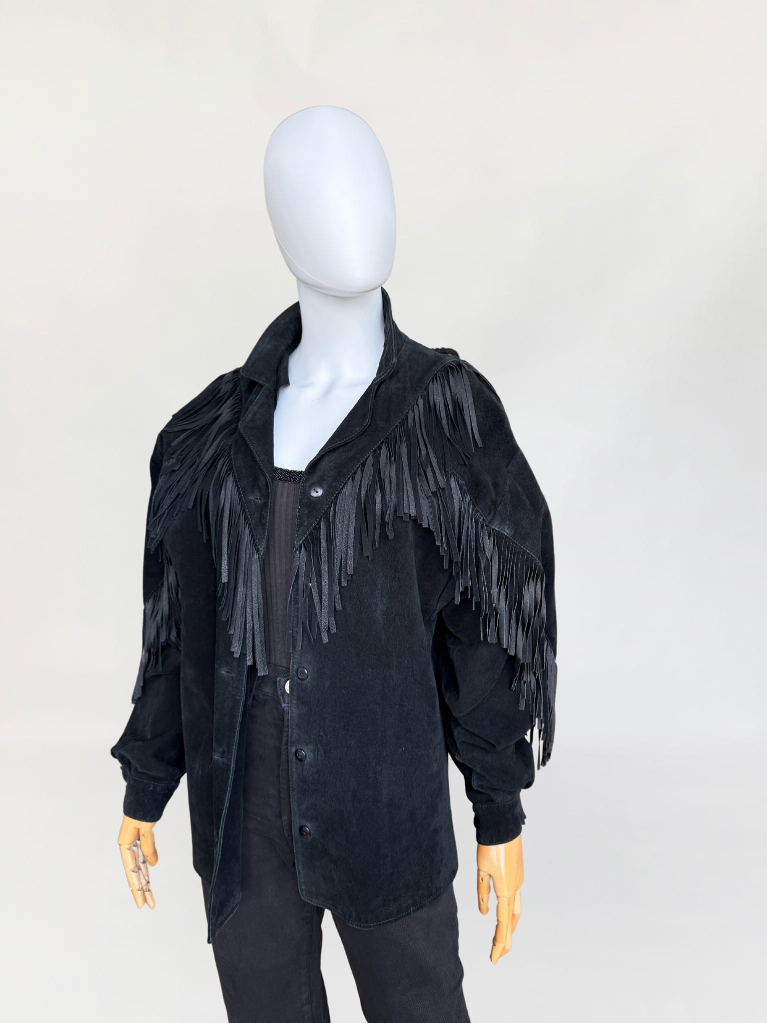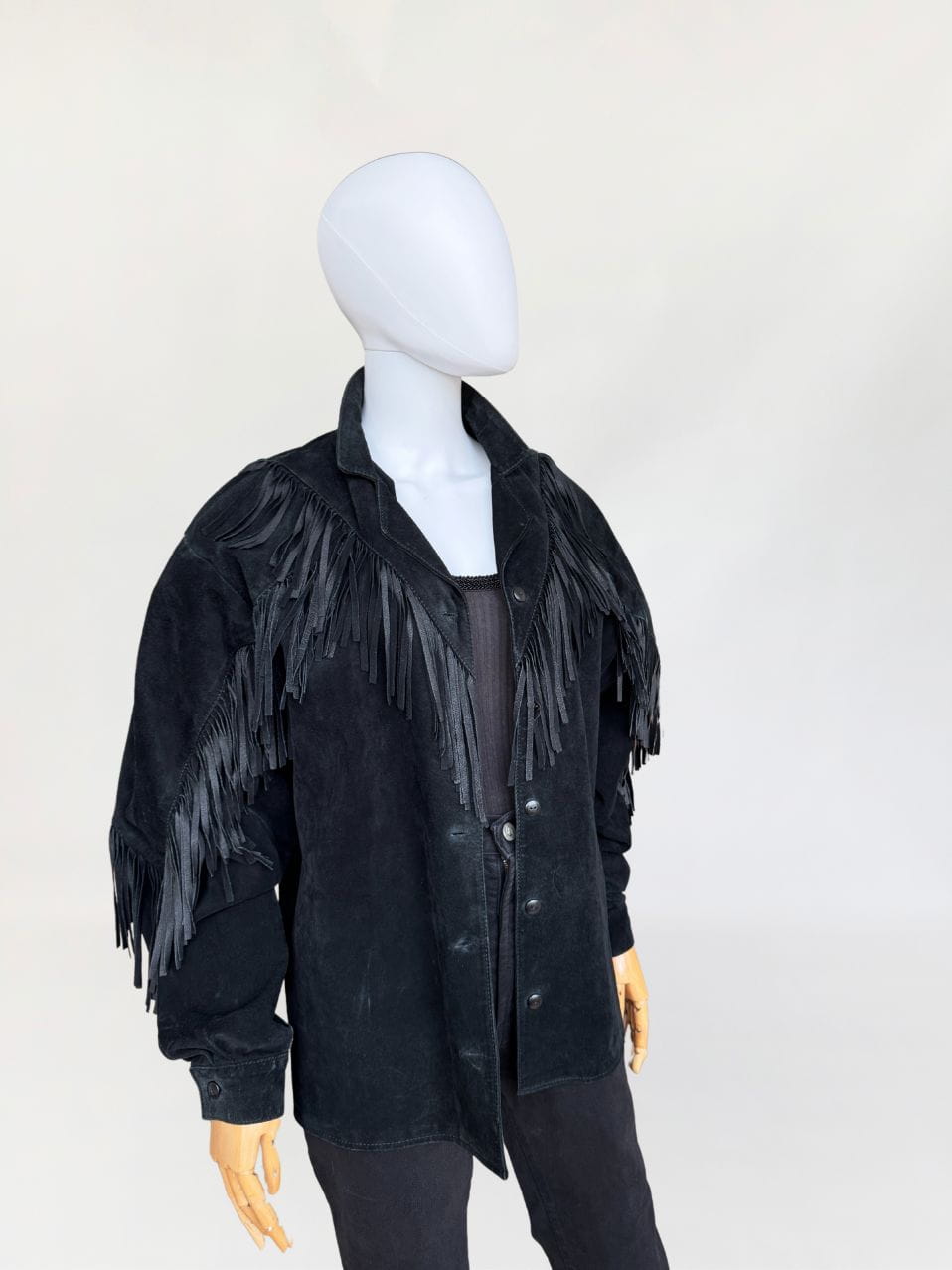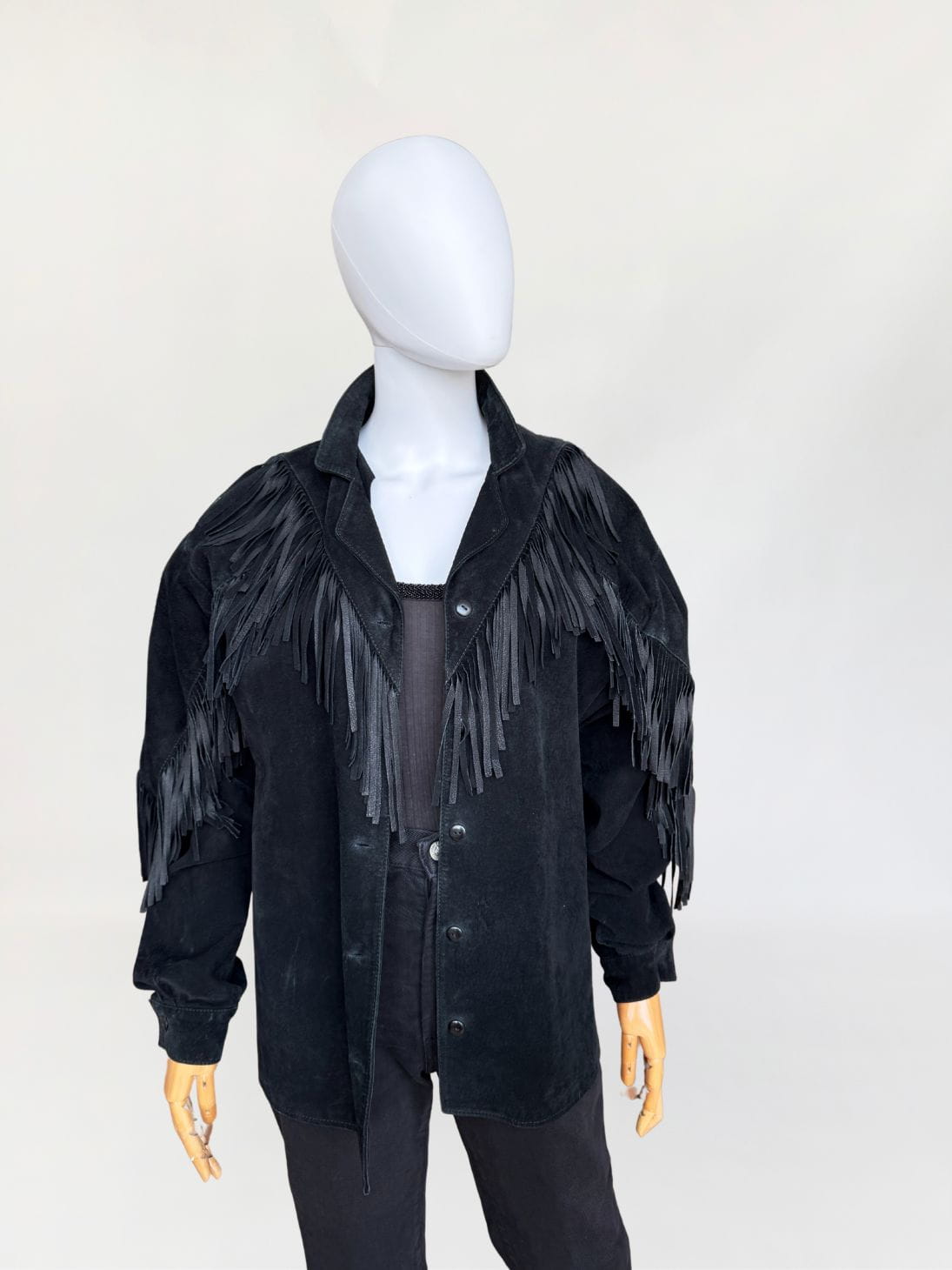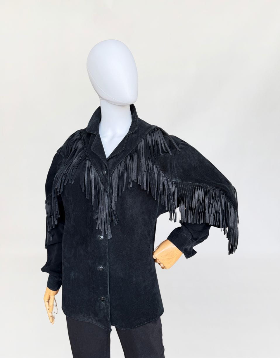 Włoska koszulowa kurtka vintage wykonana z czarnego, naturalnego zamszu. Projekt utrzymany w stylistyce westernowej, z tańczącymi długimi, skórzanymi frędzlami wszytymi na karczku, wzdłuż rękawów oraz linii frontowej. Fason przedłużony, z lekko obniżoną linią pachy i prostą konstrukcją bez podszewki.
