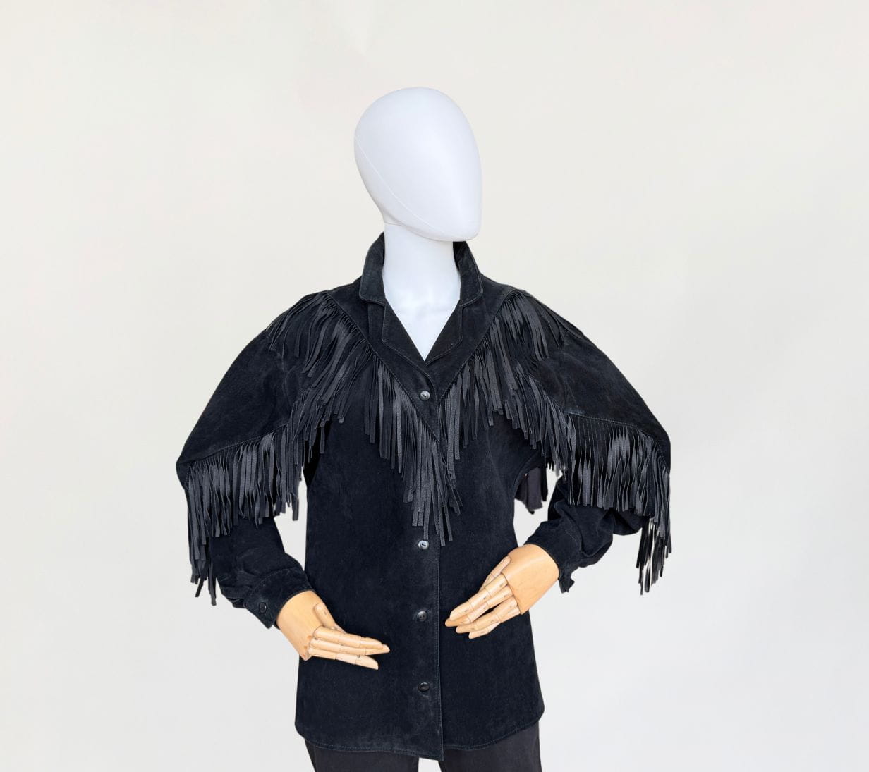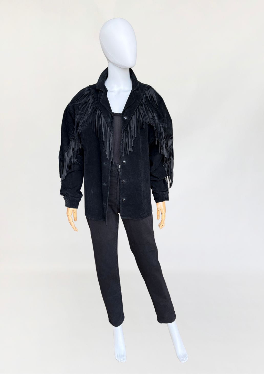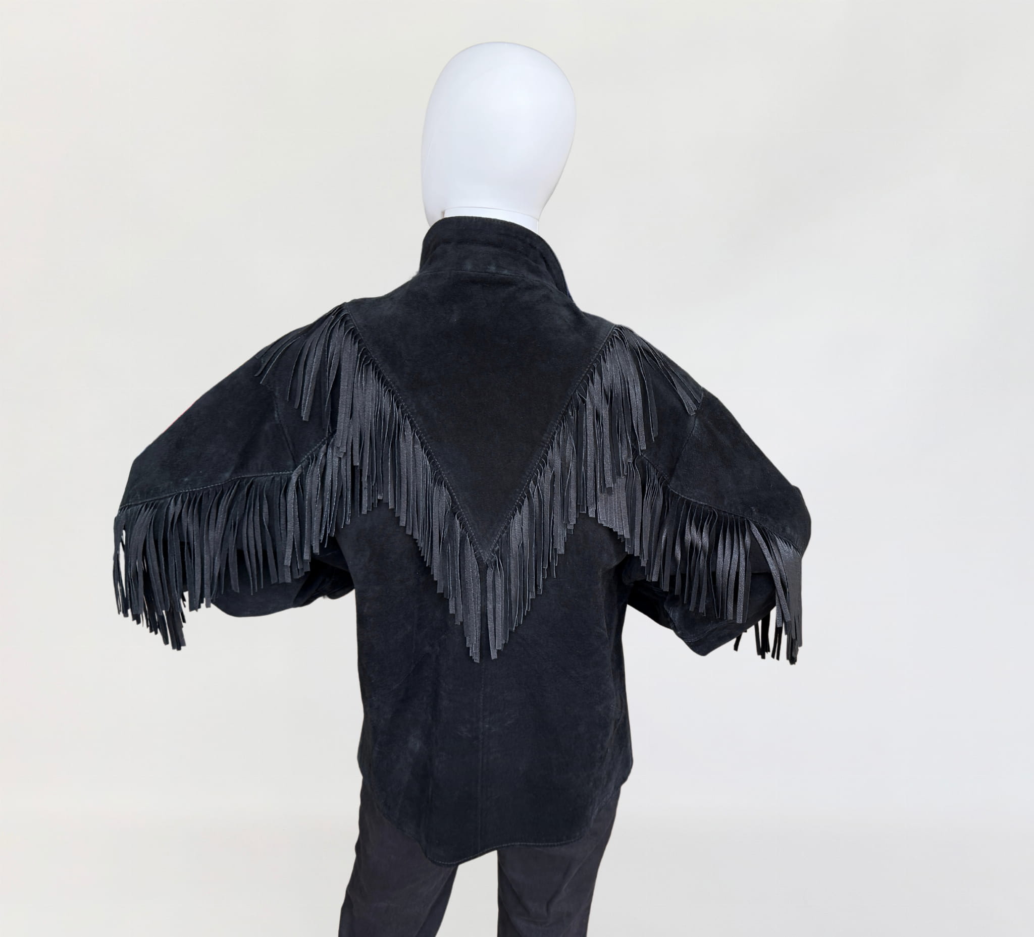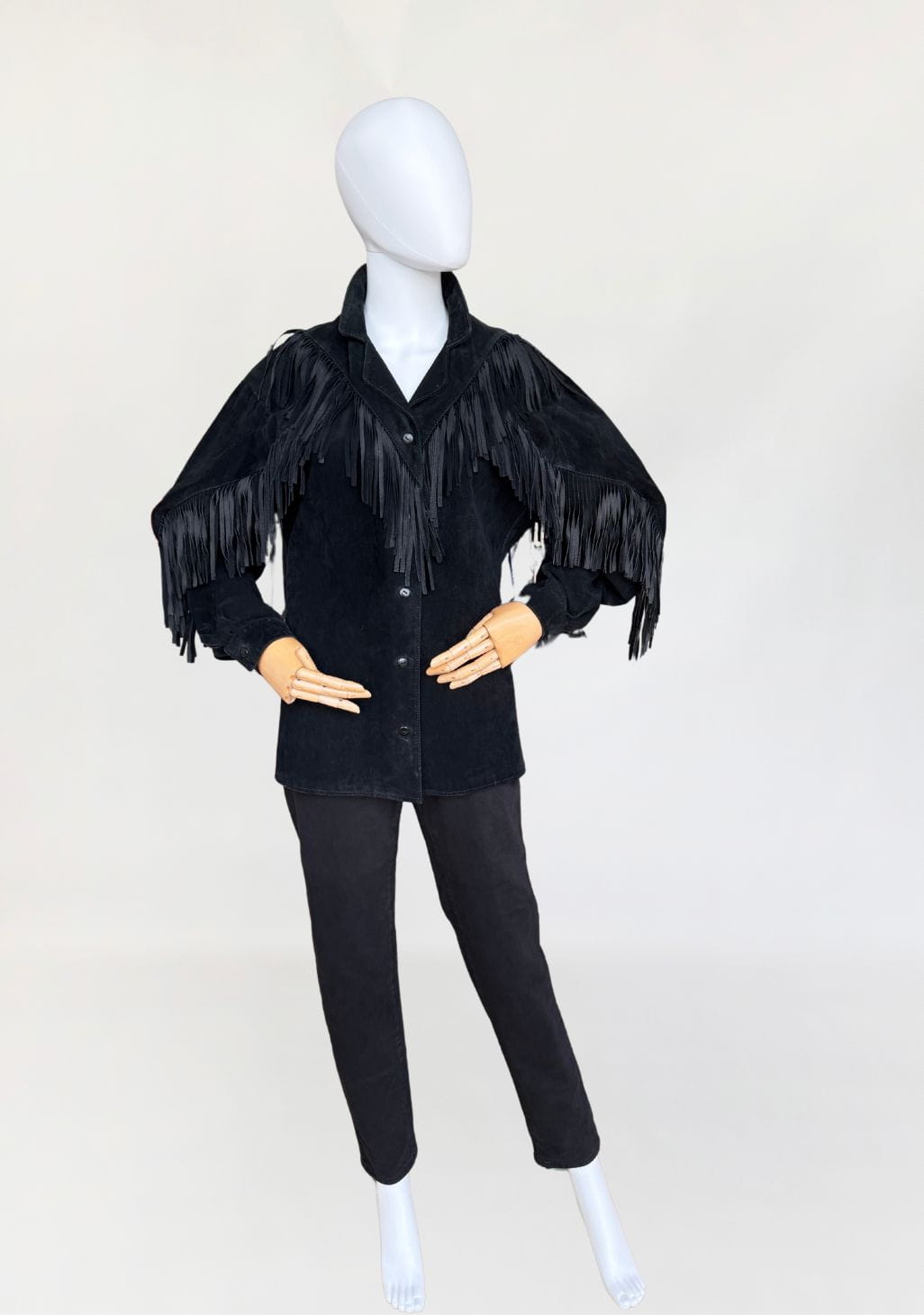 Włoska koszulowa kurtka vintage wykonana z czarnego, naturalnego zamszu. Projekt utrzymany w stylistyce westernowej, z tańczącymi długimi, skórzanymi frędzlami wszytymi na karczku, wzdłuż rękawów oraz linii frontowej. Fason przedłużony, z lekko obniżoną linią pachy i prostą konstrukcją bez podszewki.