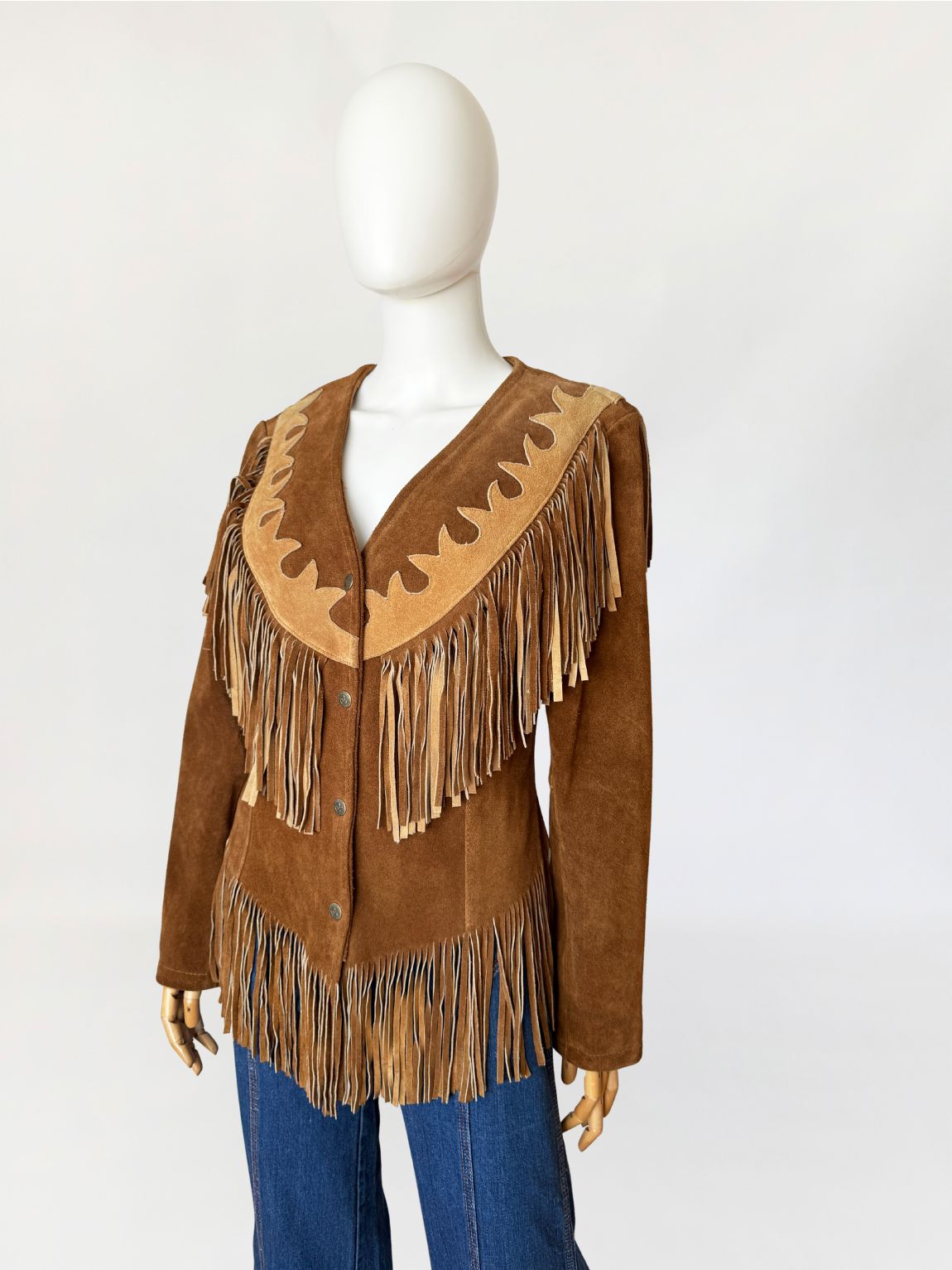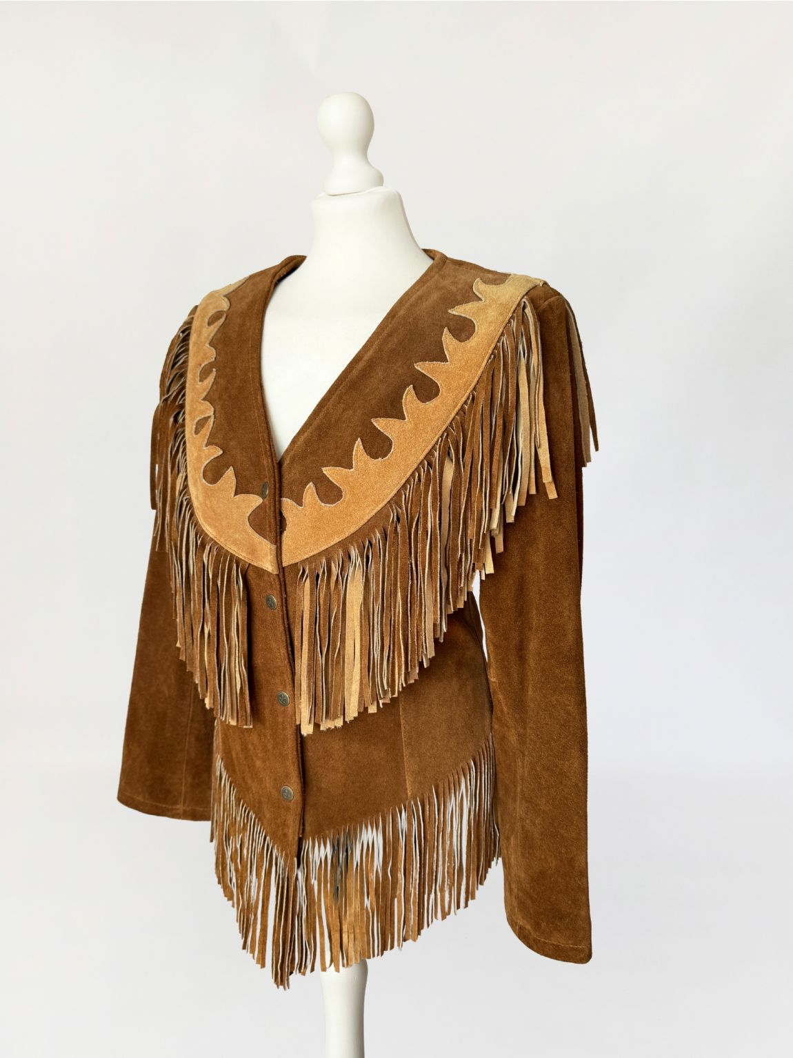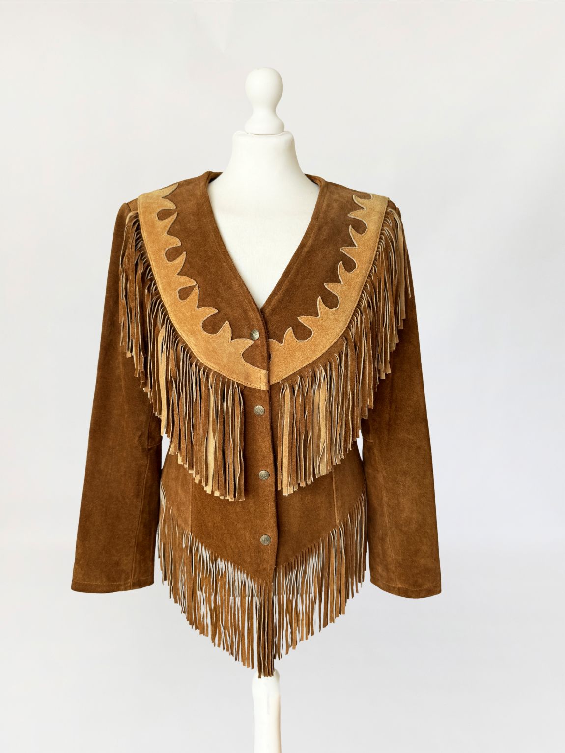 Obłędna, unikatowa kurtka vintage w stylu wild wild west. Wykonana z jakościowego, grubszego zamszu naturalnego w odcieniu koniaku. Fason dopasowany w talii, z długimi rękawami. Charakterystyczne dla westernowej odzieży liczne frędzle umieszczone na piersi, plecach i w dolnej części, które tworzą dynamiczną linię. Karczek wykończony kontrastową aplikacją z jasnego zamszu o dekoracyjnym wycięciu. Zapinana od frontu na metalowe napy.