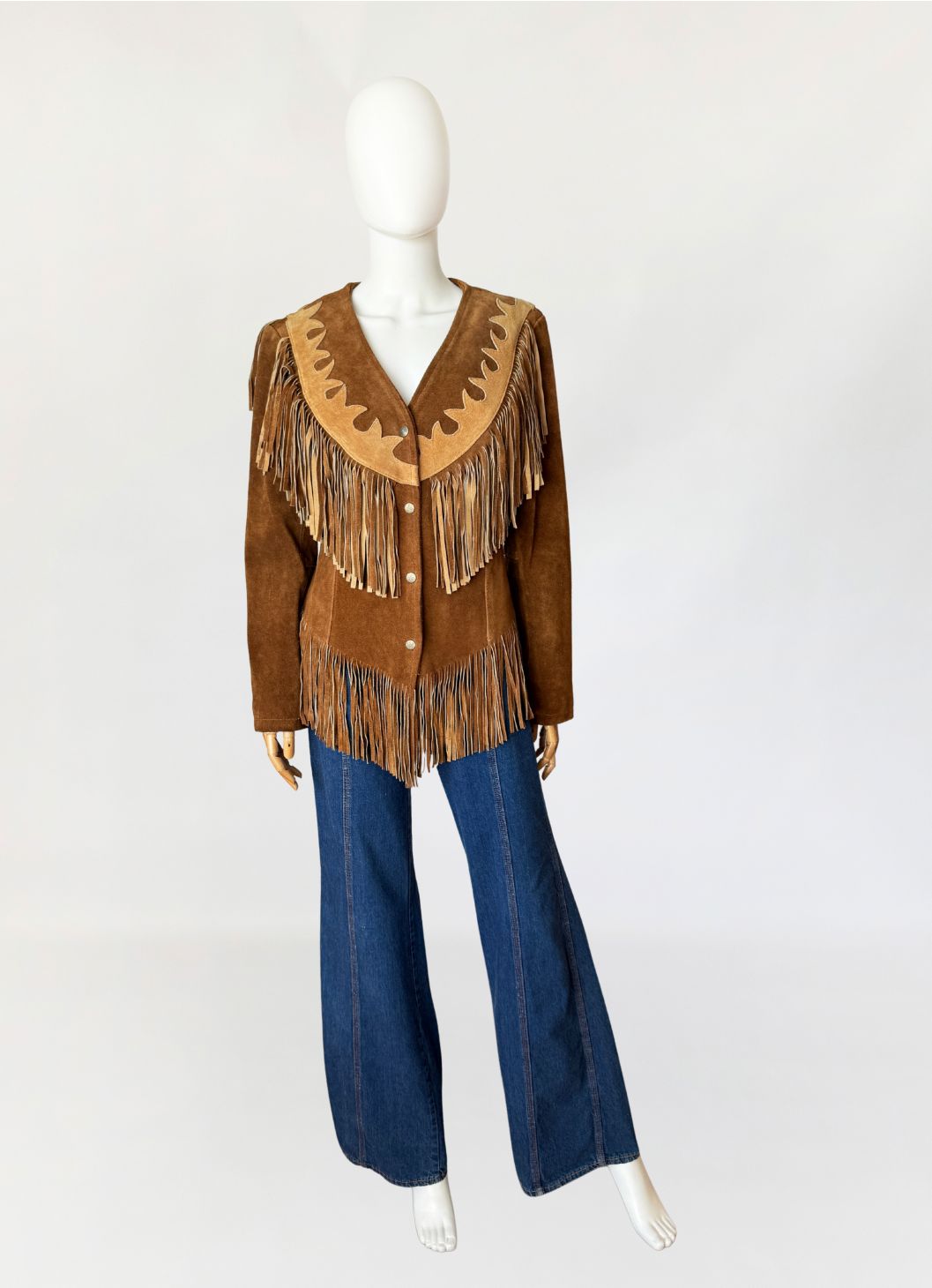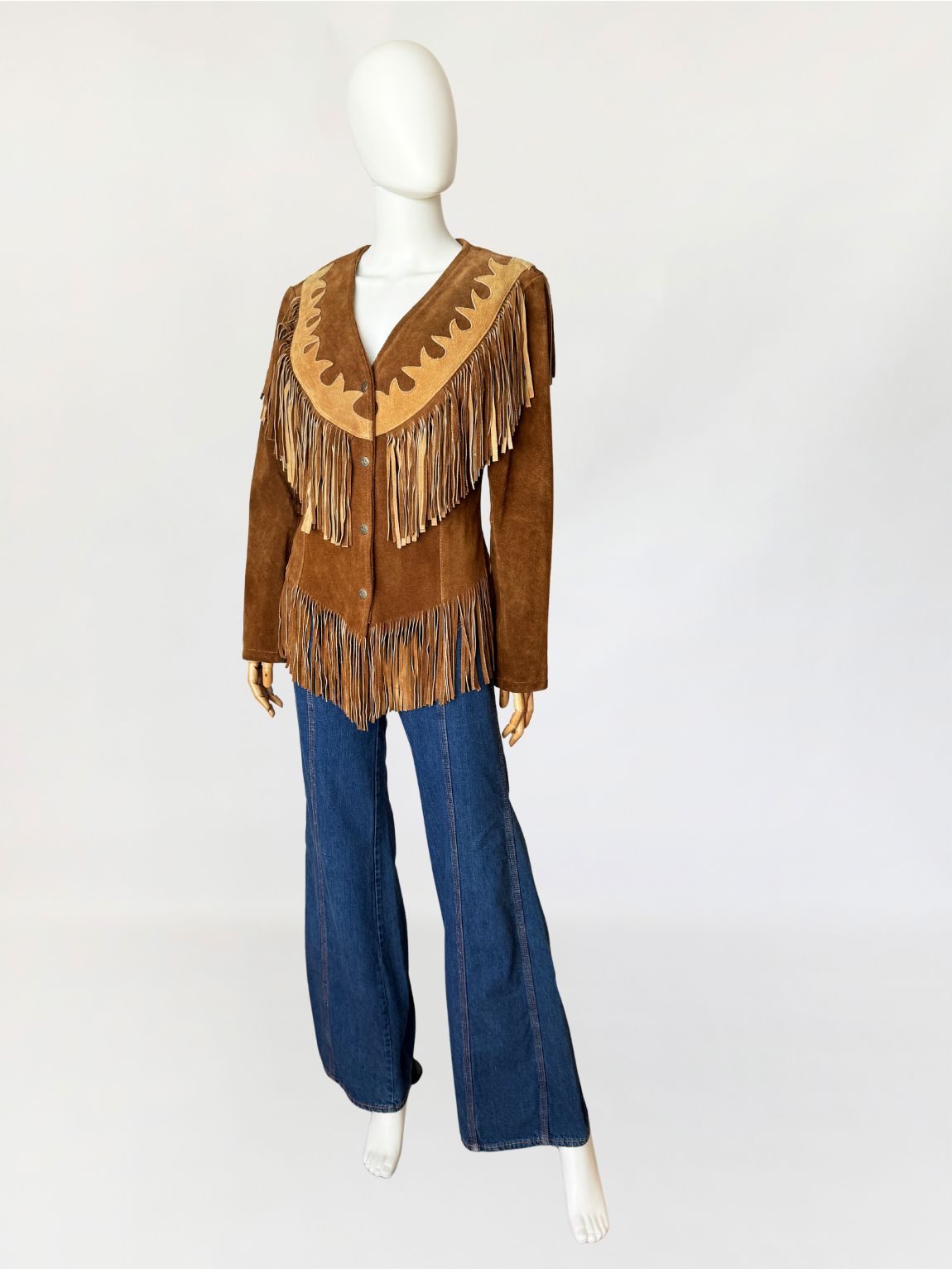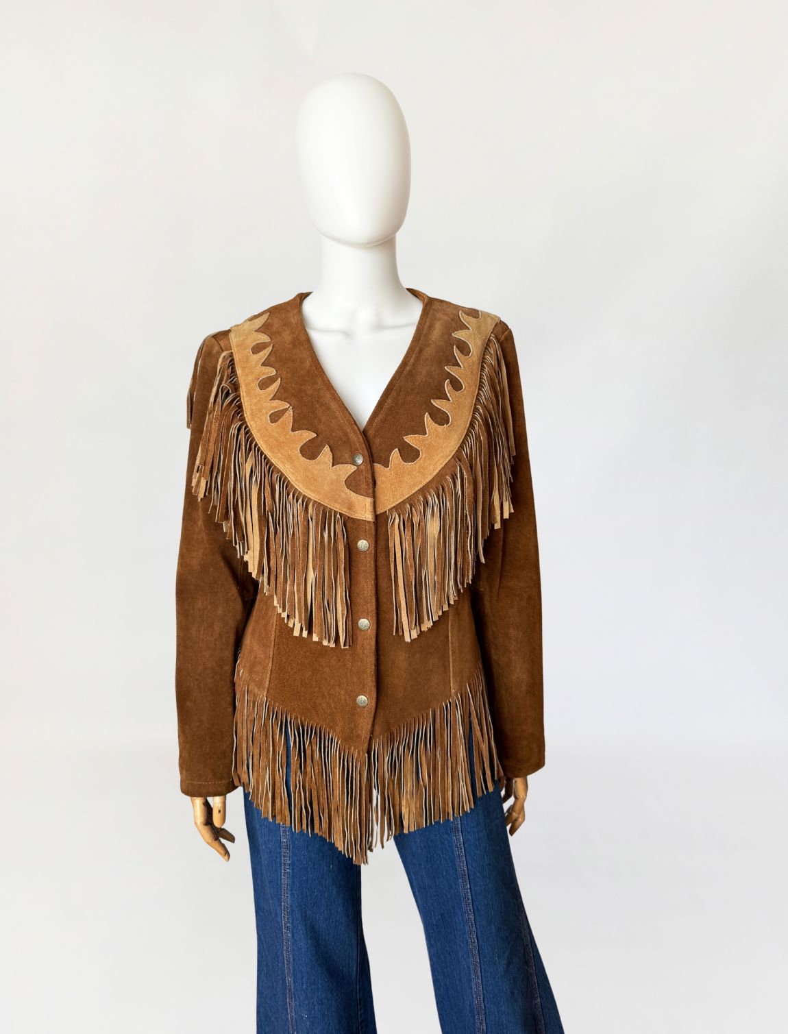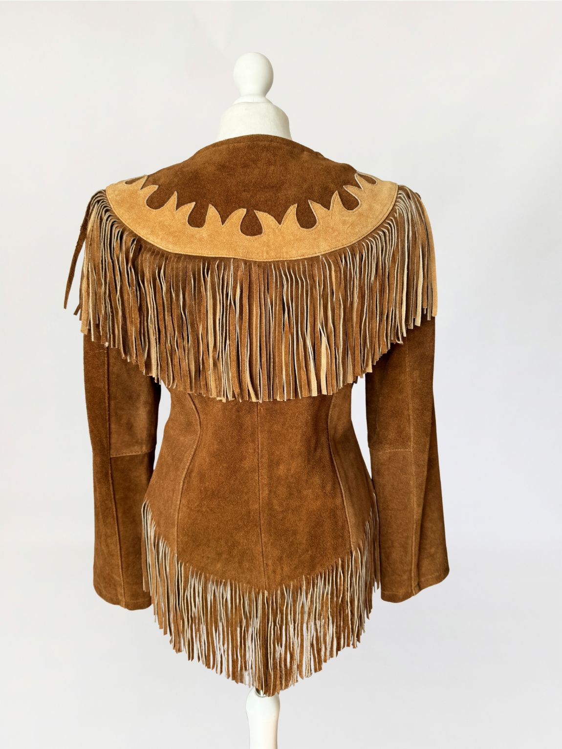 Obłędna, unikatowa kurtka vintage w stylu wild wild west. Wykonana z jakościowego, grubszego zamszu naturalnego w odcieniu koniaku. Fason dopasowany w talii, z długimi rękawami. Charakterystyczne dla westernowej odzieży liczne frędzle umieszczone na piersi, plecach i w dolnej części, które tworzą dynamiczną linię. Karczek wykończony kontrastową aplikacją z jasnego zamszu o dekoracyjnym wycięciu. Zapinana od frontu na metalowe napy.