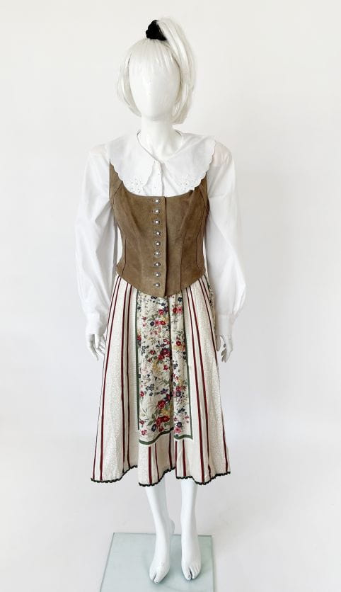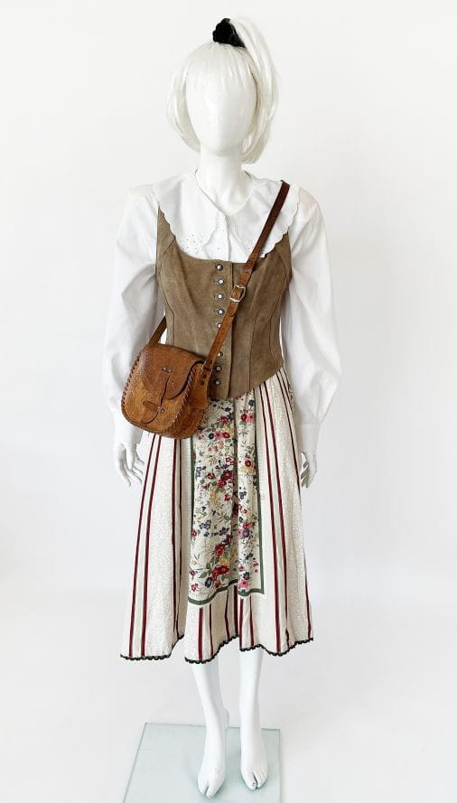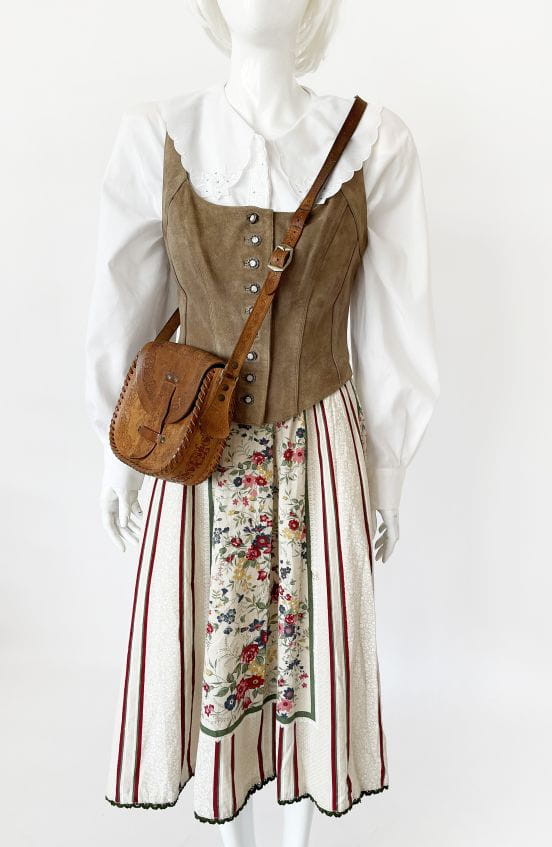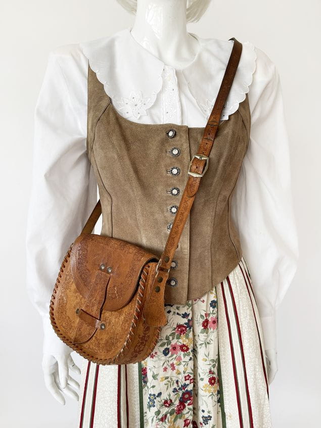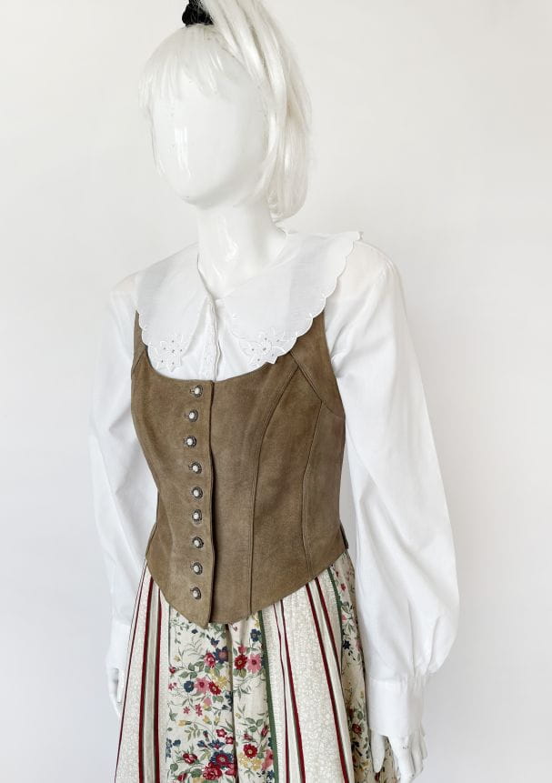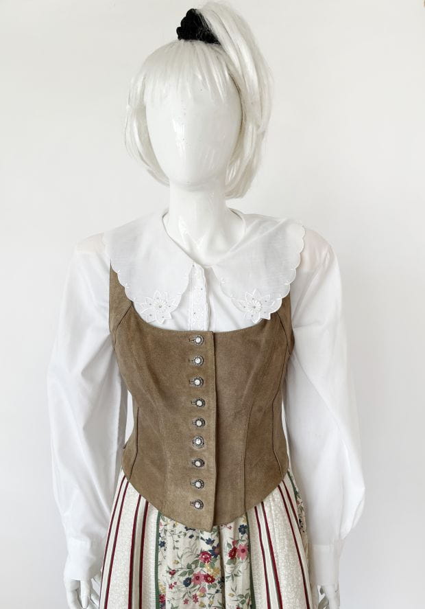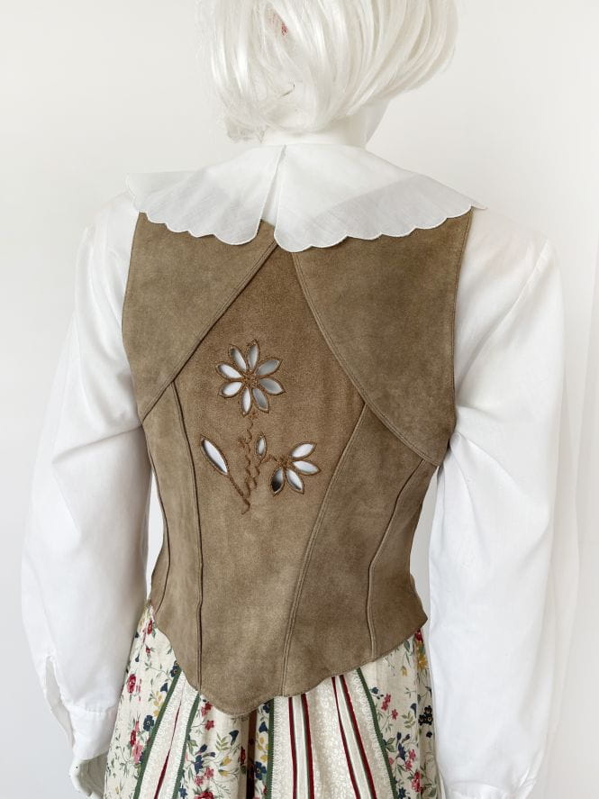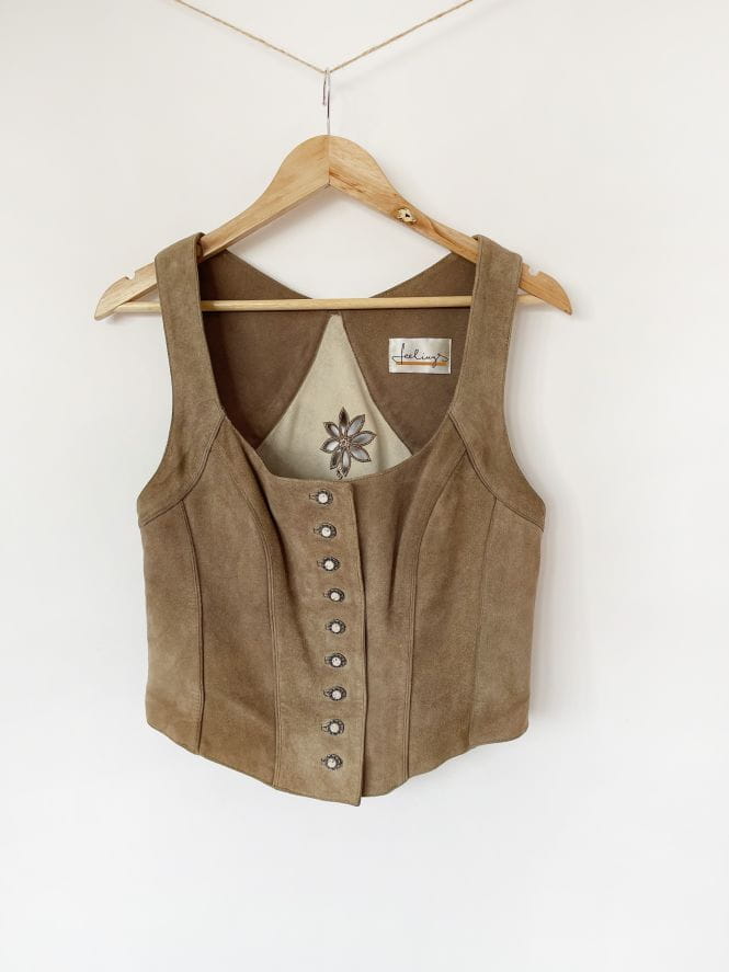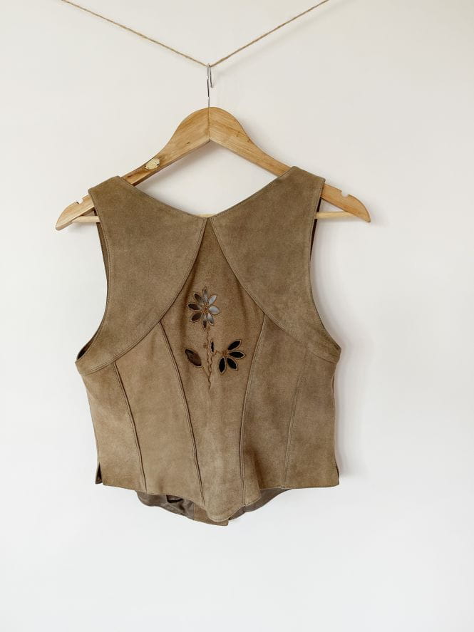 Zamszowy serdak vintage. Rozpinany model na szerokich ramiączkach. Na plecach ażurowe aplikacje.