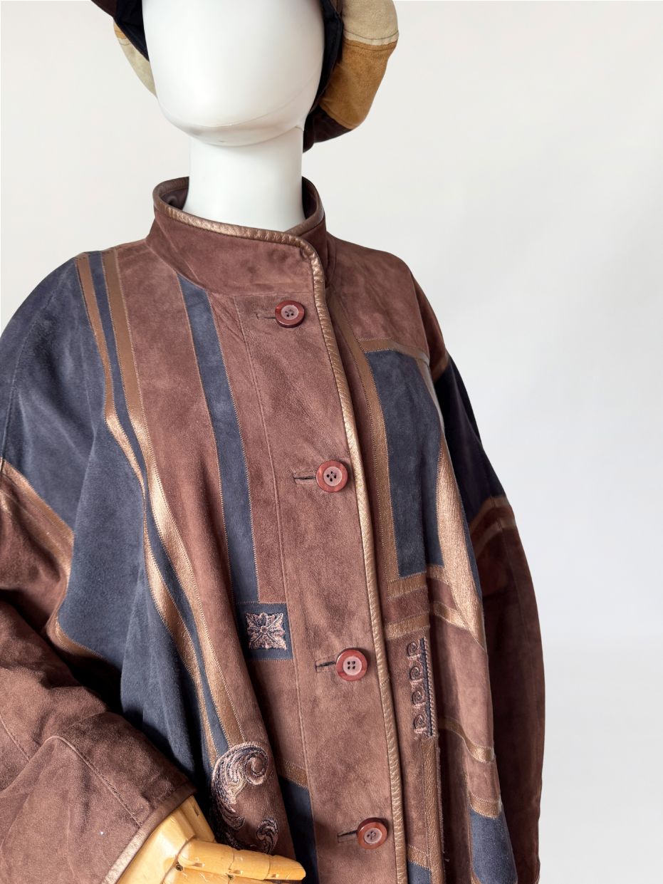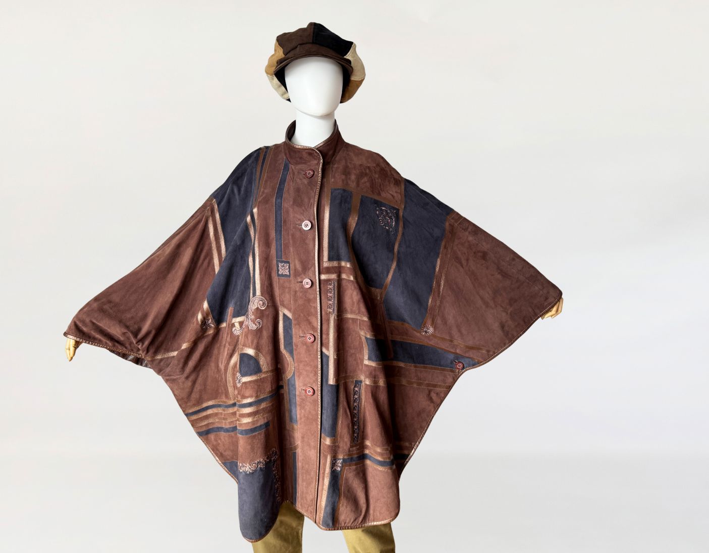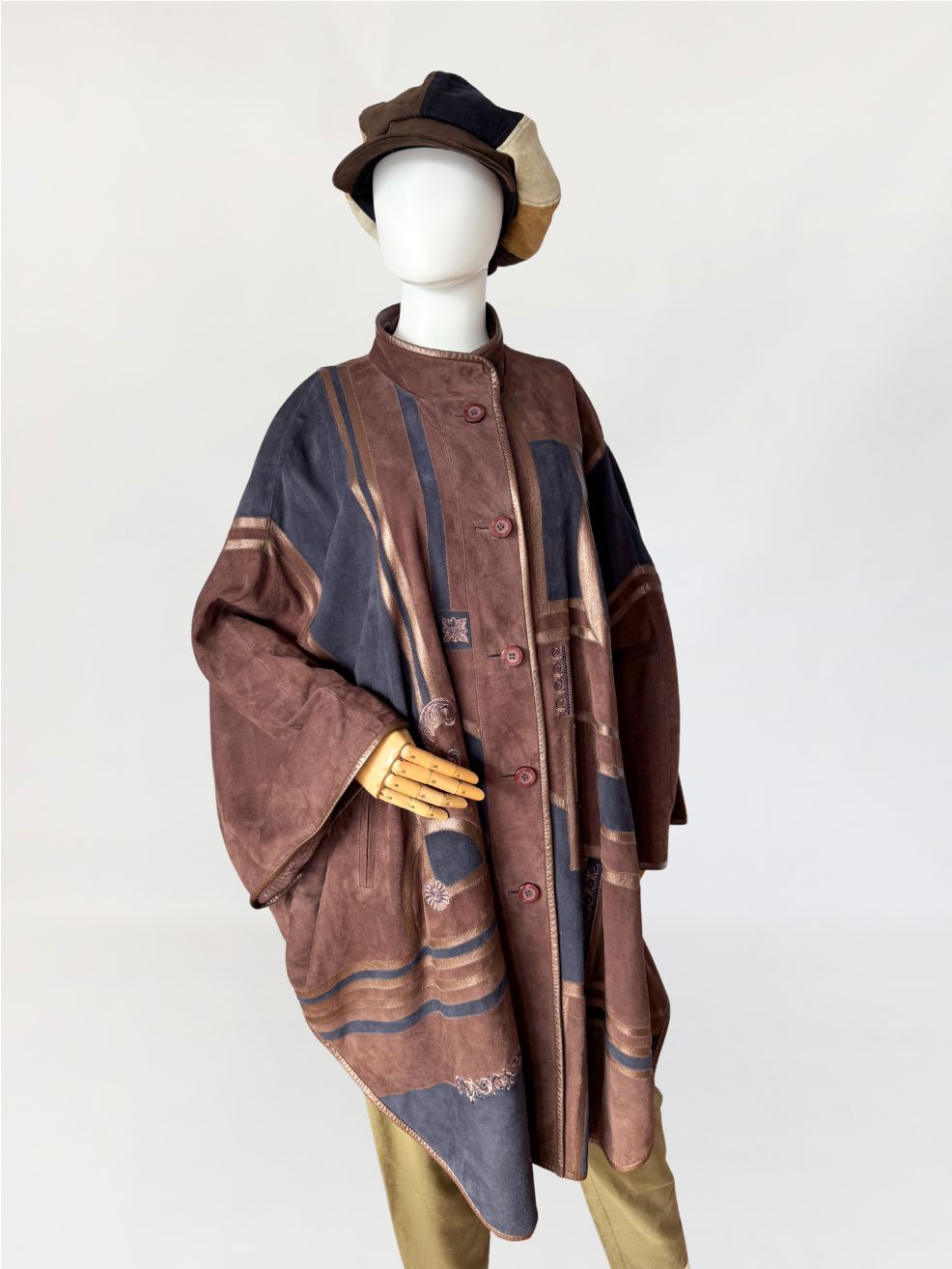 Fenomenalna peleryna vintage z lat 80-tych niemieckiej marki Zaspel. Wykonana z miękkiej naturalnej skóry zamszowej, ze wstawkami ze skóry licowej. Patchworkowy deseń w odcieniach brązu, granatu, miedzi, zdobiona haftowanymi aplikacjami. Mocno rozłożysty fason z niedużym kołnierzem. Po bokach, w dolnej części nieduże kiszenie. Od wewnątrz na logowanej podszewce.