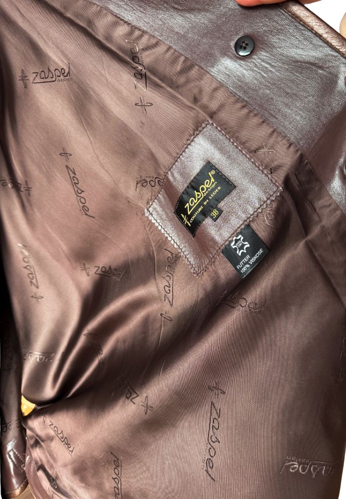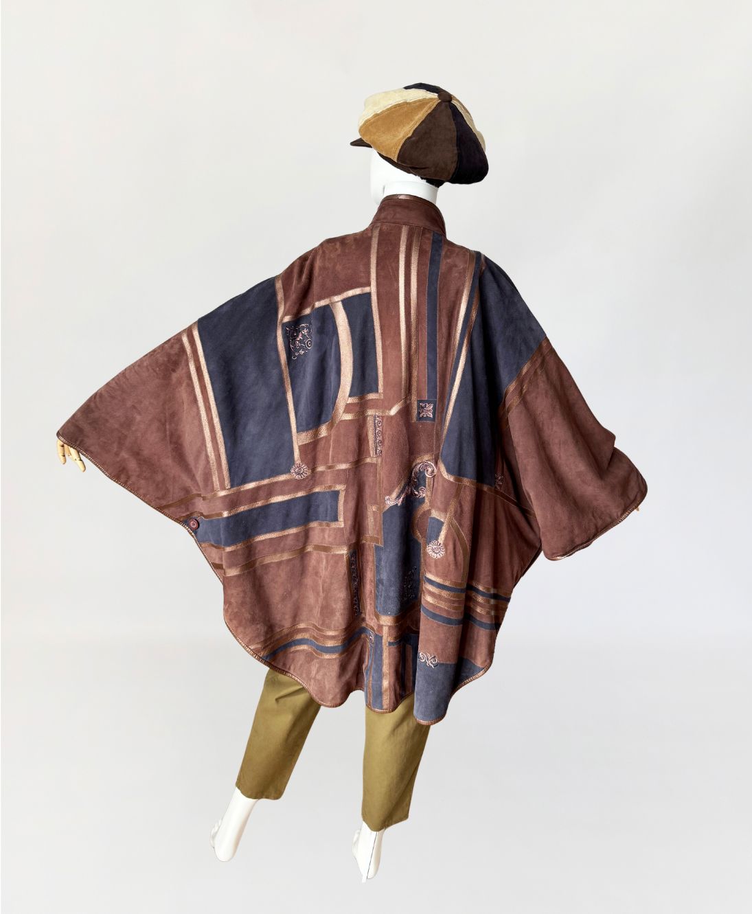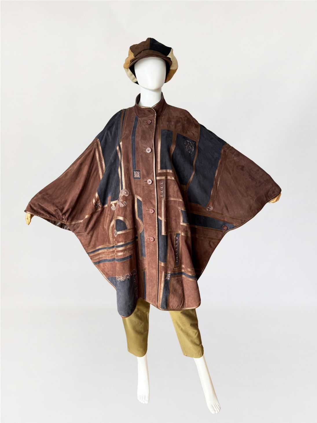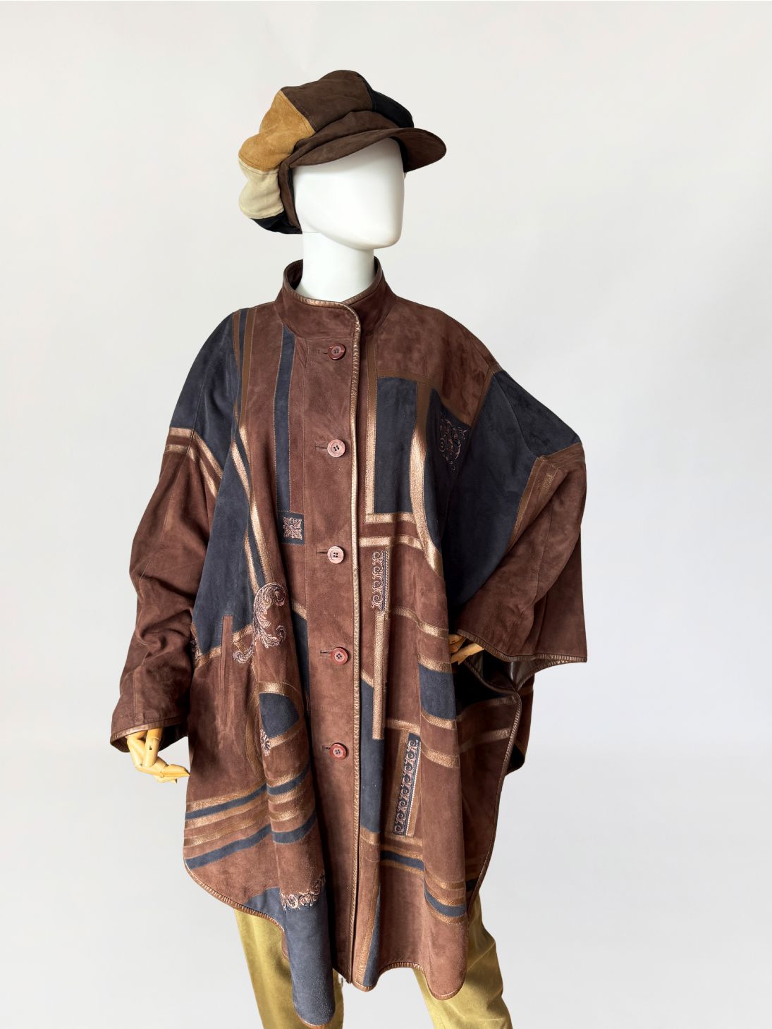Fenomenalna peleryna vintage z lat 80-tych niemieckiej marki Zaspel. Wykonana z miękkiej naturalnej skóry zamszowej, ze wstawkami ze skóry licowej. Patchworkowy deseń w odcieniach brązu, granatu, miedzi, zdobiona haftowanymi aplikacjami. Mocno rozłożysty fason z niedużym kołnierzem. Po bokach, w dolnej części nieduże kiszenie. Od wewnątrz na logowanej podszewce.