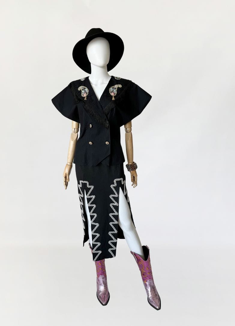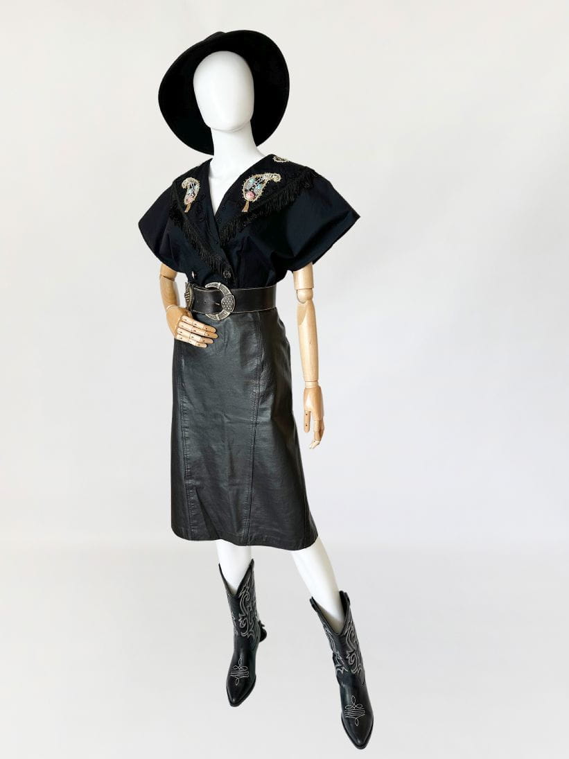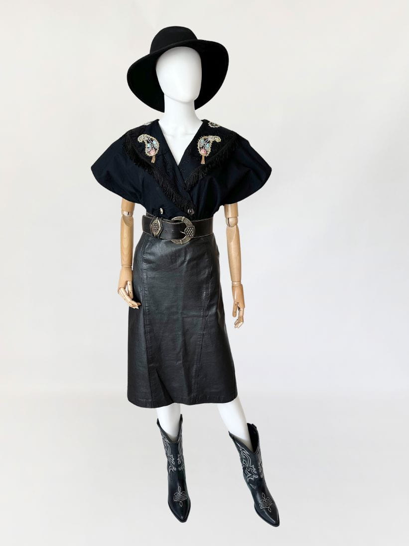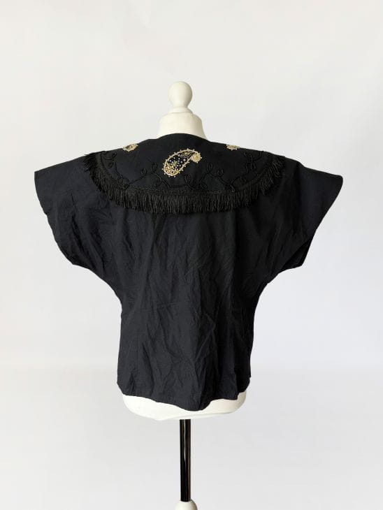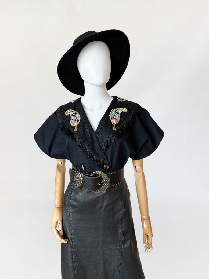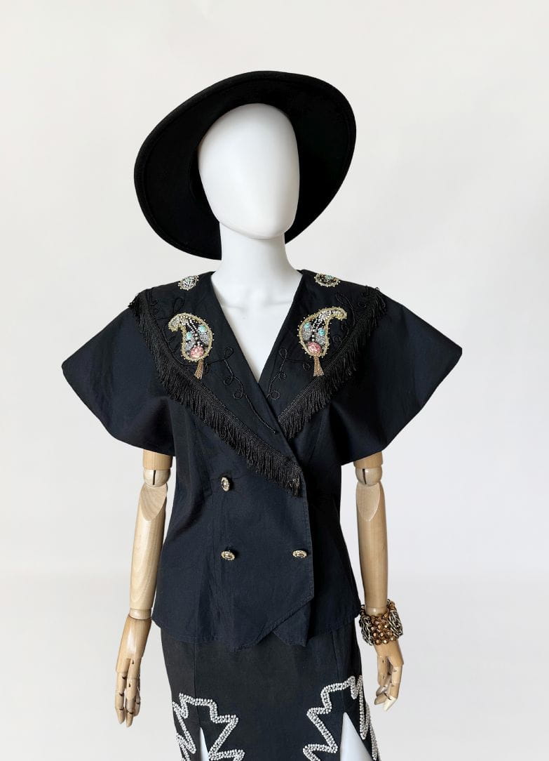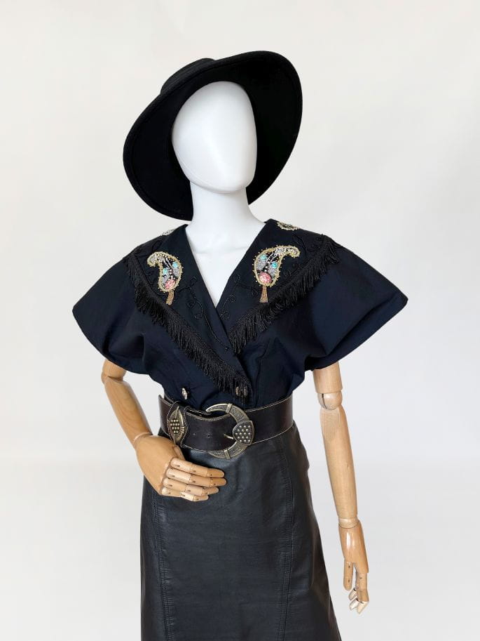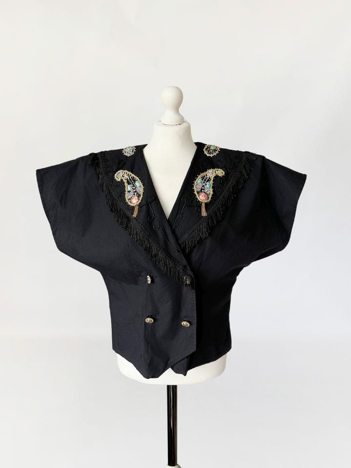 Włoska koszula vintage z lat 80-tych ze zdobieniami w estradowym stylu. Duży kołnierz wysadzany kolorowymi kamieniami, koralikami i złotymi łańcuszkami układającymi się na wzór paisley. Na całości regularne wykończenia z frędzli. Prosty fason z lekko obniżoną linia pach. Krótkie rękawy, w ramionach poduszki. Dwurzędowe zapięcie na biżuteryjne guziki.
