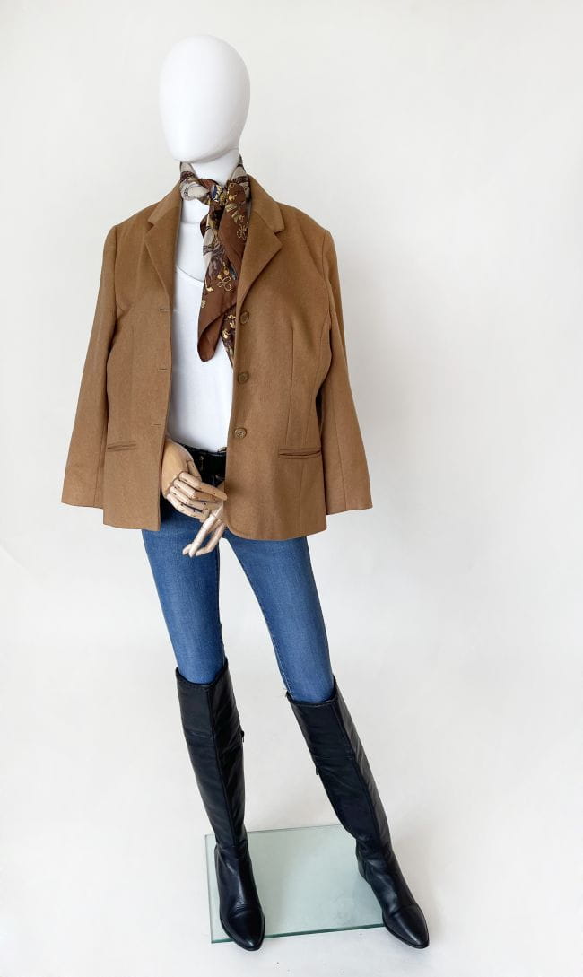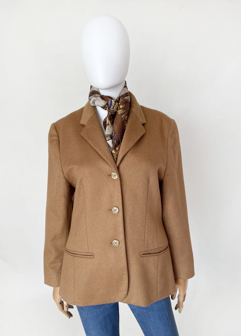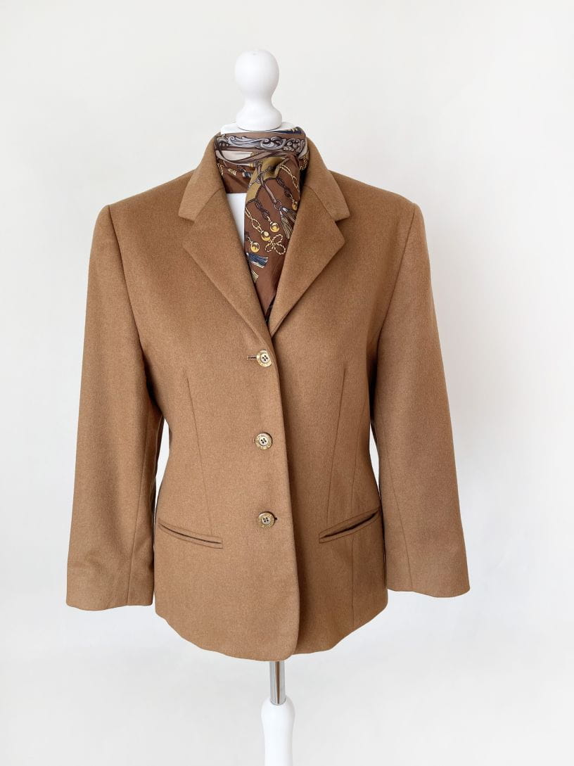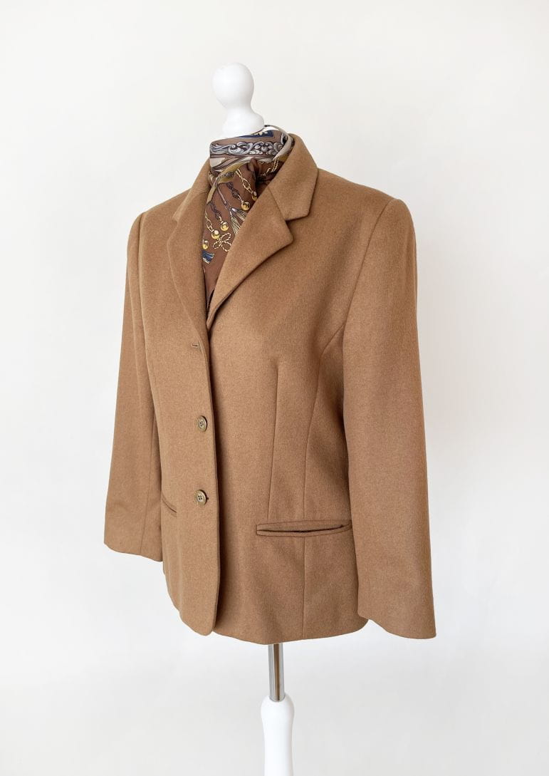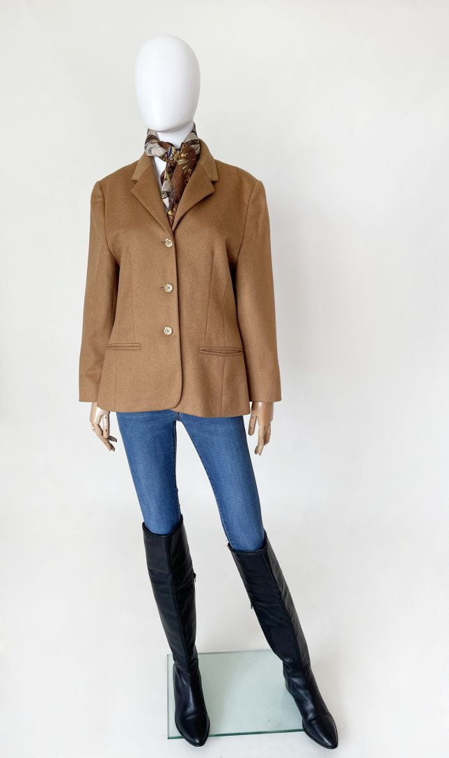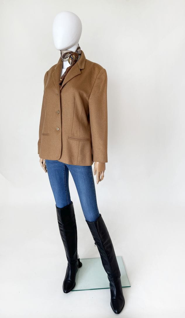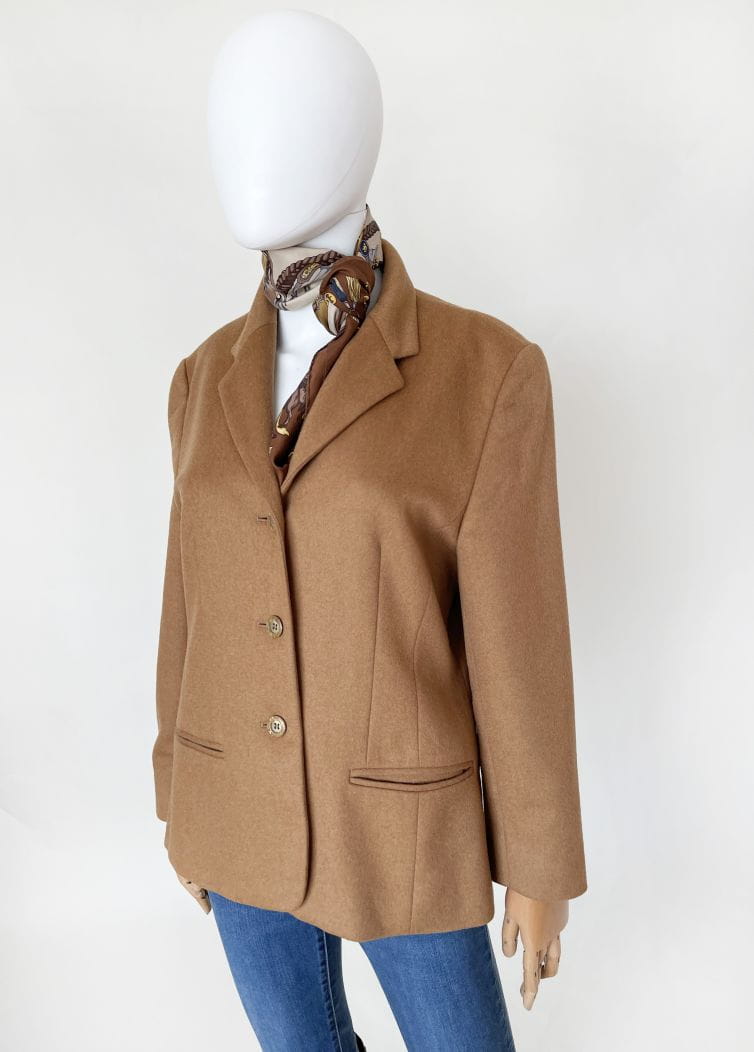 Wspaniała rzecz na lata. Marynarka projektu marki Casa Cashmere, wykonana w całości z kaszmiru - najszlachetniejszej z wełen. Przepiękny camelowy odcień wełny, klasyczny fason z kołnierzem.